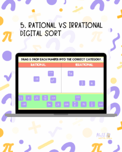 One of my favorites for this lesson is a Rational vs. Irrational sort. Students drag examples into the correct category and turn it in via your LMS. I don’t grade this — it’s just for me to see who might need reteaching.