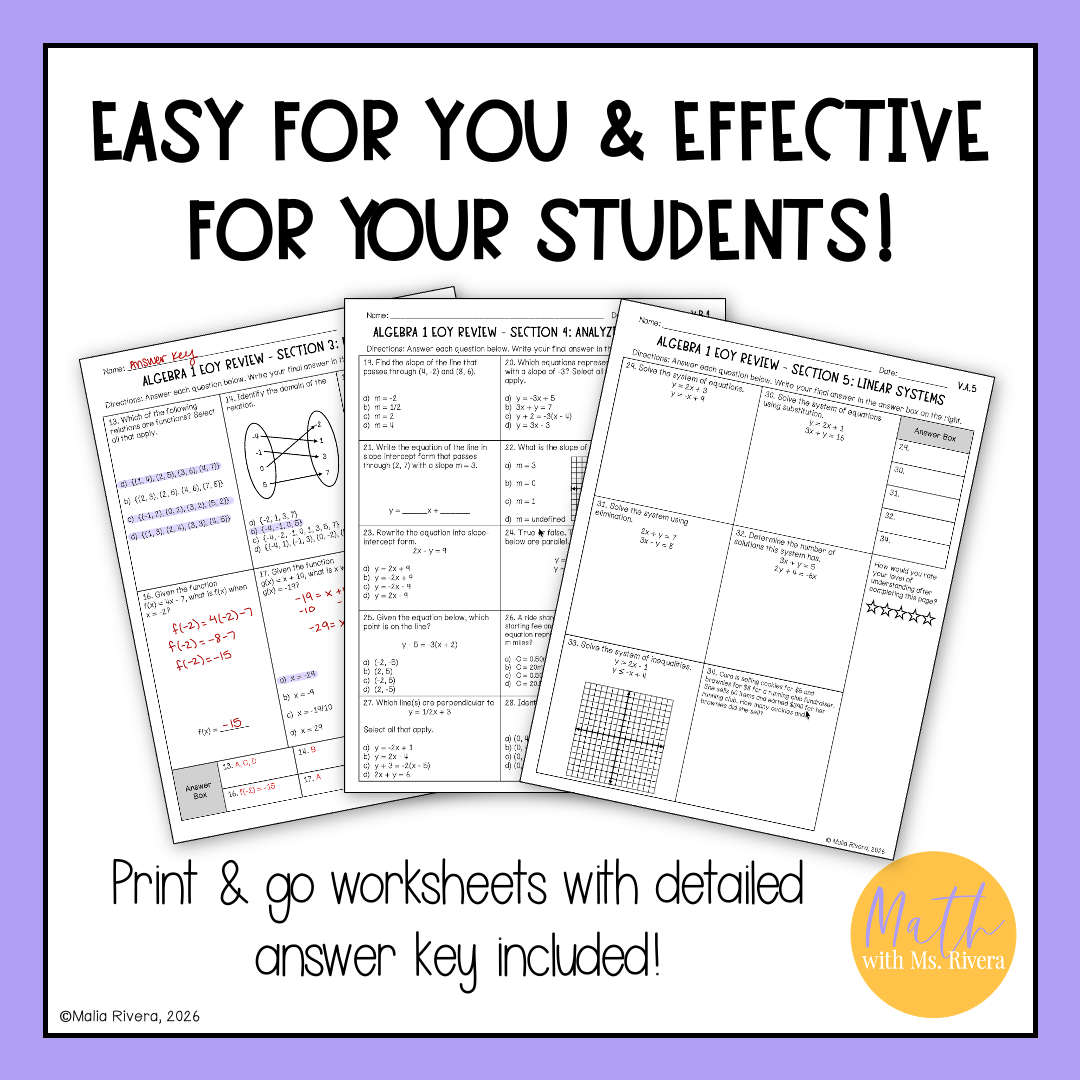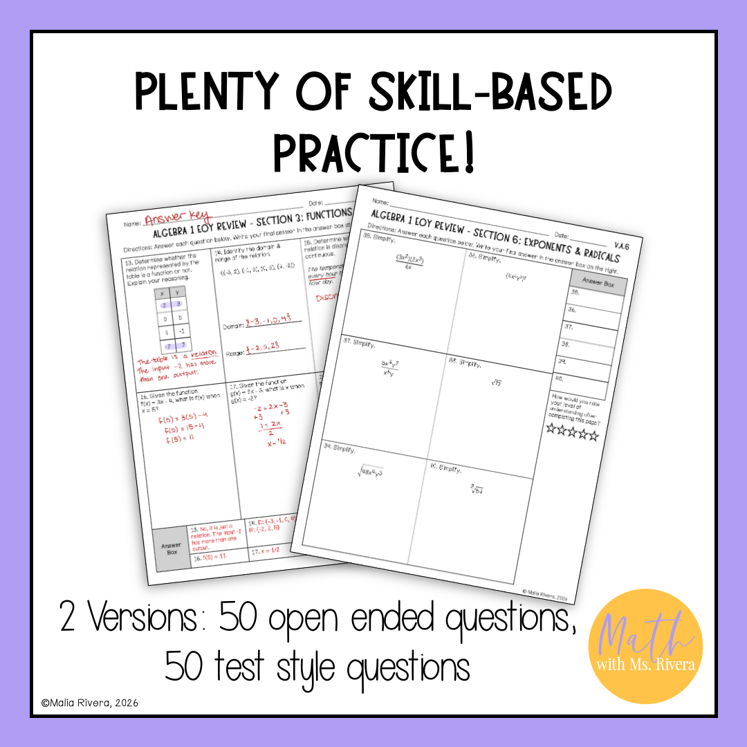 Each version has 50 thoughtfully designed problems across 8 sections that reinforce key Algebra skills, helping students be accountable for what they learned throughout the year.