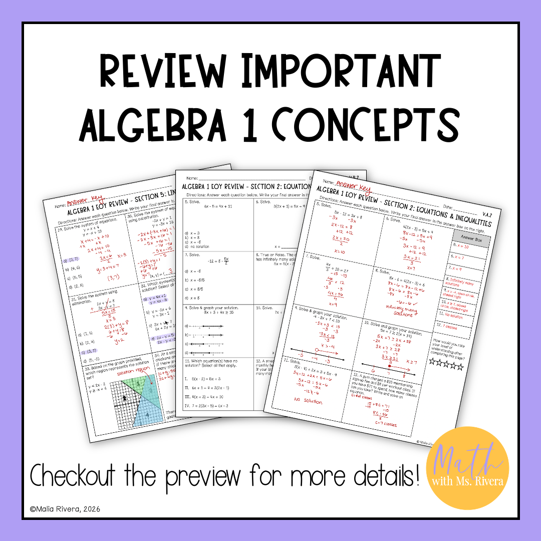 Need an easy way to help your Algebra 1 students review for the end of year final exam or state test? This Algebra 1 Test Prep Review Packet includes 100 questions and 2 versions that cover essential Algebra 1 concepts without the overwhelm!