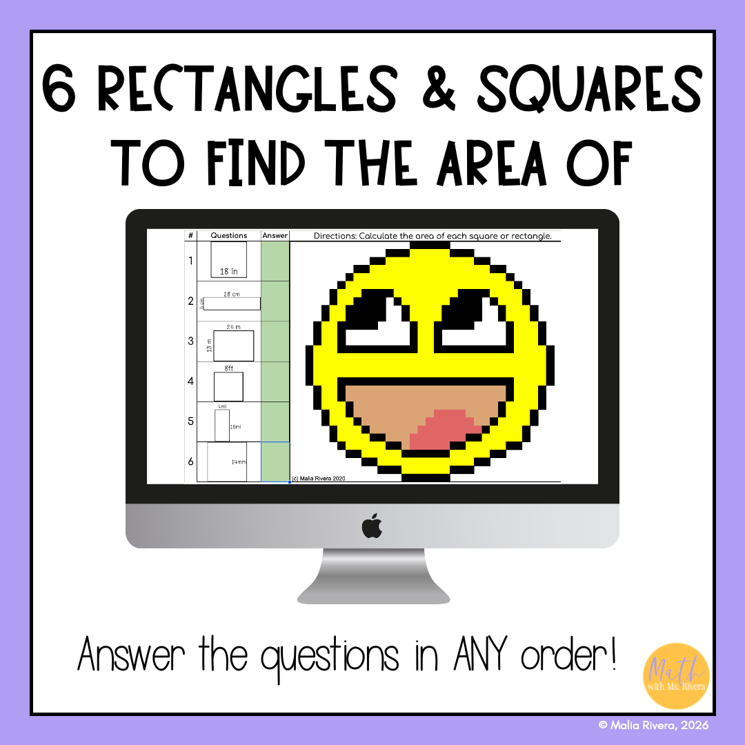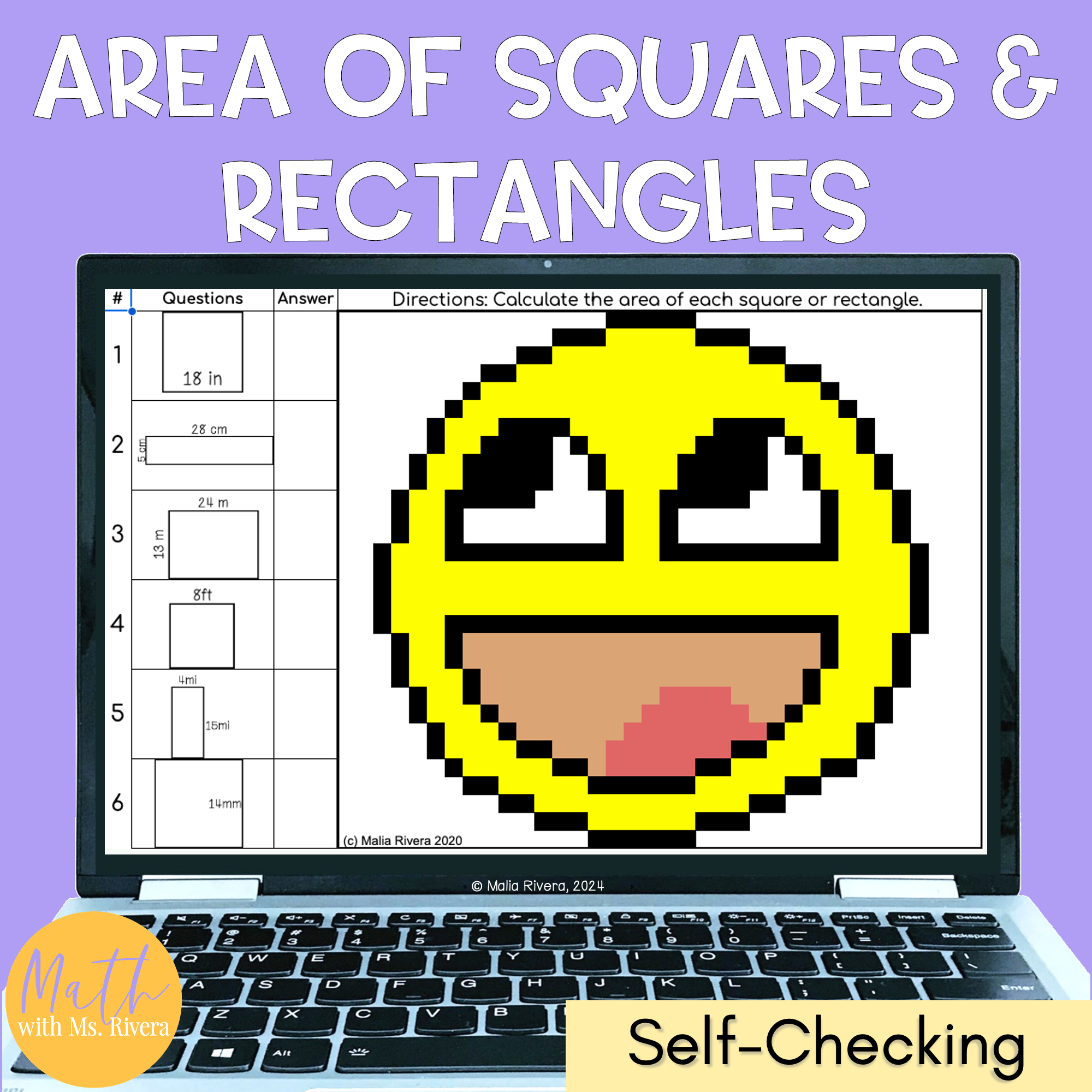 Help your 6th grade students practice finding the area of squares and rectangles with this self-checking digital pixel art activity. Students calculate area using the formulas for squares and rectangles while solving problems where they are given one side of a square or the length and width of a rectangle.