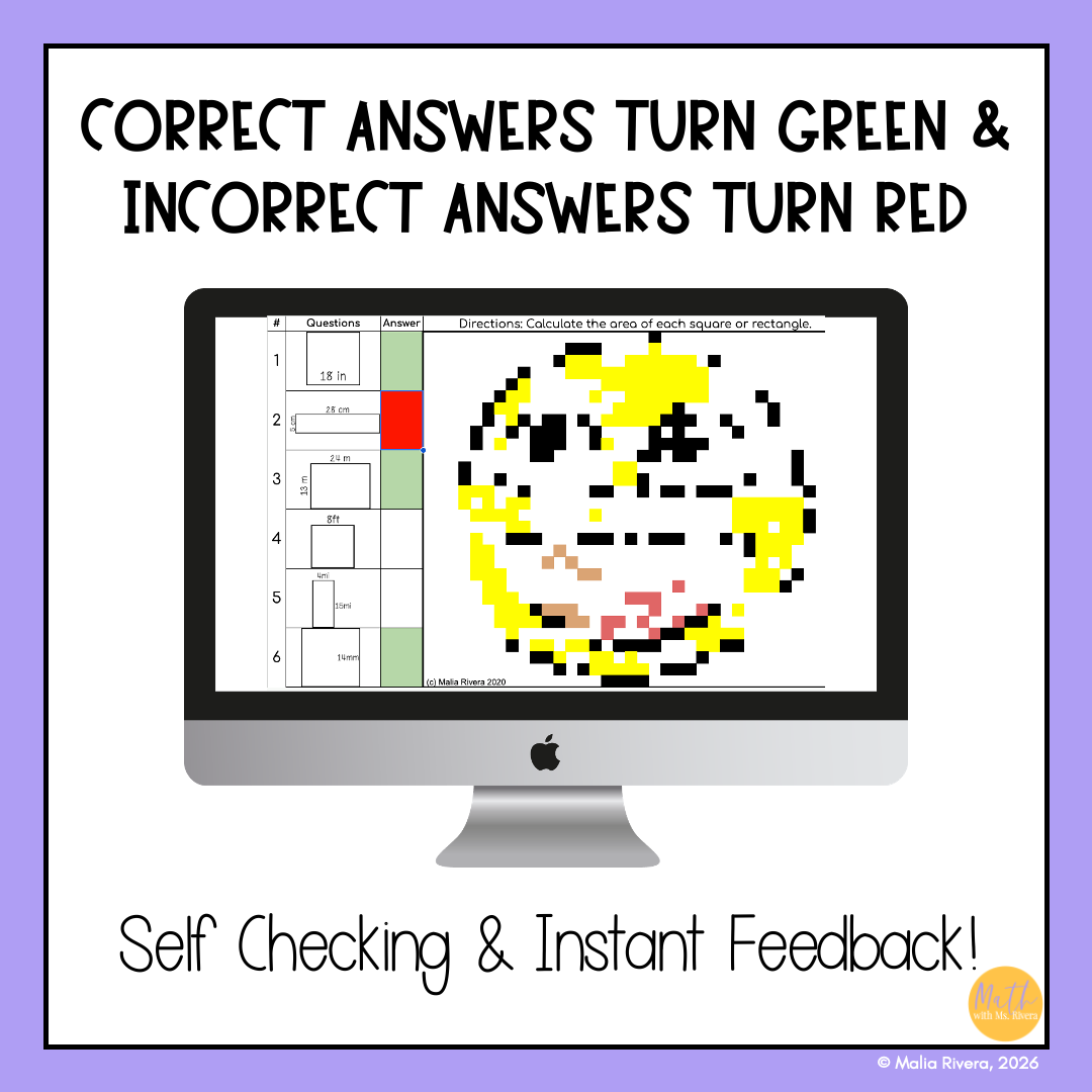 Finding Area of Squares and Rectangles Pixel Art Digital Self Checking Activity for 6th Grade