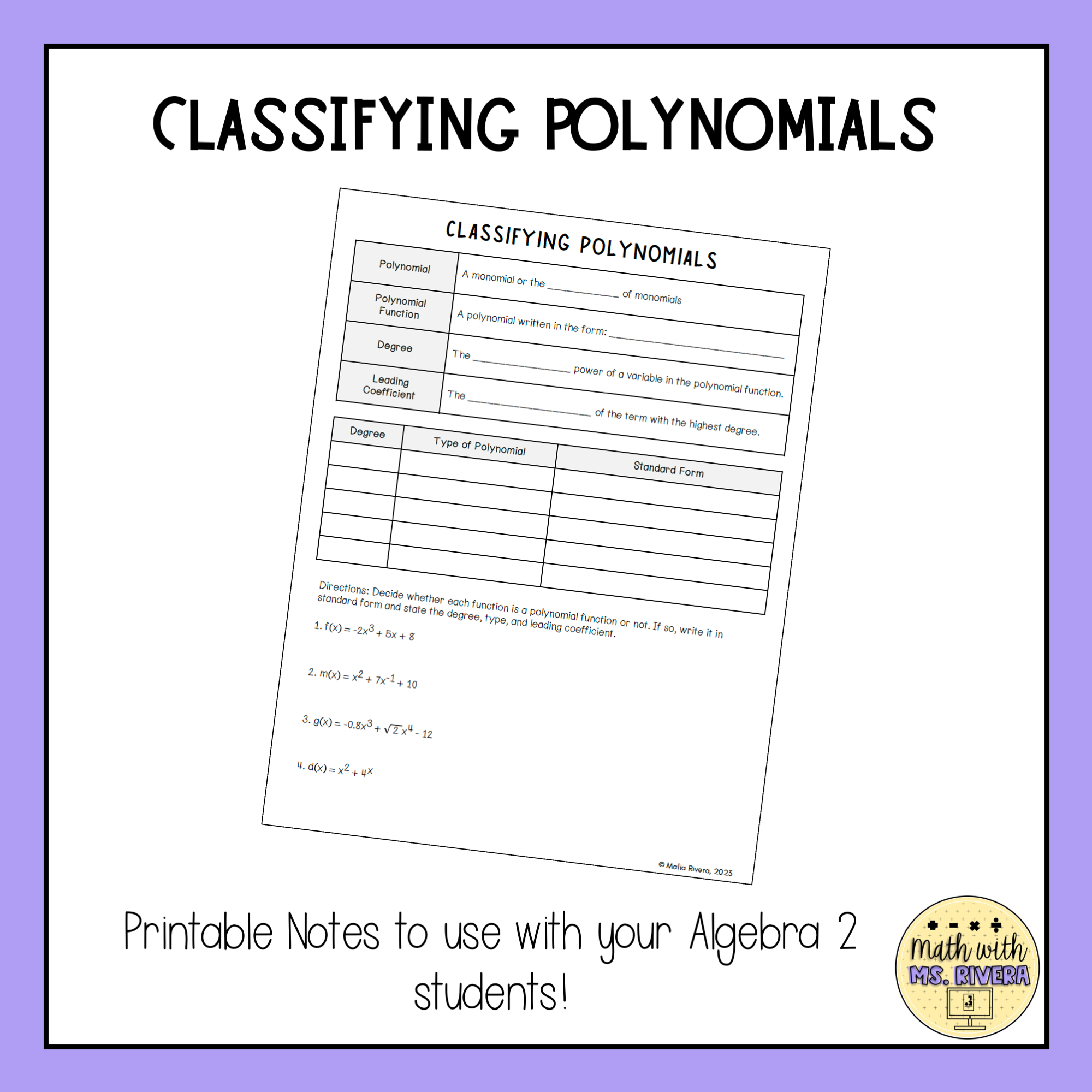 Looking for a clear, print-and-go way to introduce classifying polynomials in Algebra 2? These free guided notes help students understand what polynomials are, how to identify degree and leading coefficient, and how to classify polynomials in standard form. Designed for classroom instruction, this resource gives students structured support while you teach.