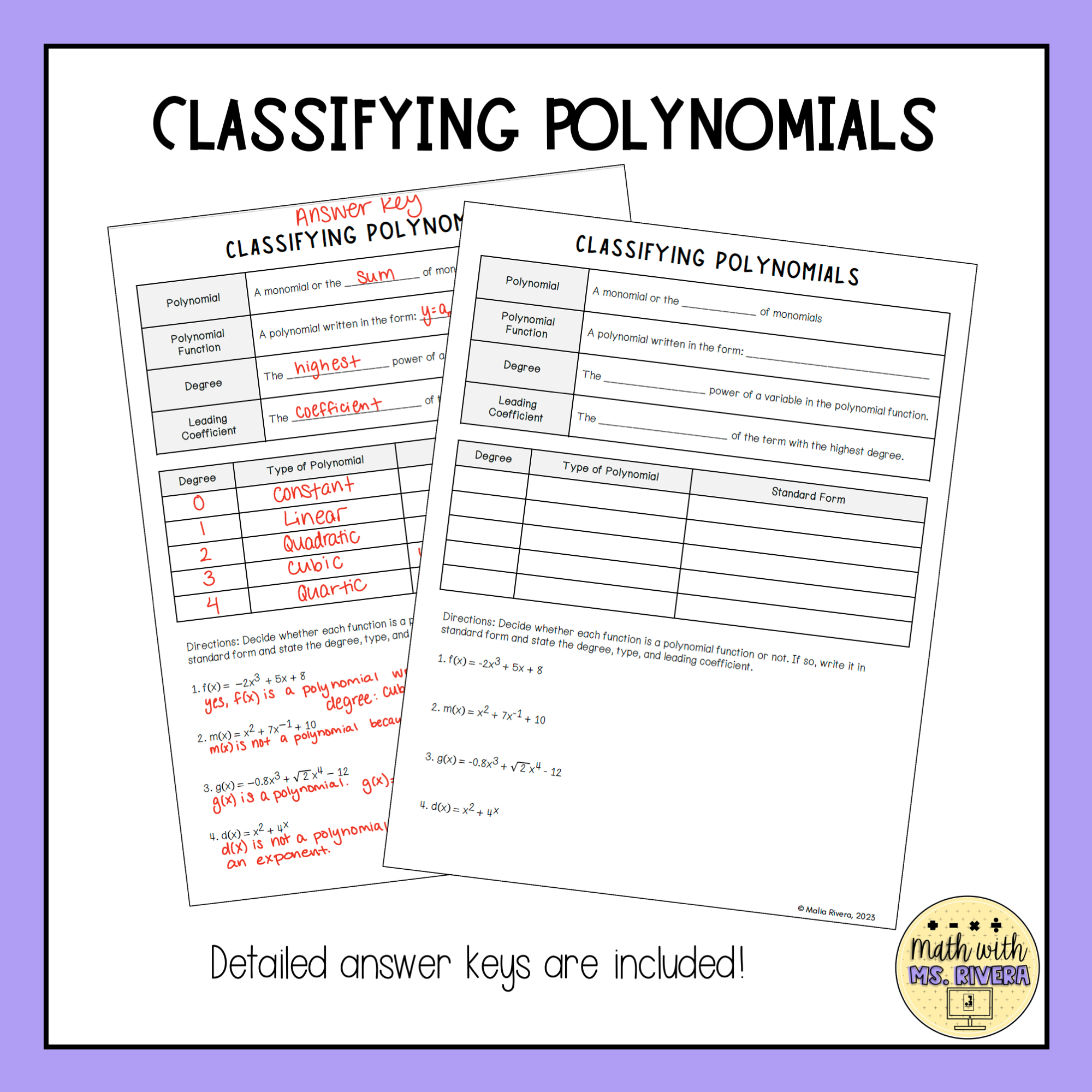 Classifying Polynomials Guided Notes Lesson Algebra 2 Cover