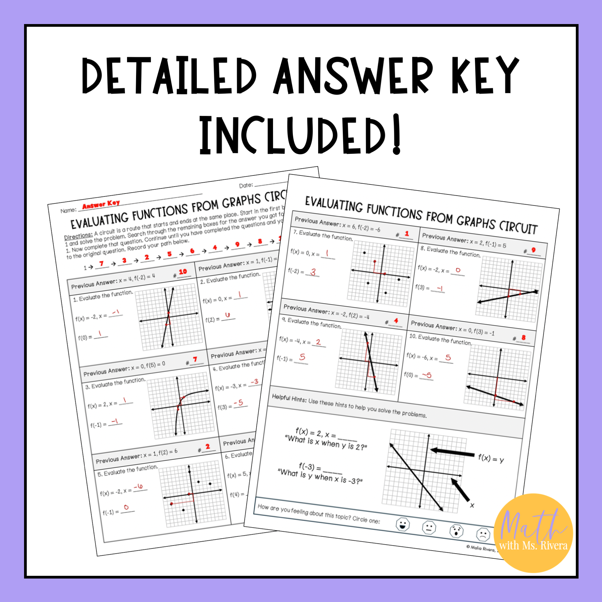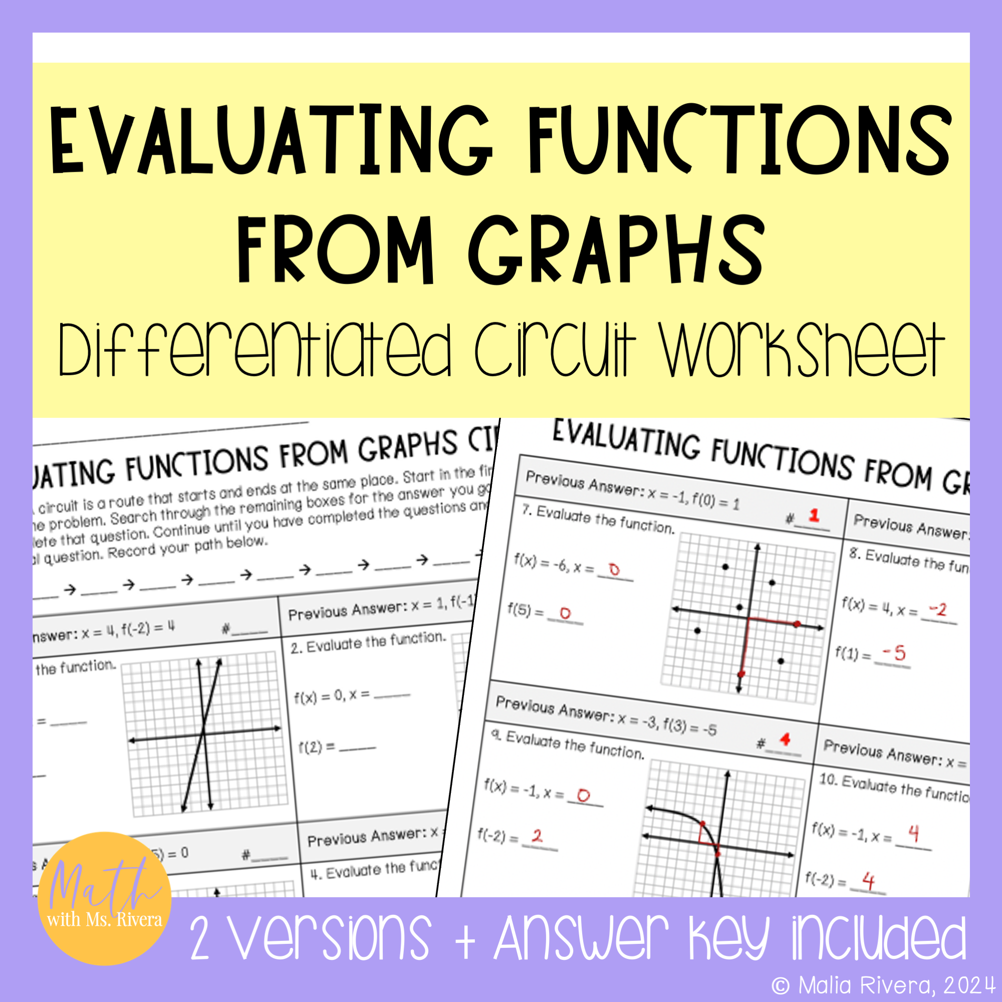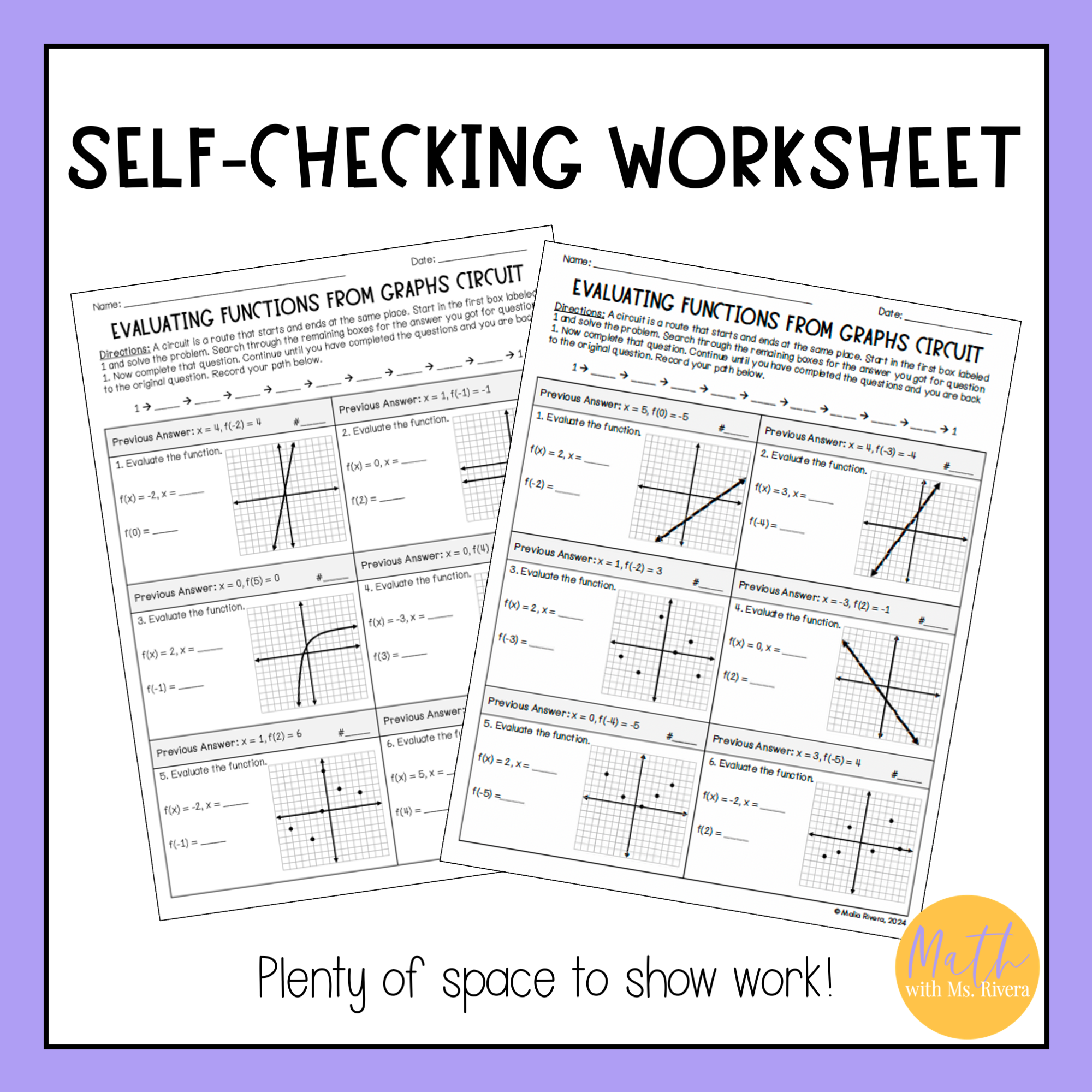 Are you looking for a worksheet to practice evaluating functions from a graph? Check out this differentiated circuit worksheet! This self-checking worksheet has 10 problems on each version and is designed for students to check their answers as they work.