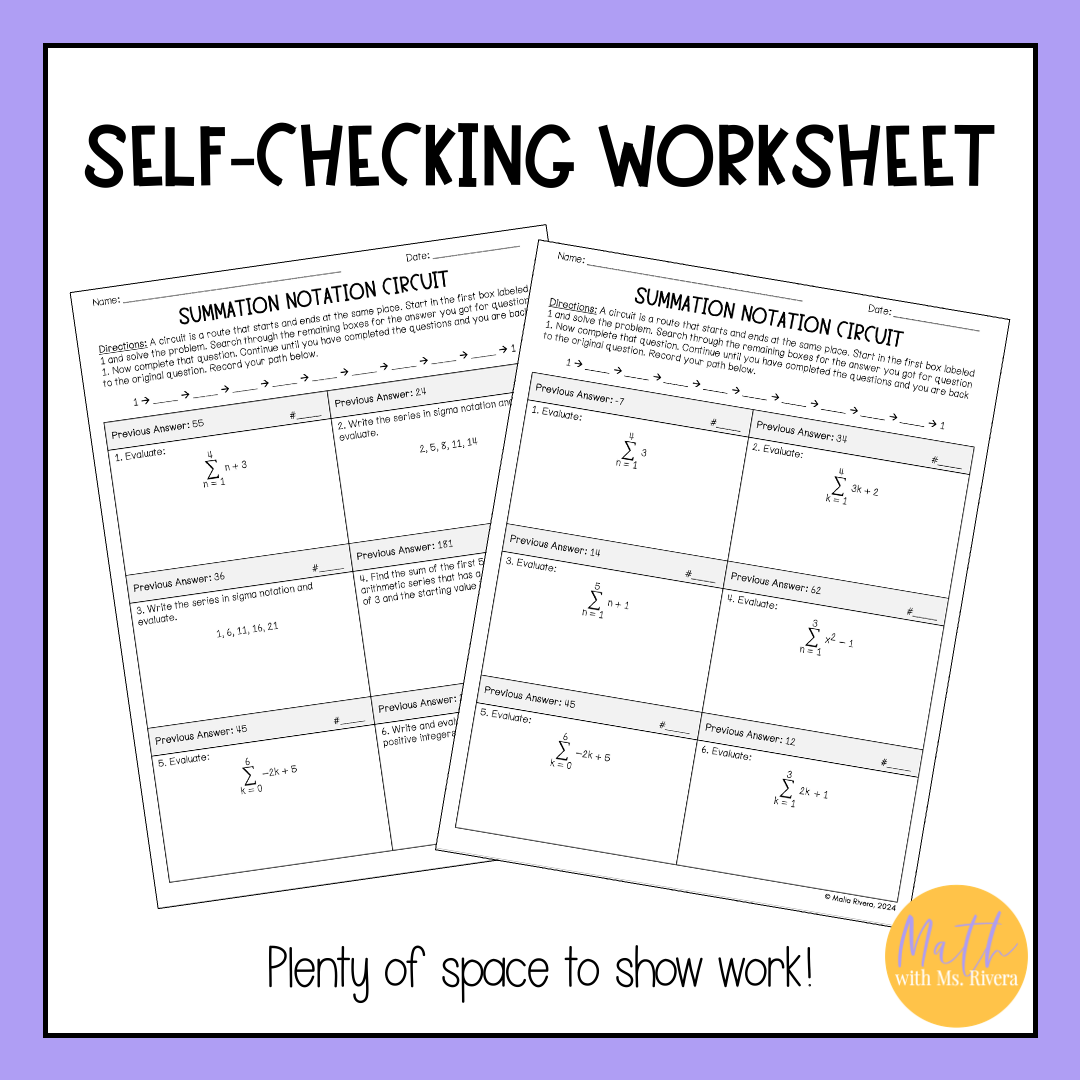 You can use this worksheet right after teaching sigma notation by assigning the version that best fits your students. As students solve each problem and move through the circuit, they get immediate feedback from the path they follow. When they finish, students can complete the self-assessment to reflect on their understanding before class ends.