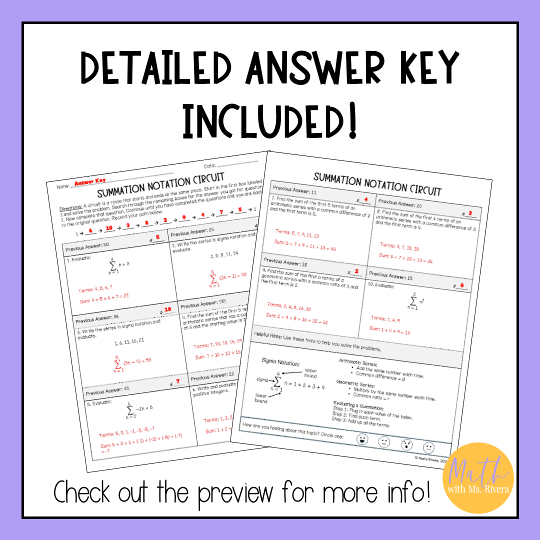 This circuit worksheet helps Algebra 2 and Precalculus students practice evaluating summation notation with instant feedback. Students solve each problem and follow the circuit path to check their work as they go. With 2 differentiated versions, helpful hints, and a challenge problem, this resource makes reviewing sigma notation and series simple and effective.