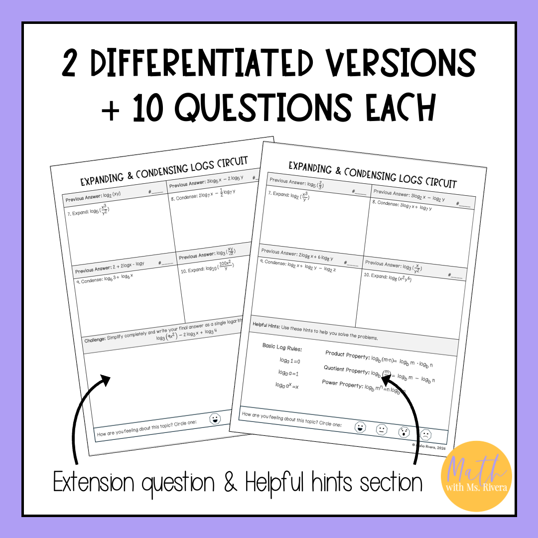 Looking for a way to help students expand and condense logarithms in Algebra 2? This self-checking, differentiated circuit worksheet gives students structured practice for expanding and condensing logs using properties of logarithms. The print-and-go format builds accuracy and fluency while reinforcing how to apply properties of logarithms to condense and expand through built-in accountability.