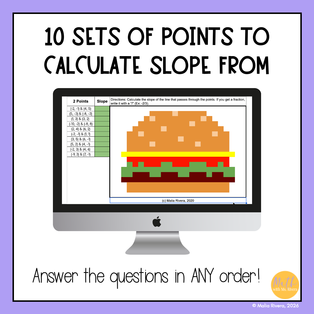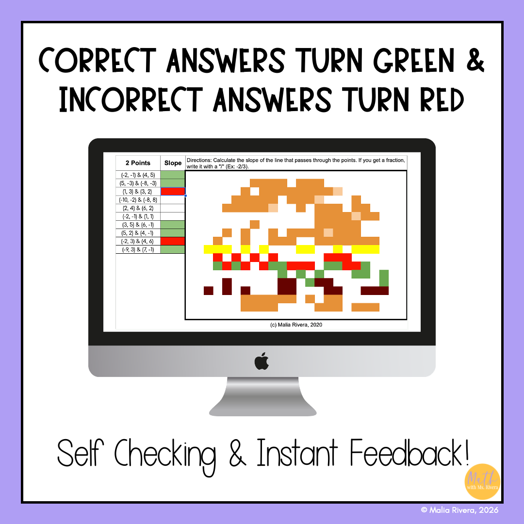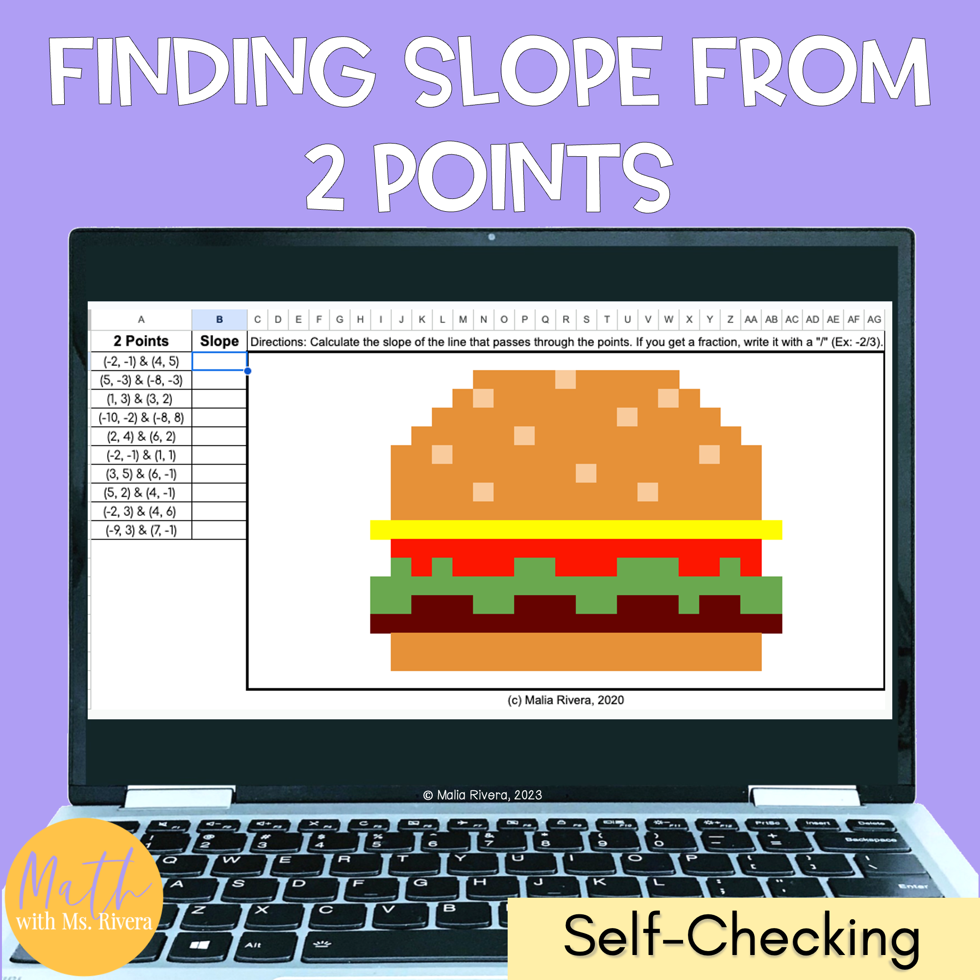 Help Algebra 1 students practice finding slope from two points with this self-checking digital pixel art activity. Students use the slope formula to calculate the slope of a line given two points on the line. This includes positive, negative, fractional and zero slope. Not undefined slopes.