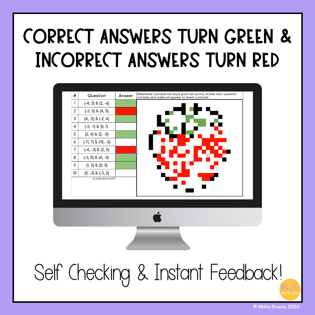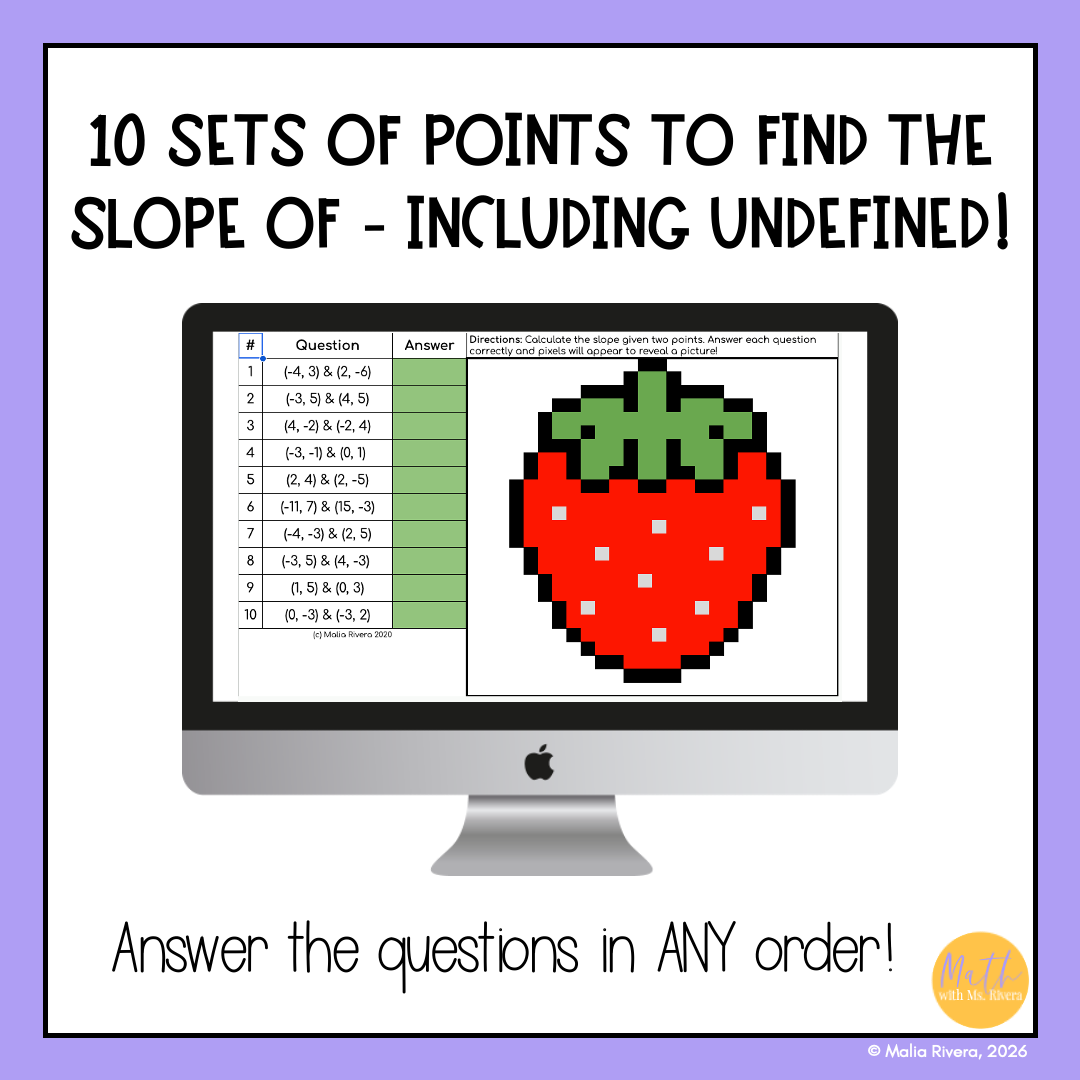 Help Algebra 1 students practice finding slope from two points with this self-checking digital pixel art activity. Students calculate slope using the slope formula while working with positive, negative, fractional, zero, and undefined slopes.