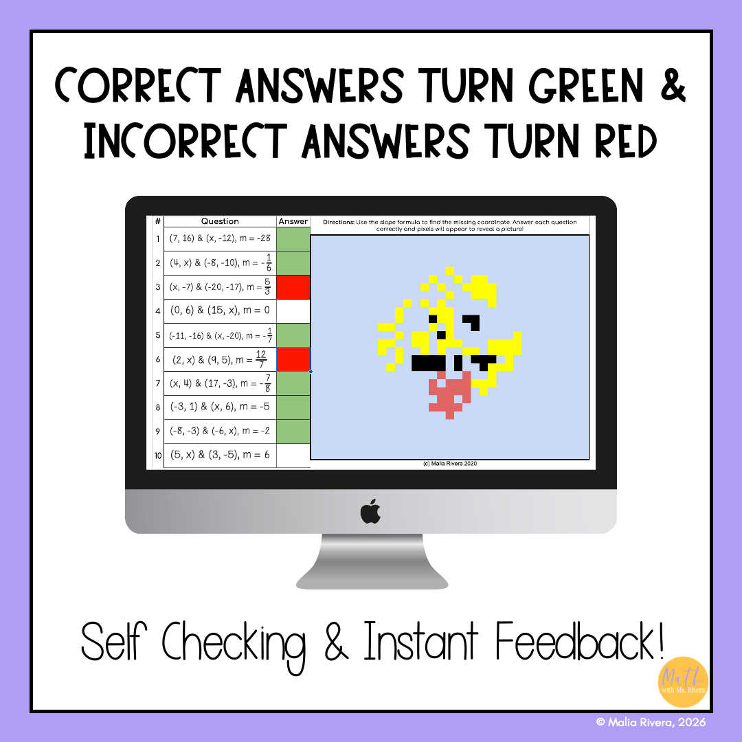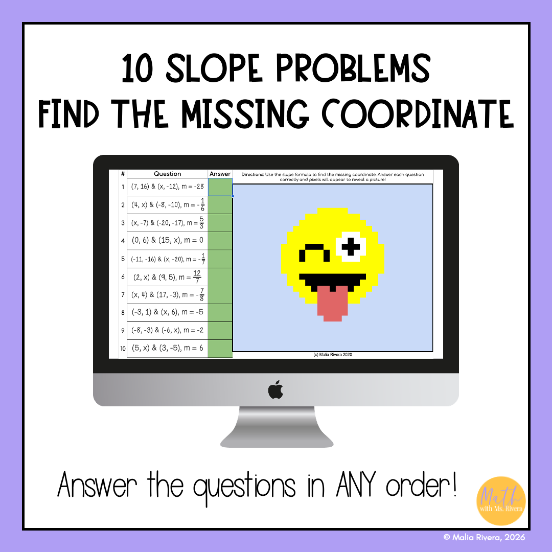 Challenge your Algebra students to find the missing coordinate using slope with this self-checking digital pixel art activity. Students apply the slope formula to determine the missing coordinate that makes two points create the given slope.