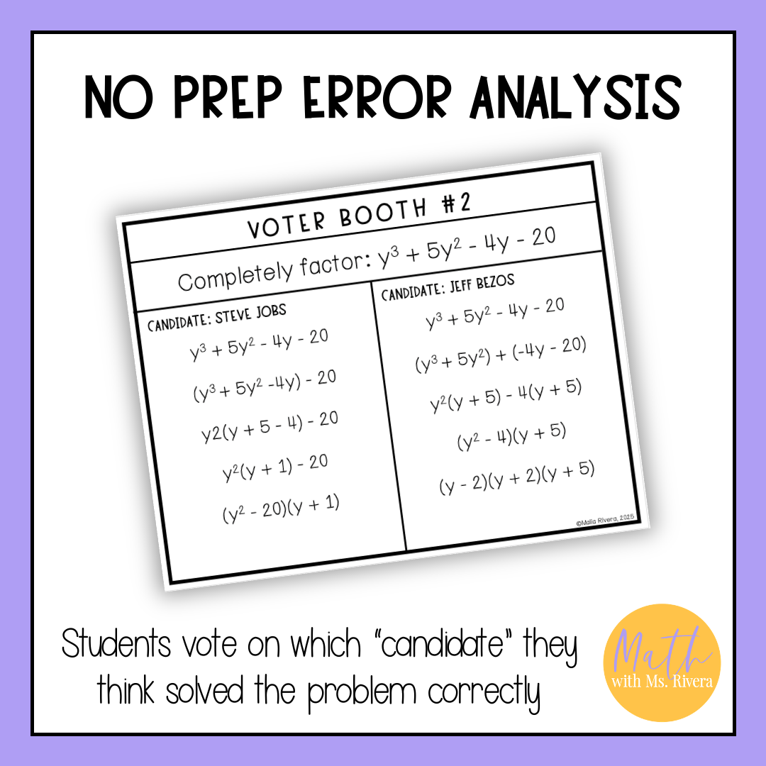 Make Election Day both meaningful and math-focused with this quick, ready-to-use error analysis activity! In this resource, students take on the role of voters deciding which “candidate” factored a polynomial correctly. Each problem includes two versions of student work — one correct and one with a common mistake — and students must analyze both before casting their vote.