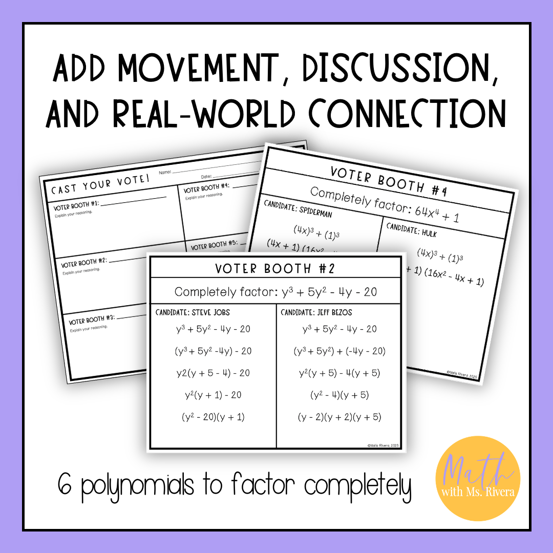 Perfect for Algebra 2 or Precalculus students reviewing factoring techniques or preparing for an upcoming test — and an easy way to make Election Day more interactive without extra prep.