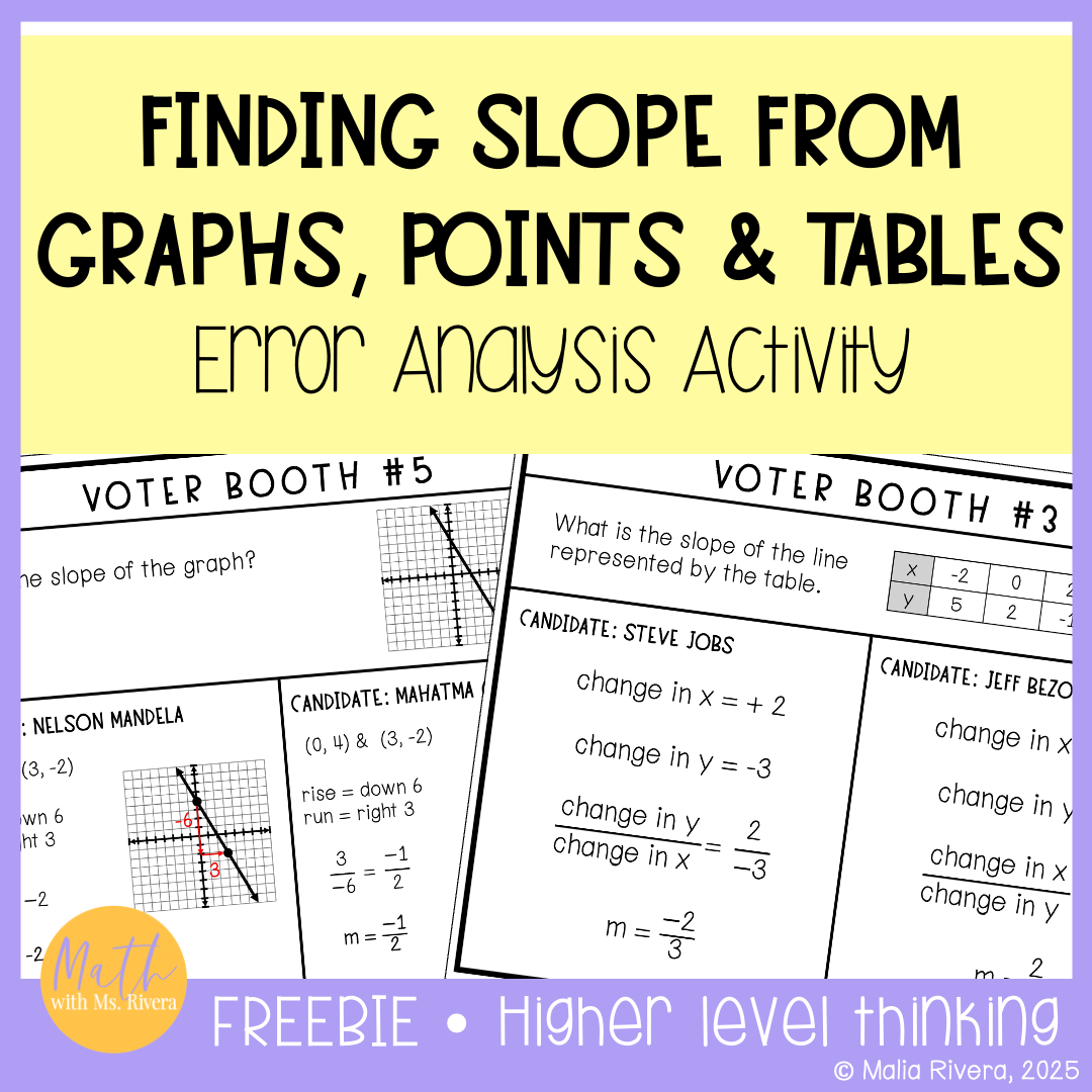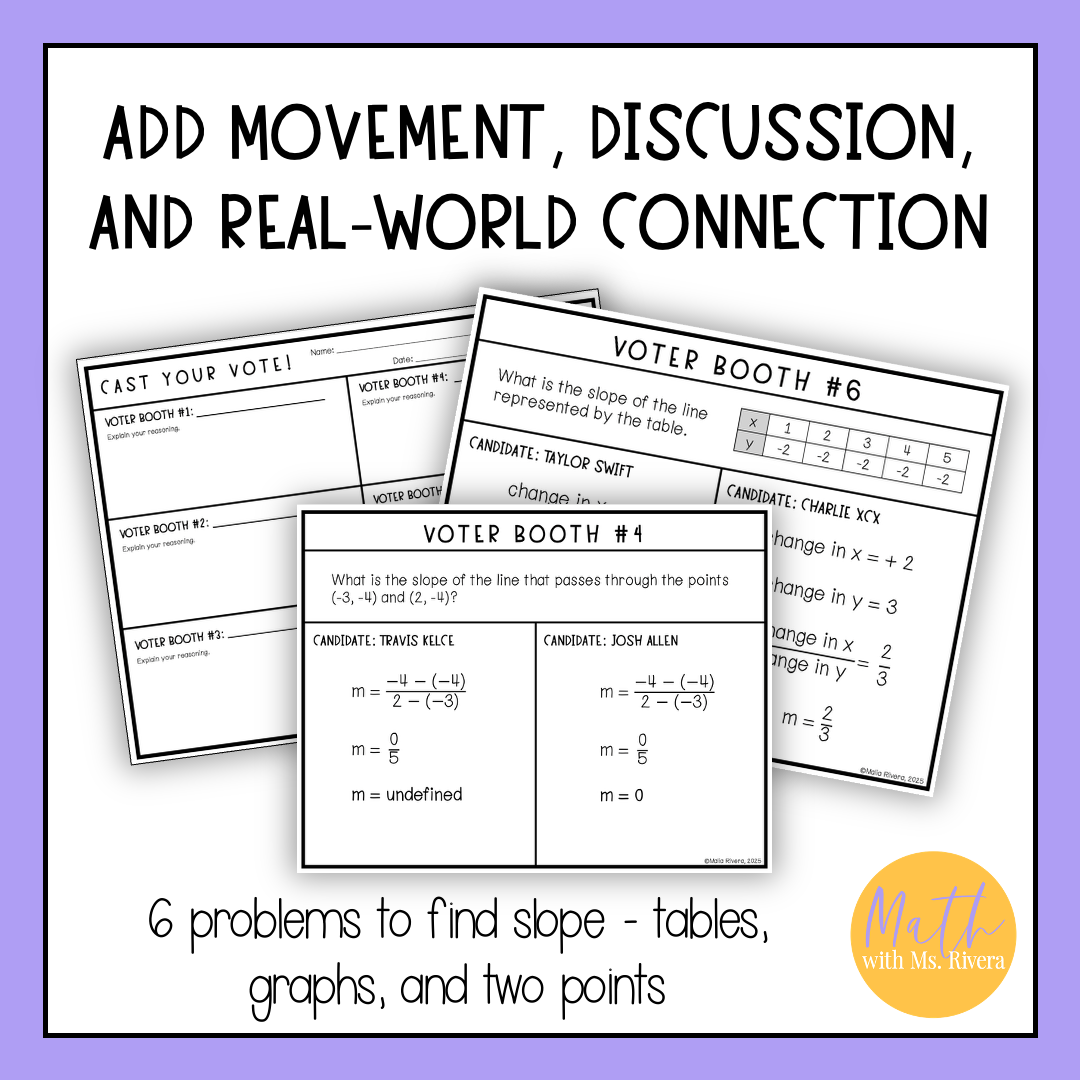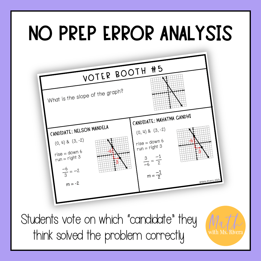 Make Election Day fun and relevant in your math classroom with this quick, no-prep activity focused on finding slope. Students become “voters,” analyzing different “candidates” who each solved the same slope problem in their own way. Their job? Decide who did it right and cast their vote for the correct candidate.