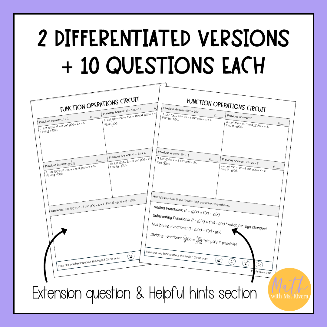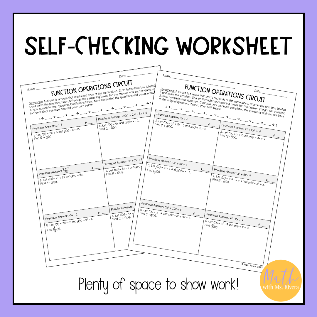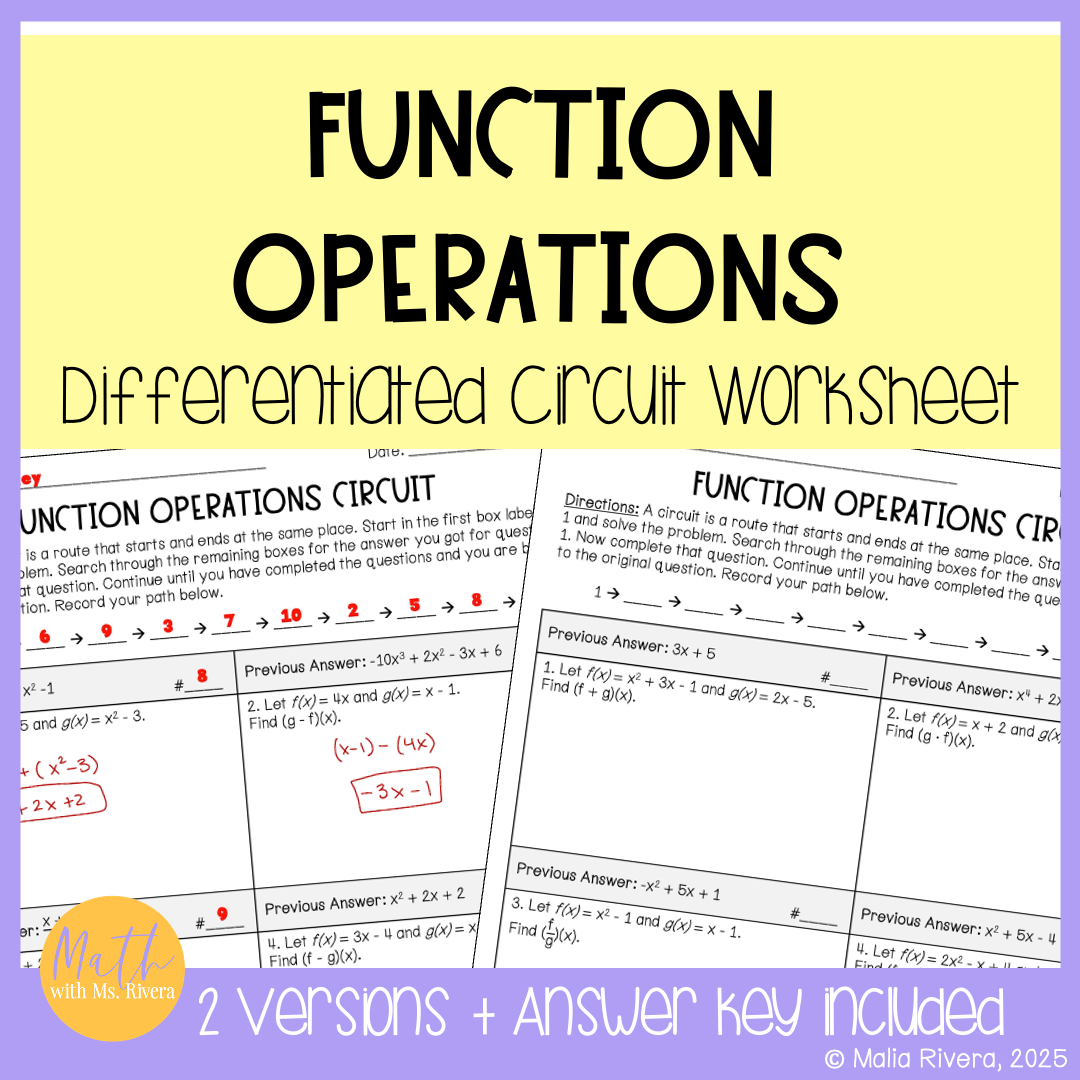 Looking for a way to practice function operations in Algebra 2? This self-checking, differentiated circuit worksheet helps students add, subtract, multiply, and divide functions using function notation. The print-and-go format includes two levels so every student can practice at the right pace while checking their own work as they go.