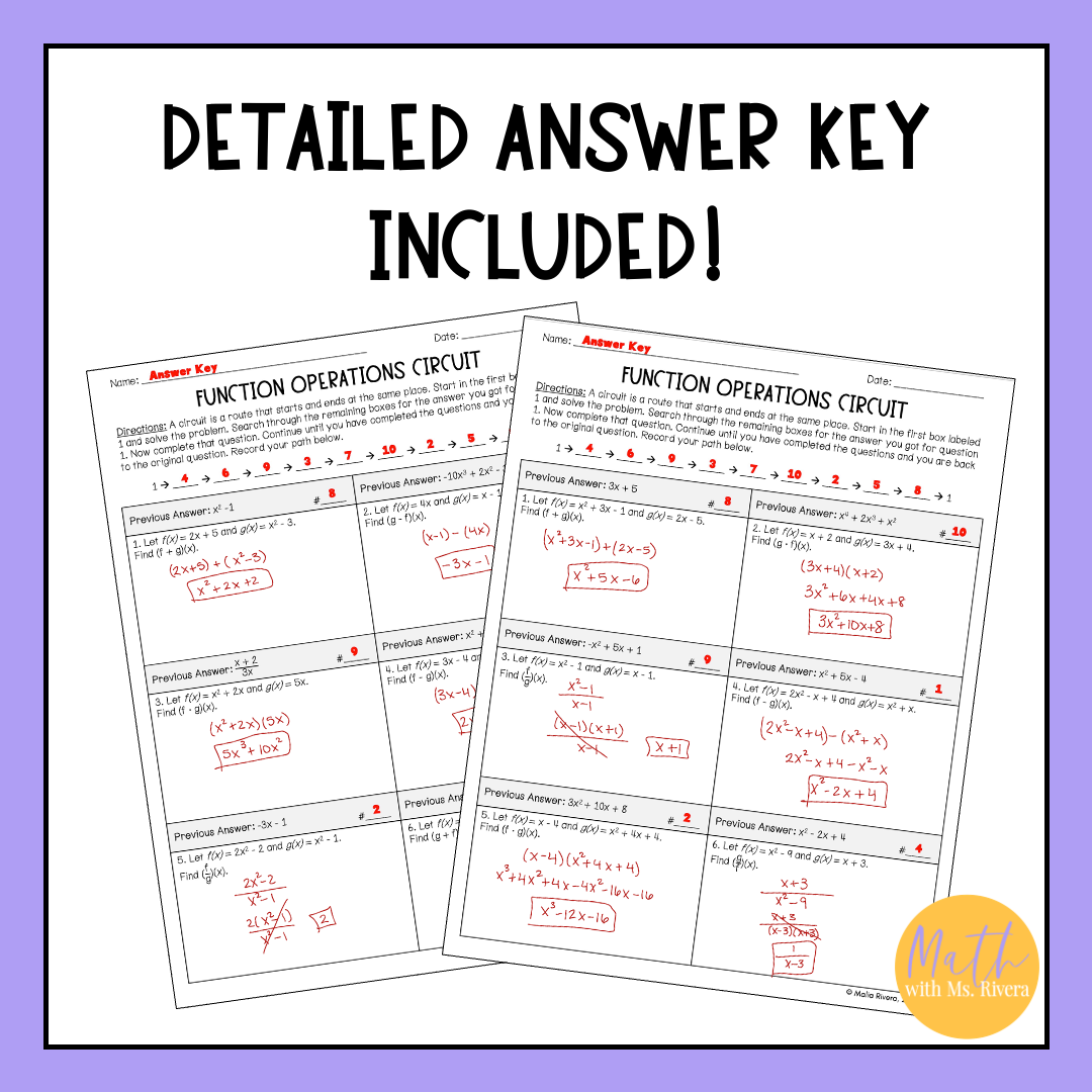 Students begin at Problem #1 and solve each expression involving two functions. Their solution directs them to the next problem in the circuit. If their math is correct, they’ll complete the path and return to the starting point, creating a self-checking experience that builds confidence and accuracy.