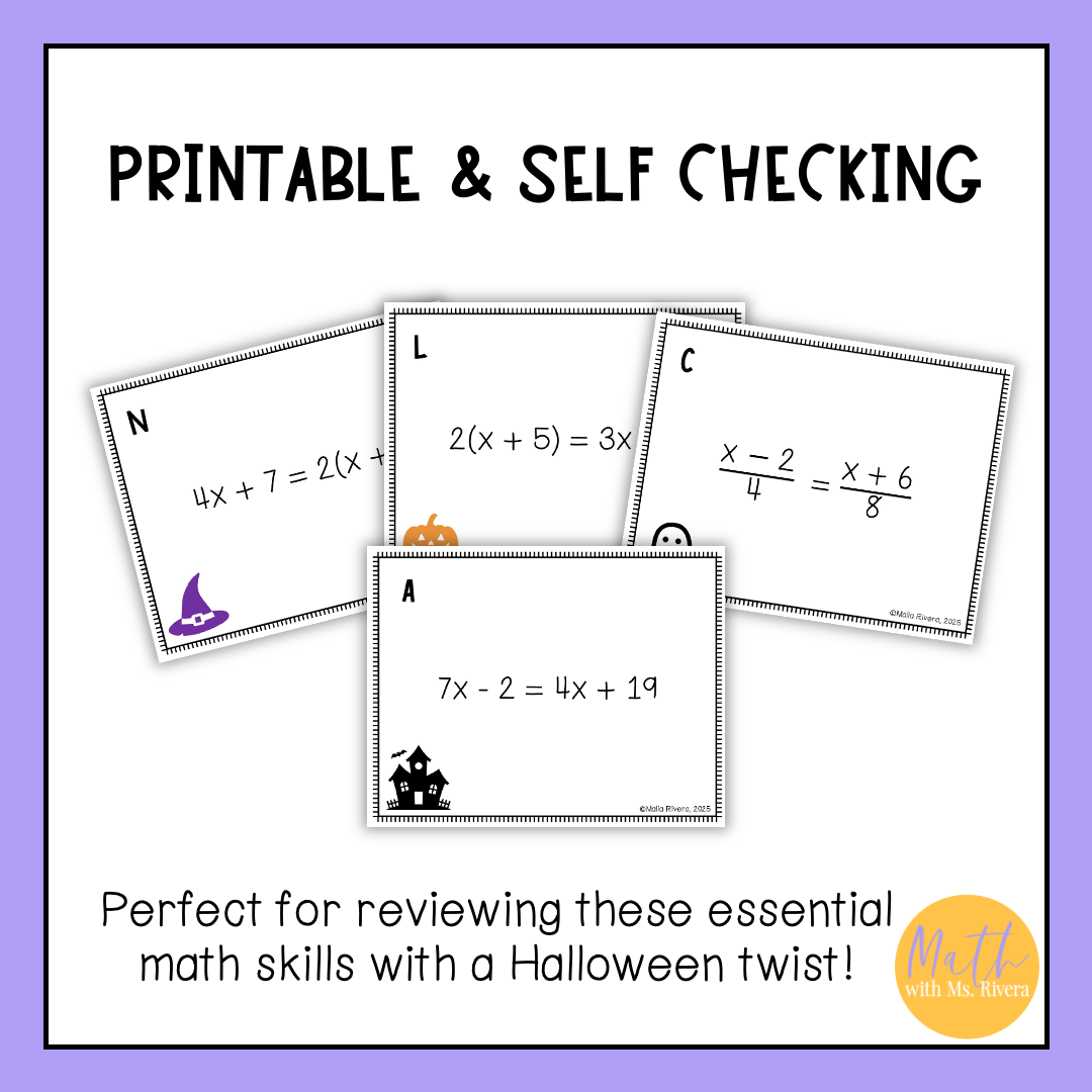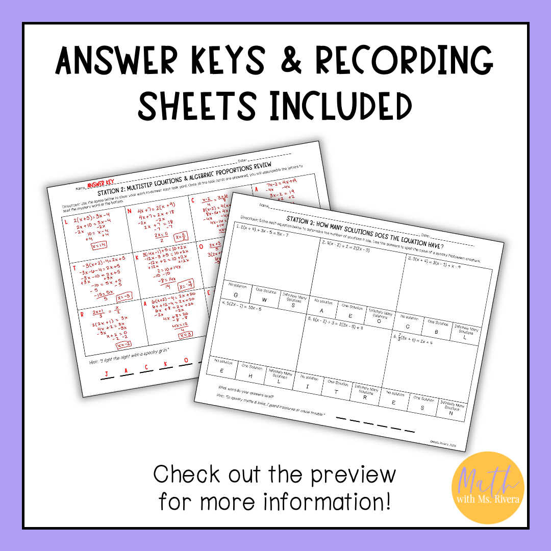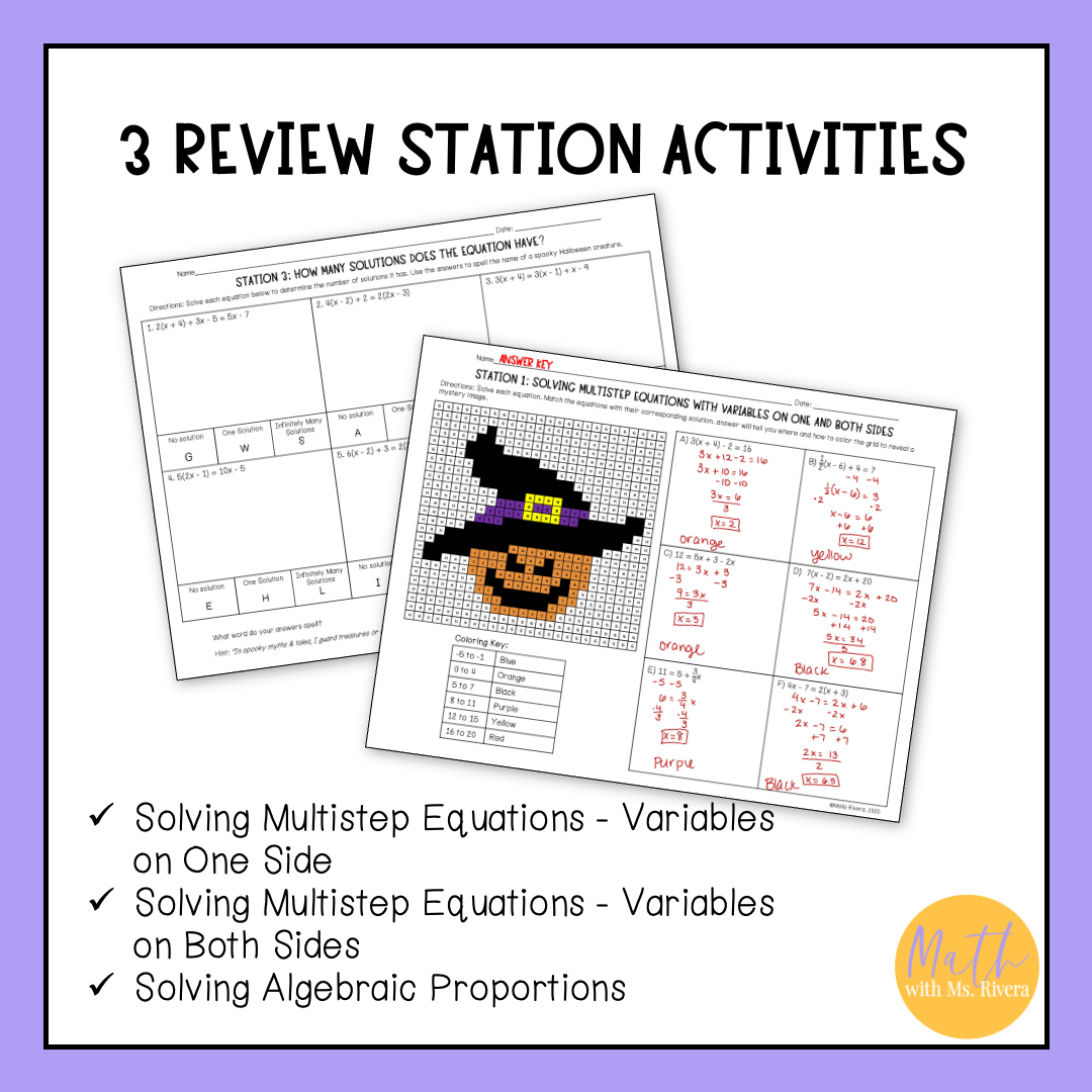 This Halloween solving multi step equations review stations activity is just what you need to help your Algebra 1 student practice solving multistep equations with variables on one and both sides, determining the number of solutions, and solving algebraic proportions! The 3 stations are self-checking to provide student feedback as they practice.