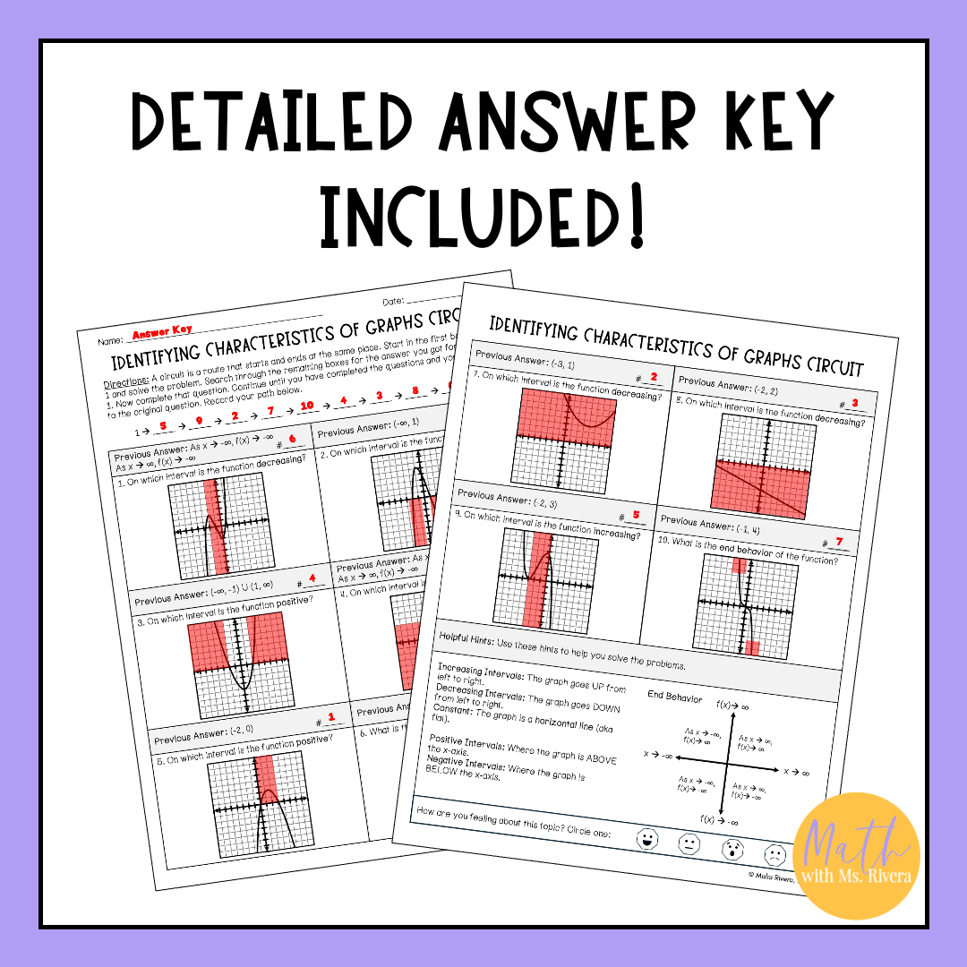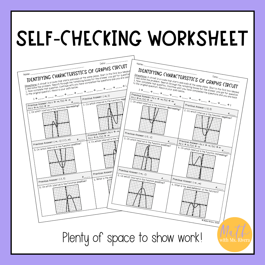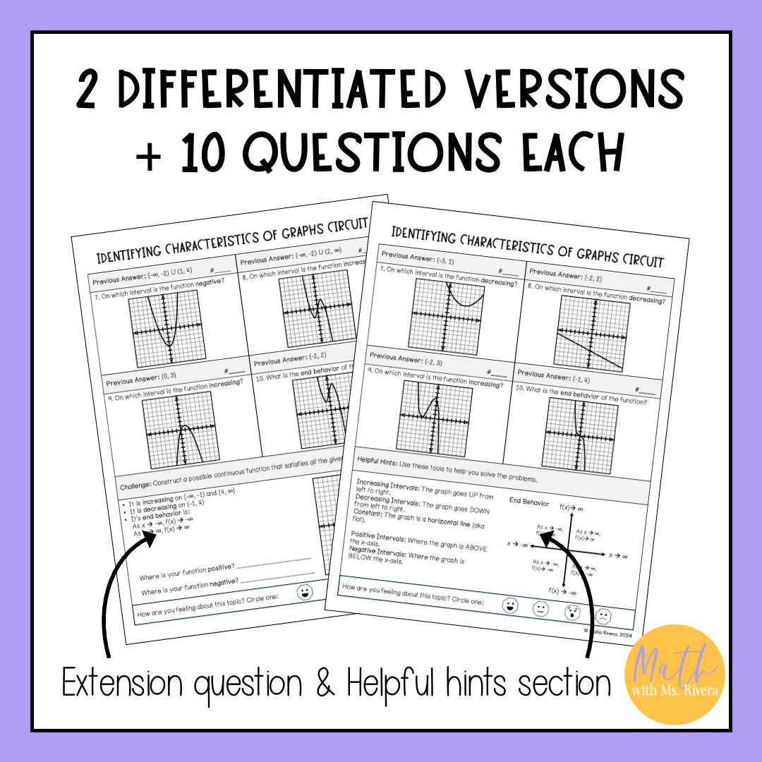 Are you looking for a worksheet to practice identifying characteristics of graphs? Check out this differentiated circuit worksheet to identify intervals of increasing & decreasing, positive & negative, and end behavior! This self-checking worksheet has 10 problems on each version and is designed for students to check their answers as they work.