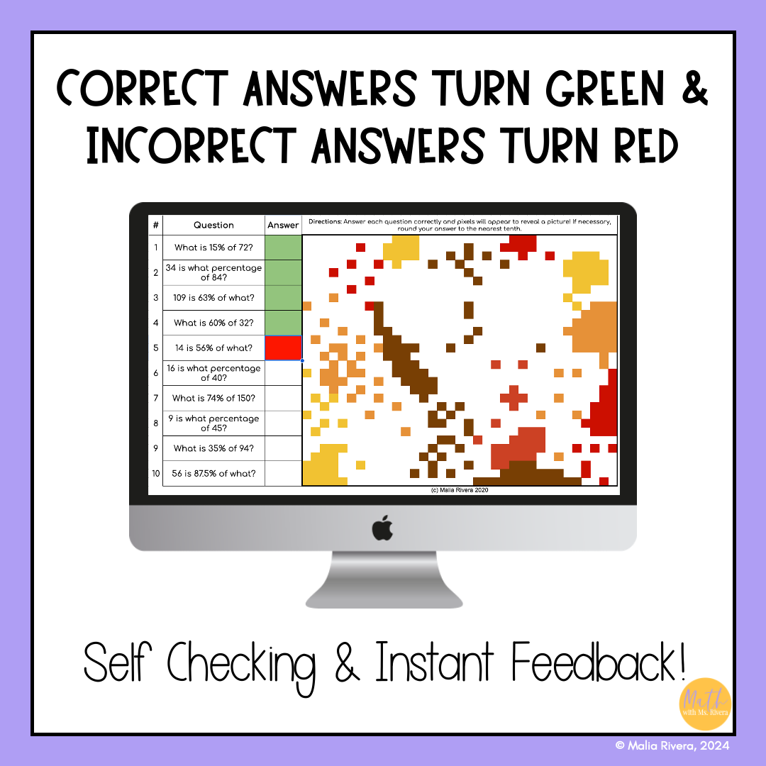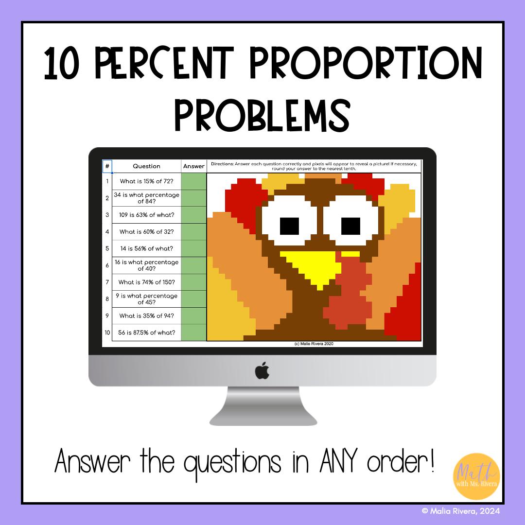 Are your students struggling with percent proportions? With this self-checking digital pixel art activity, your students will calculate 10 percent proportion problems in order to reveal a mystery image.