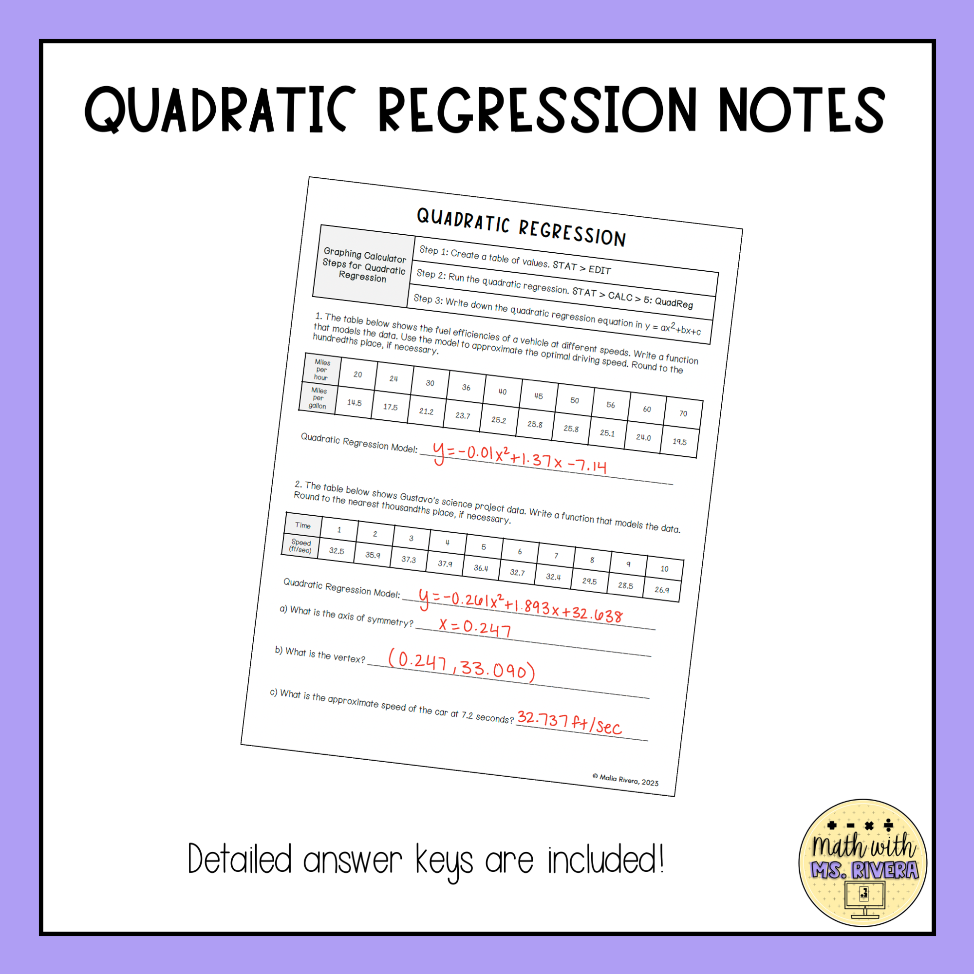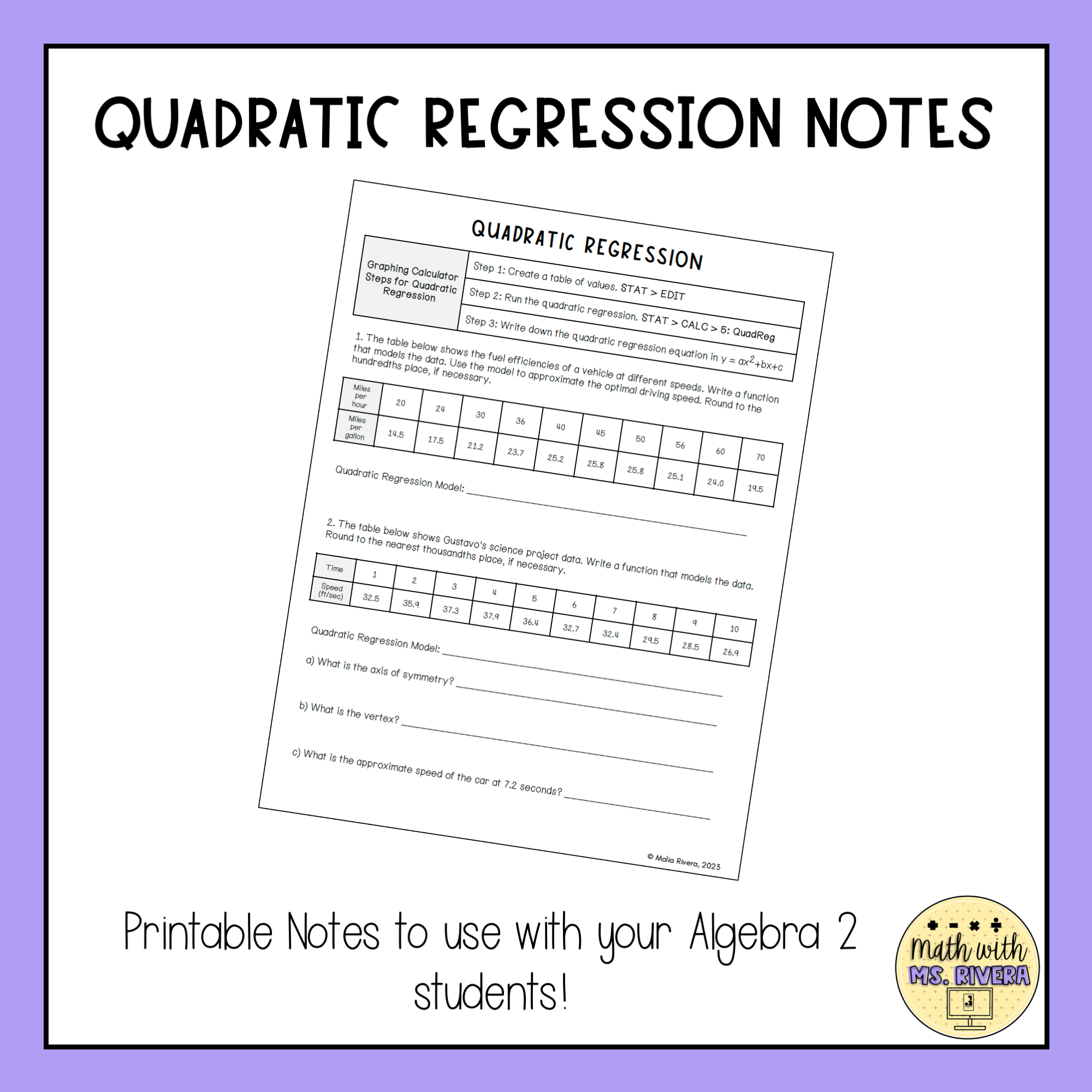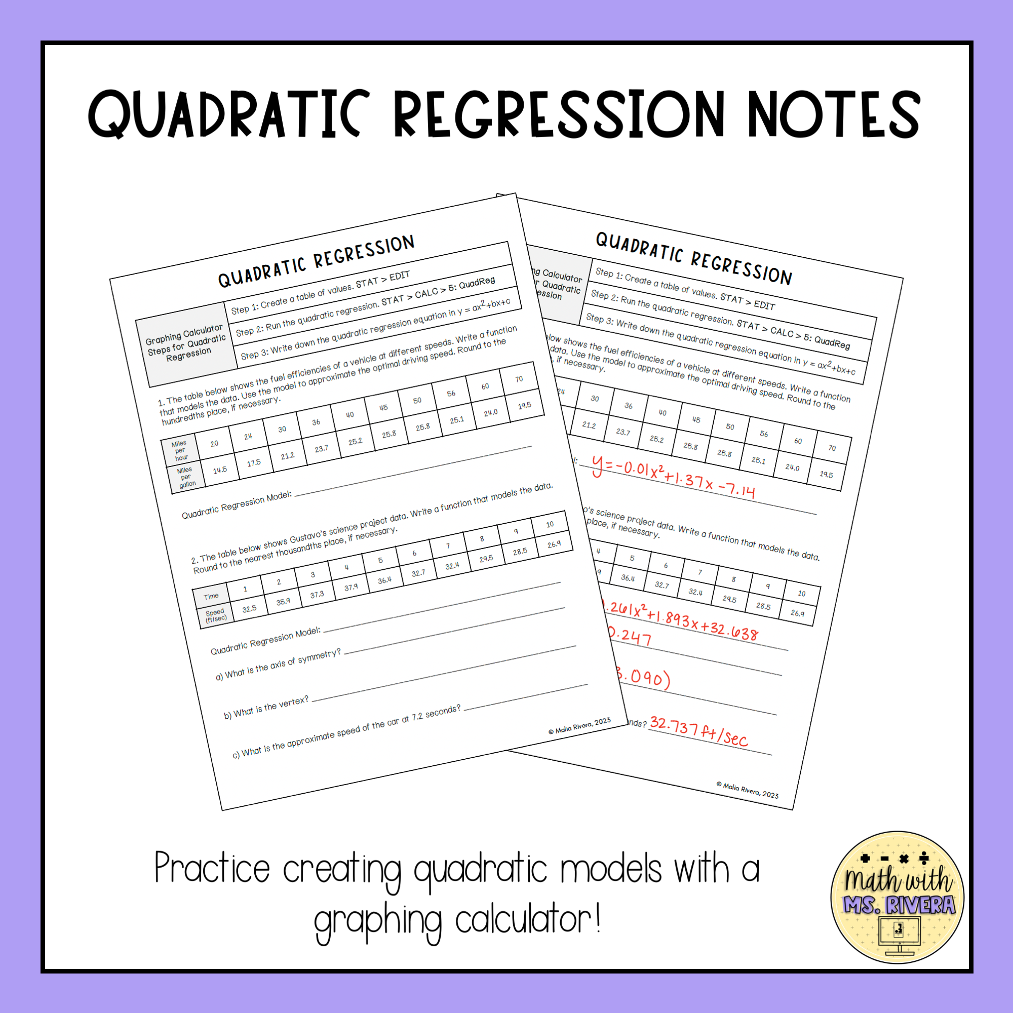 This set of guided notes will walk Algebra 2 students through modeling quadratic regression using a graphing calculator. All you need to do is print & make copies for your students! A suggested, detailed answer key is included for all pages.