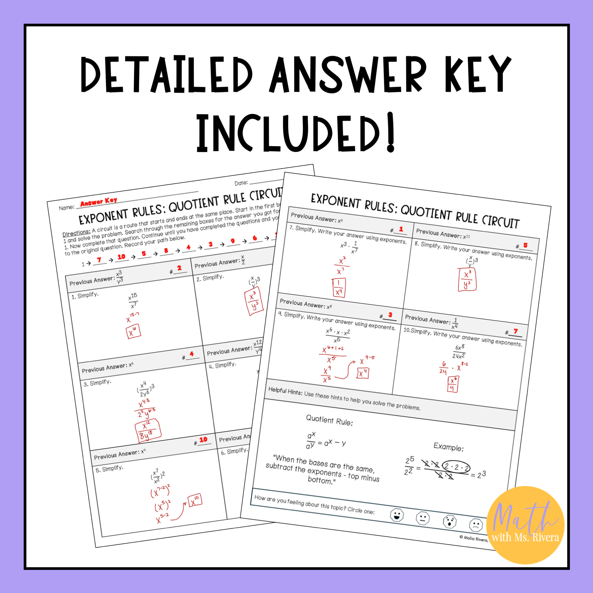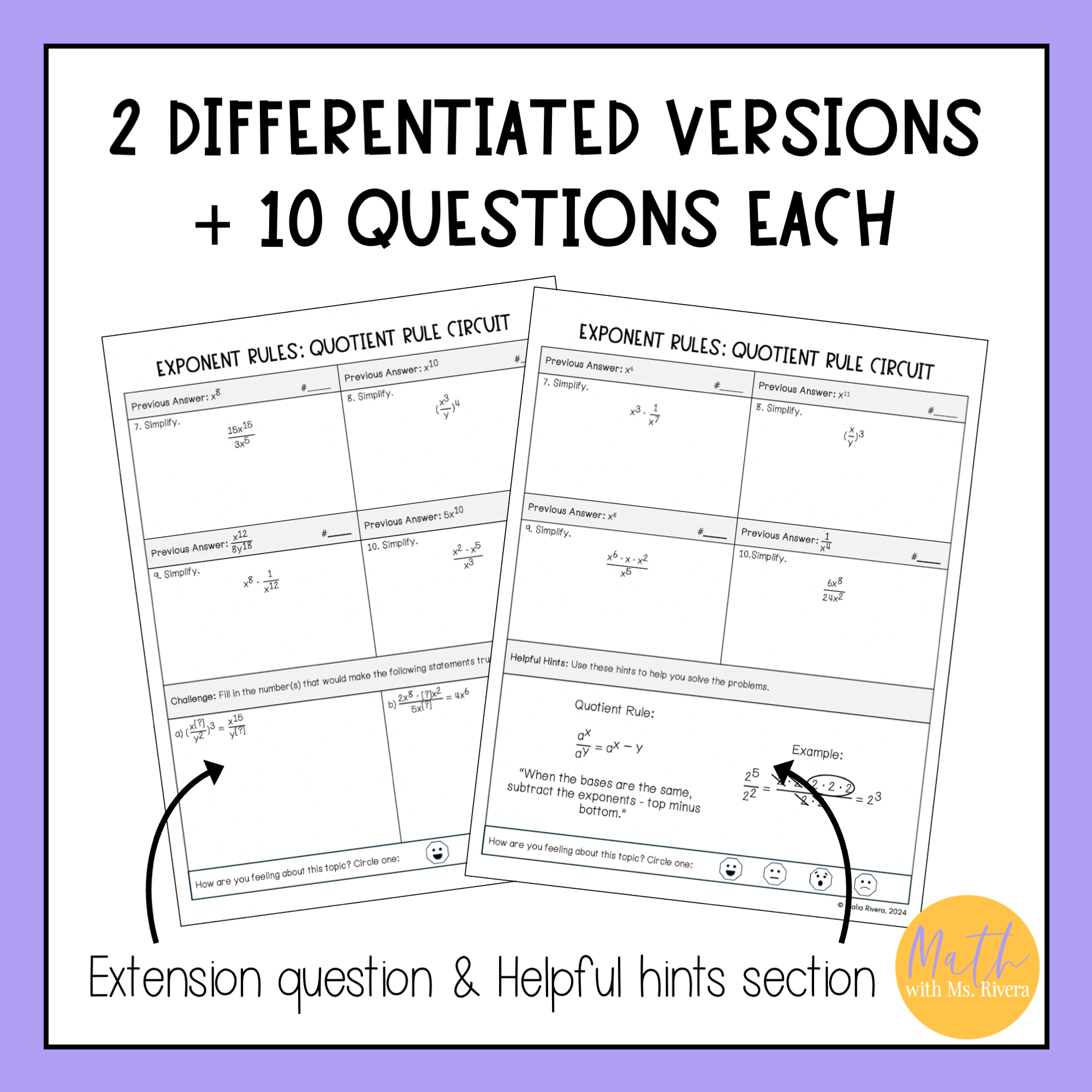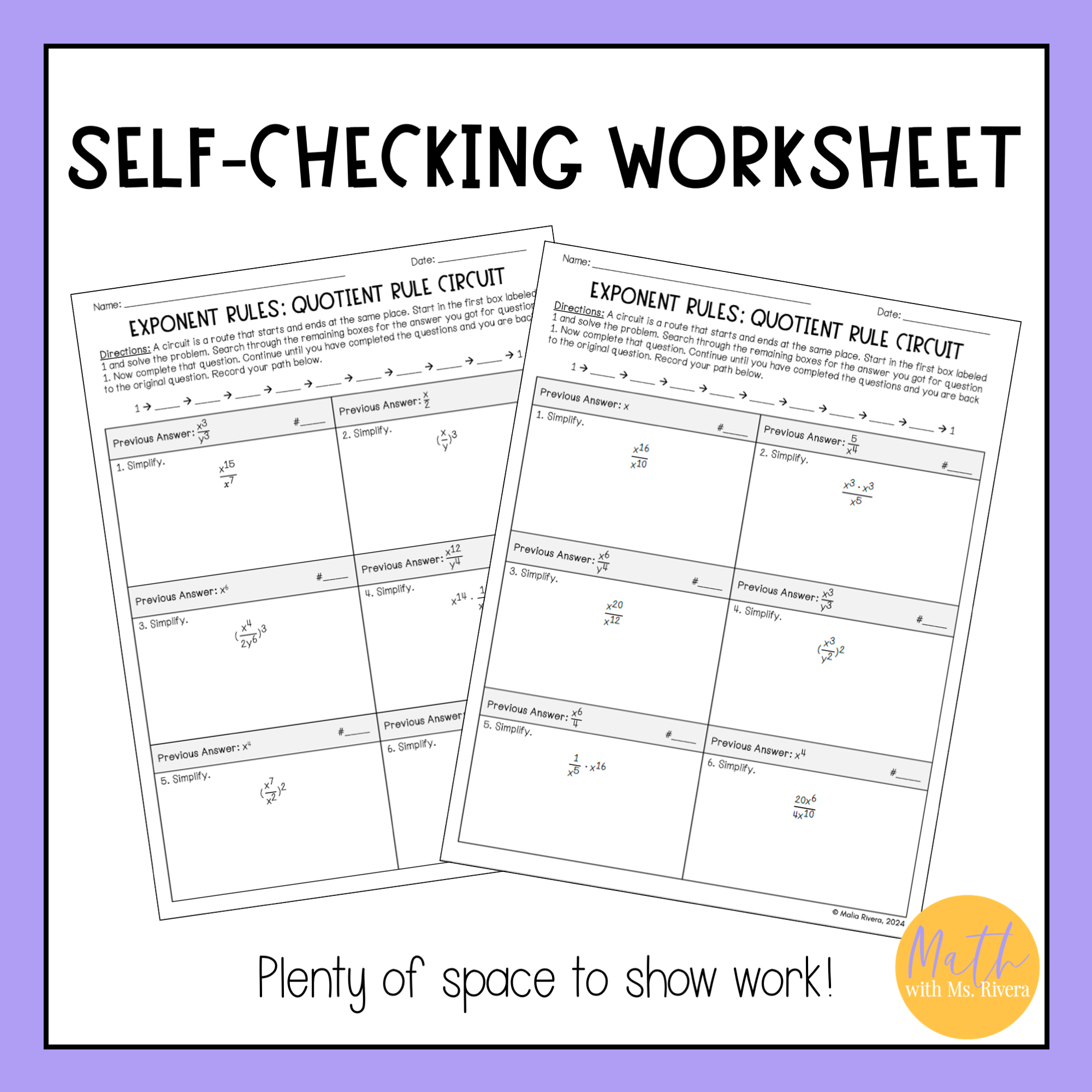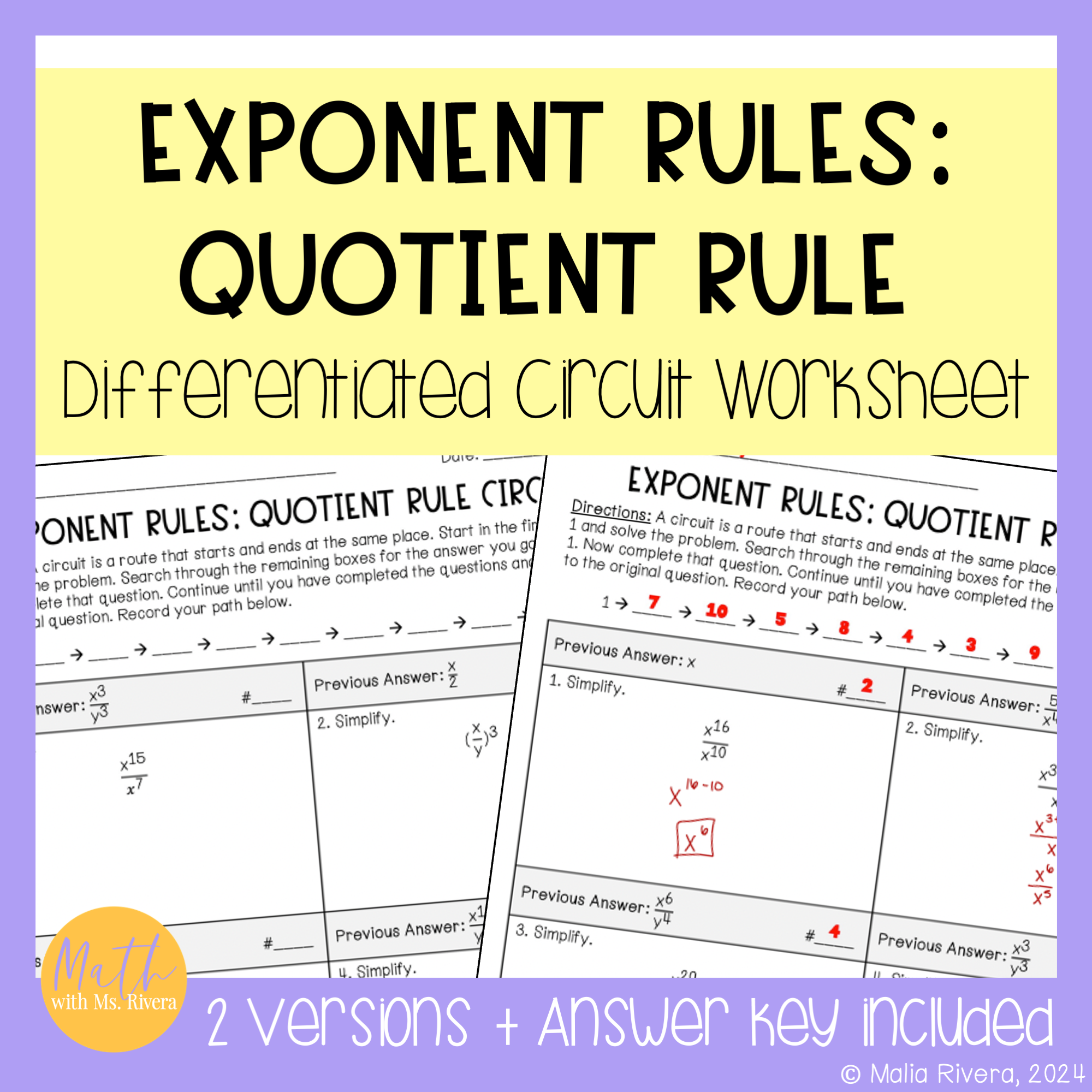 Are you looking for a worksheet to practice applying exponent rules, specifically the quotient rule? Check out this differentiated circuit worksheet! This self-checking worksheet has 10 problems on each version and is designed for students to check their answers as they work.