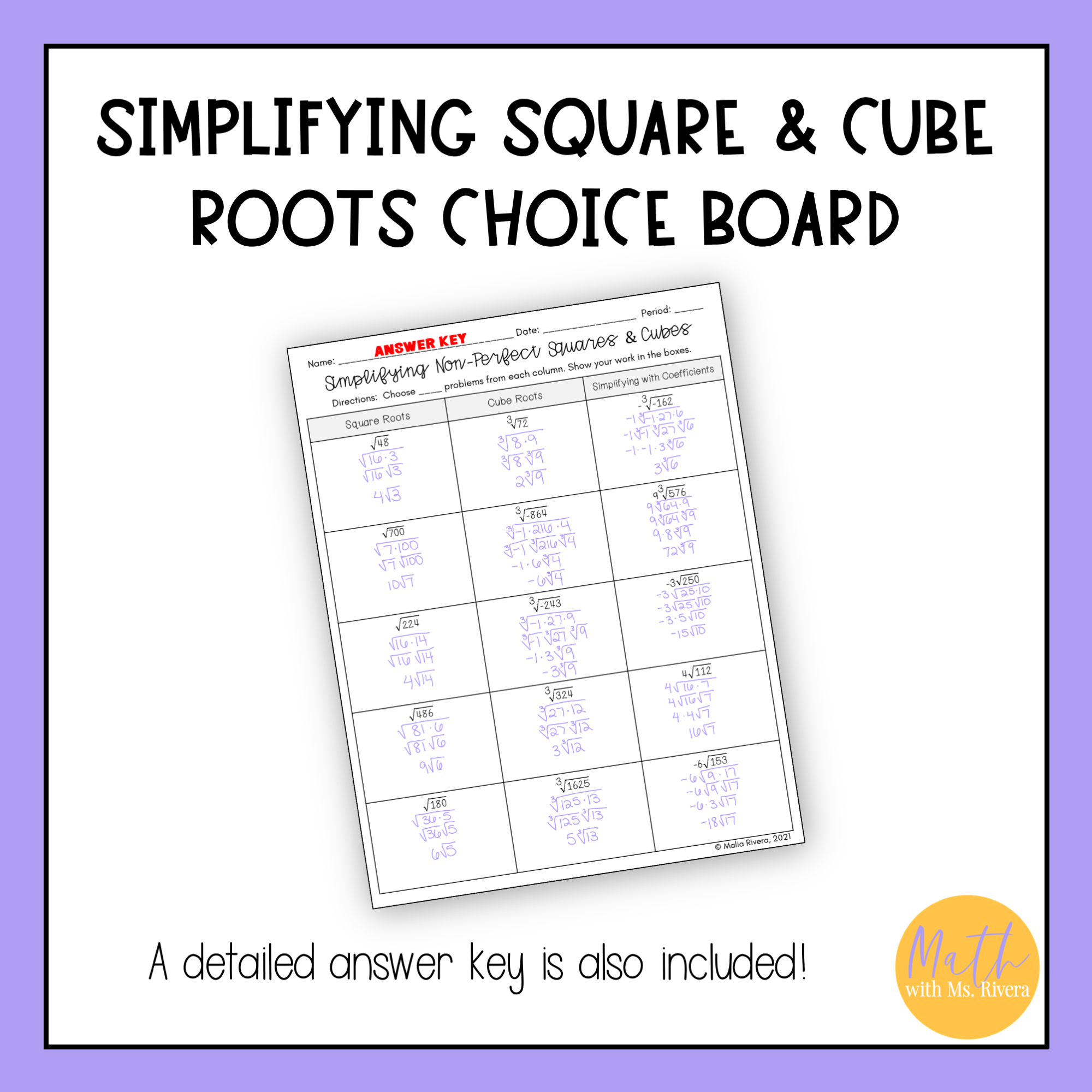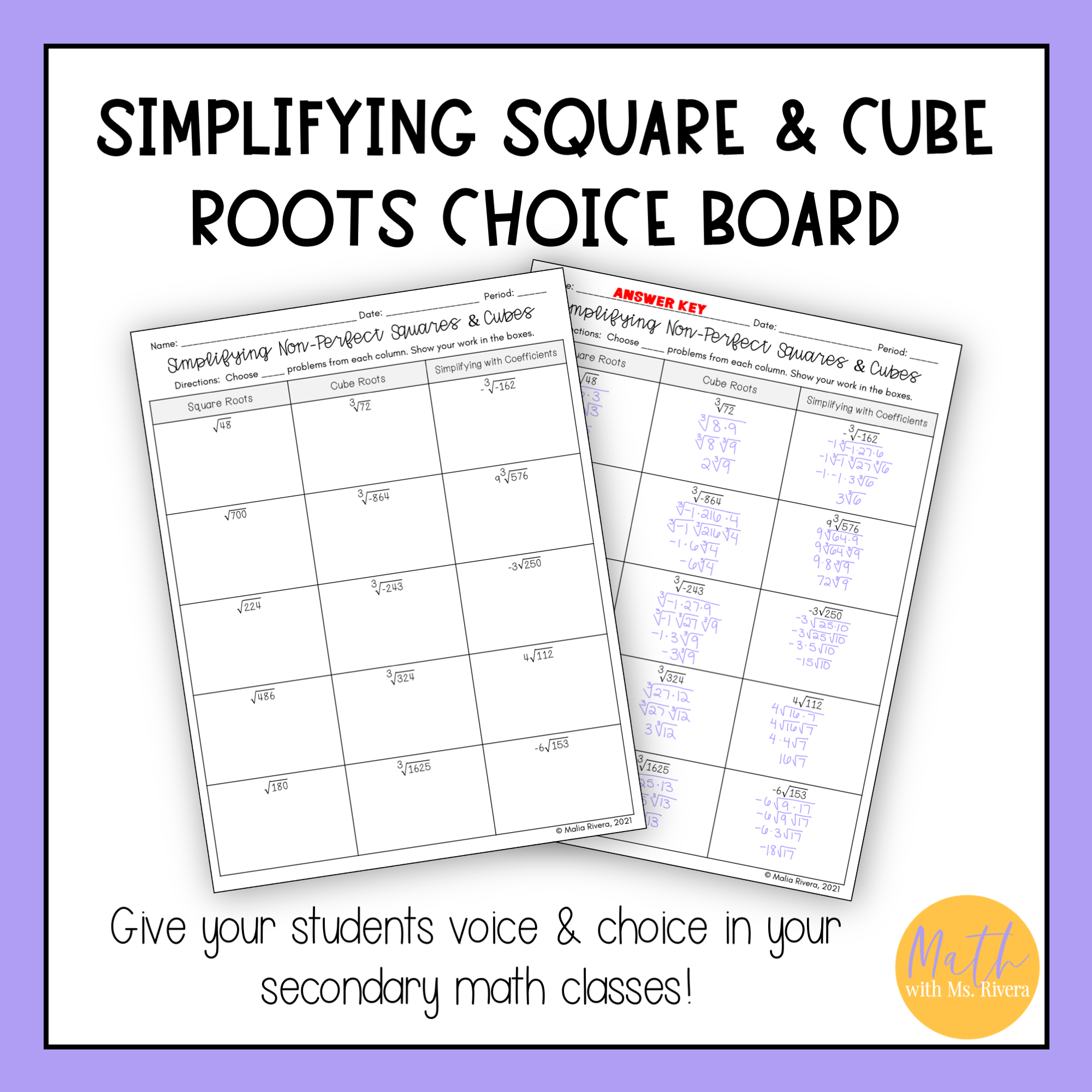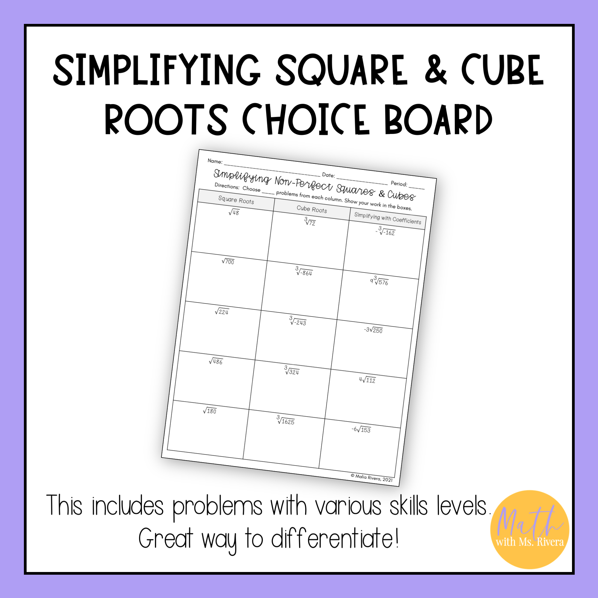 Simplifying Radical Expressions Square & Cube Roots Worksheet Choice Board