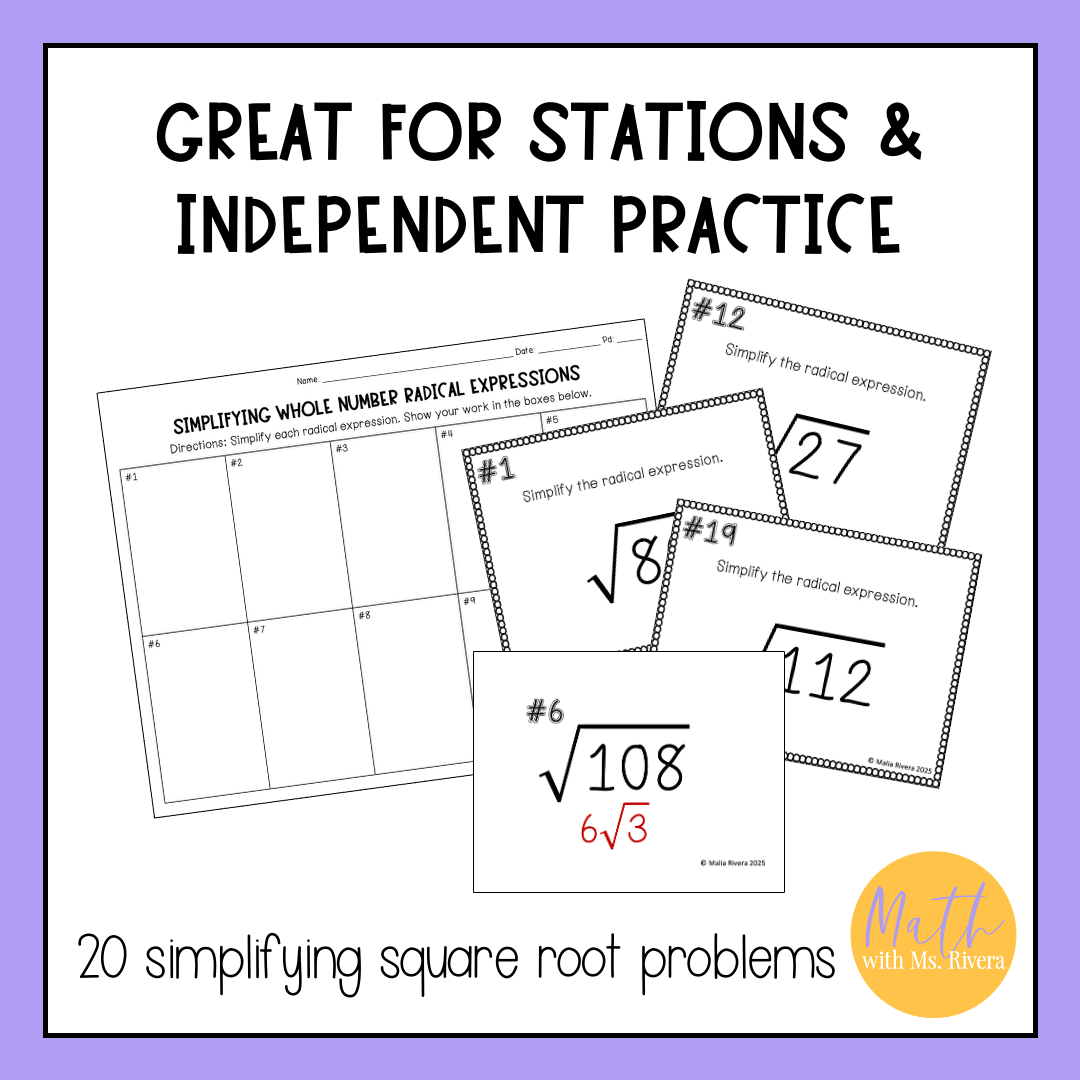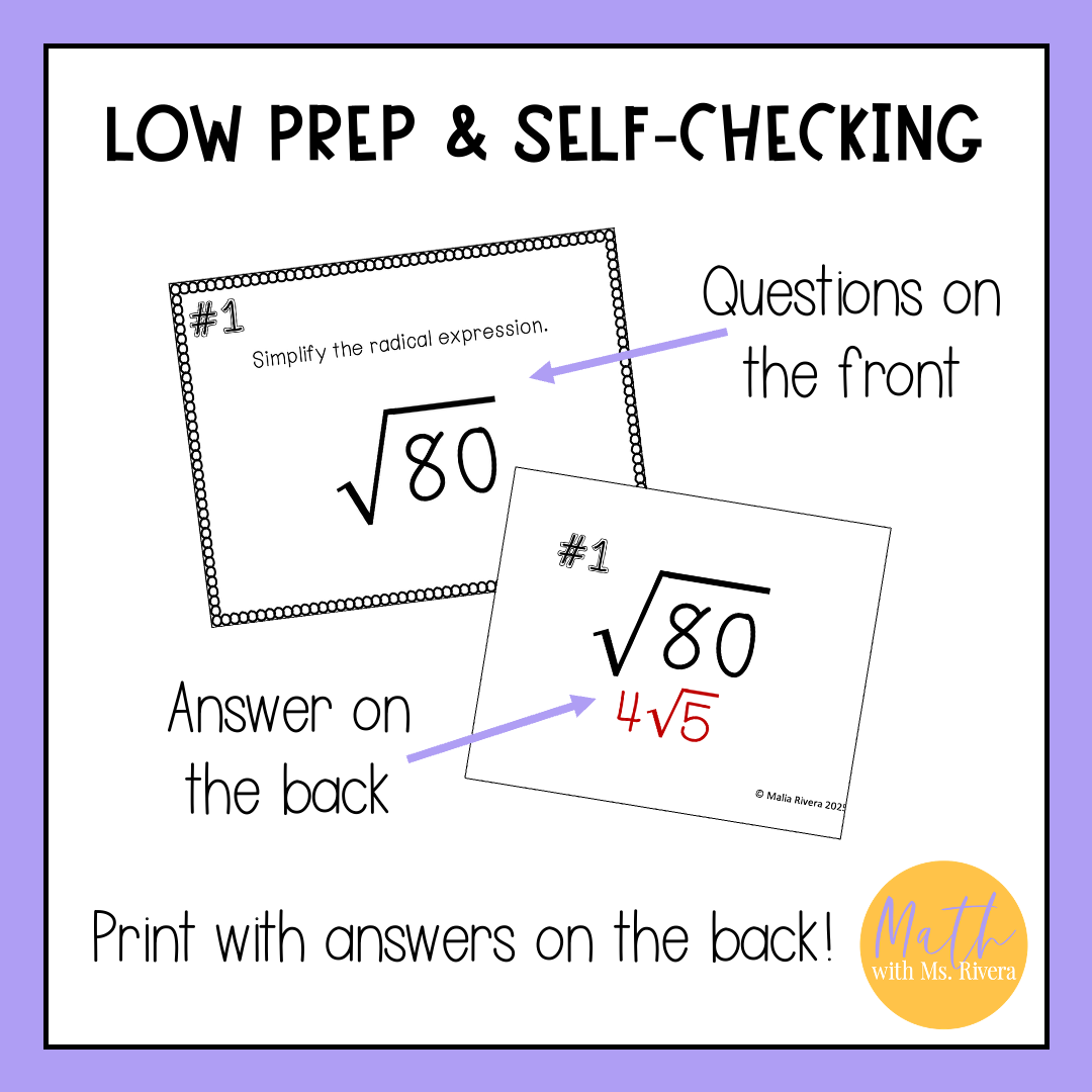 Looking for a self-checking, printable activity for your Algebra students to practice simplifying square root radical expressions? Look no further! This set of 20 self-checking task cards are just what you need!