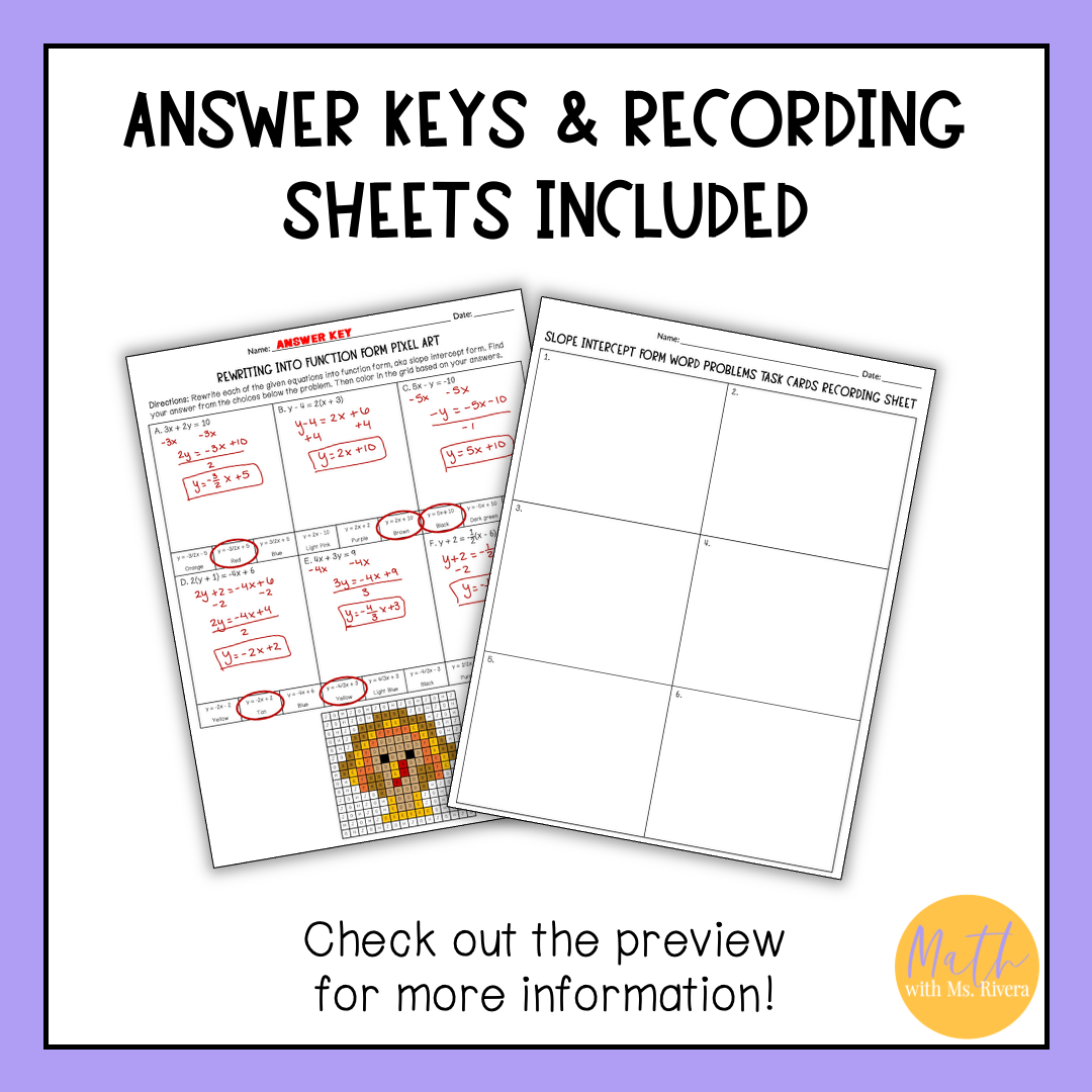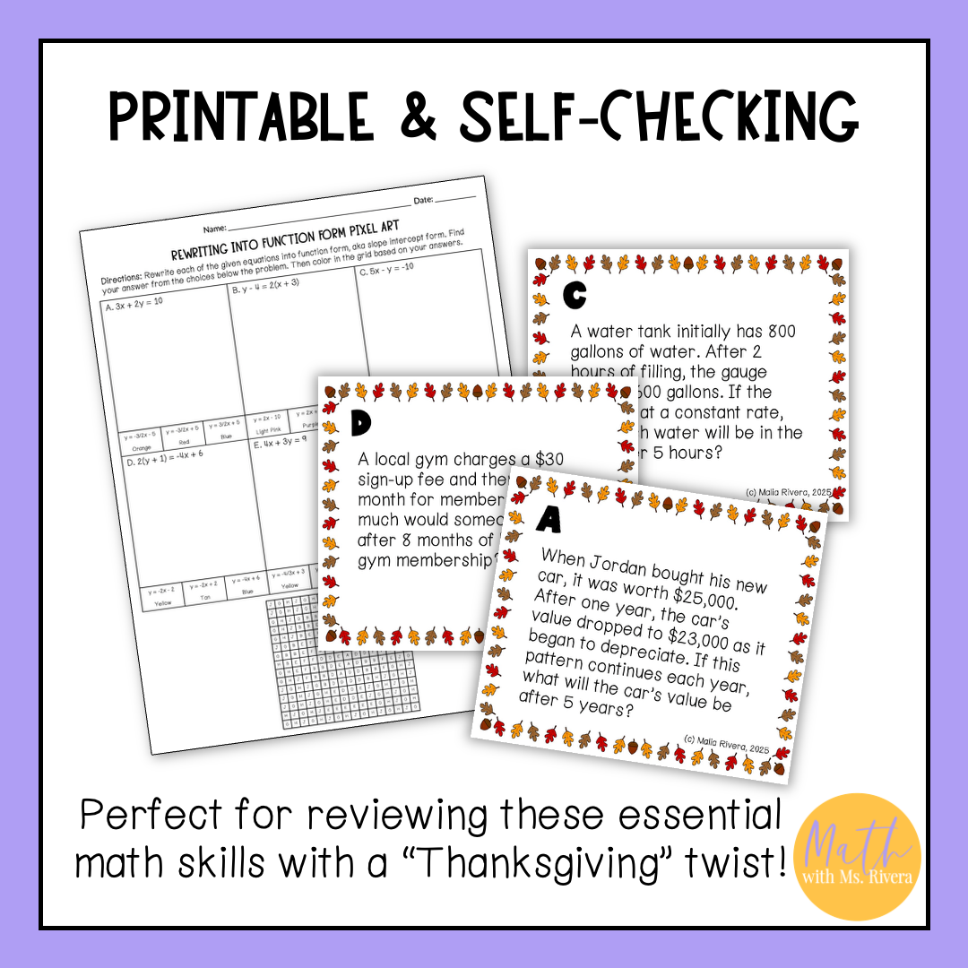 This Thanksgiving slope intercept review stations is just what you need to help your Algebra 1 student practice writing and graphing linear functions in slope intercept form! The 4 stations are self-checking to provide student feedback as they practice.