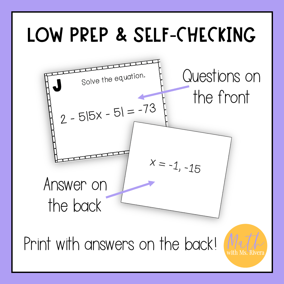 Looking for a self-checking printable activity for your Algebra 2 students to practice solving absolute value equations? Look no further! This set of 20 self-checking task cards are just what you need!