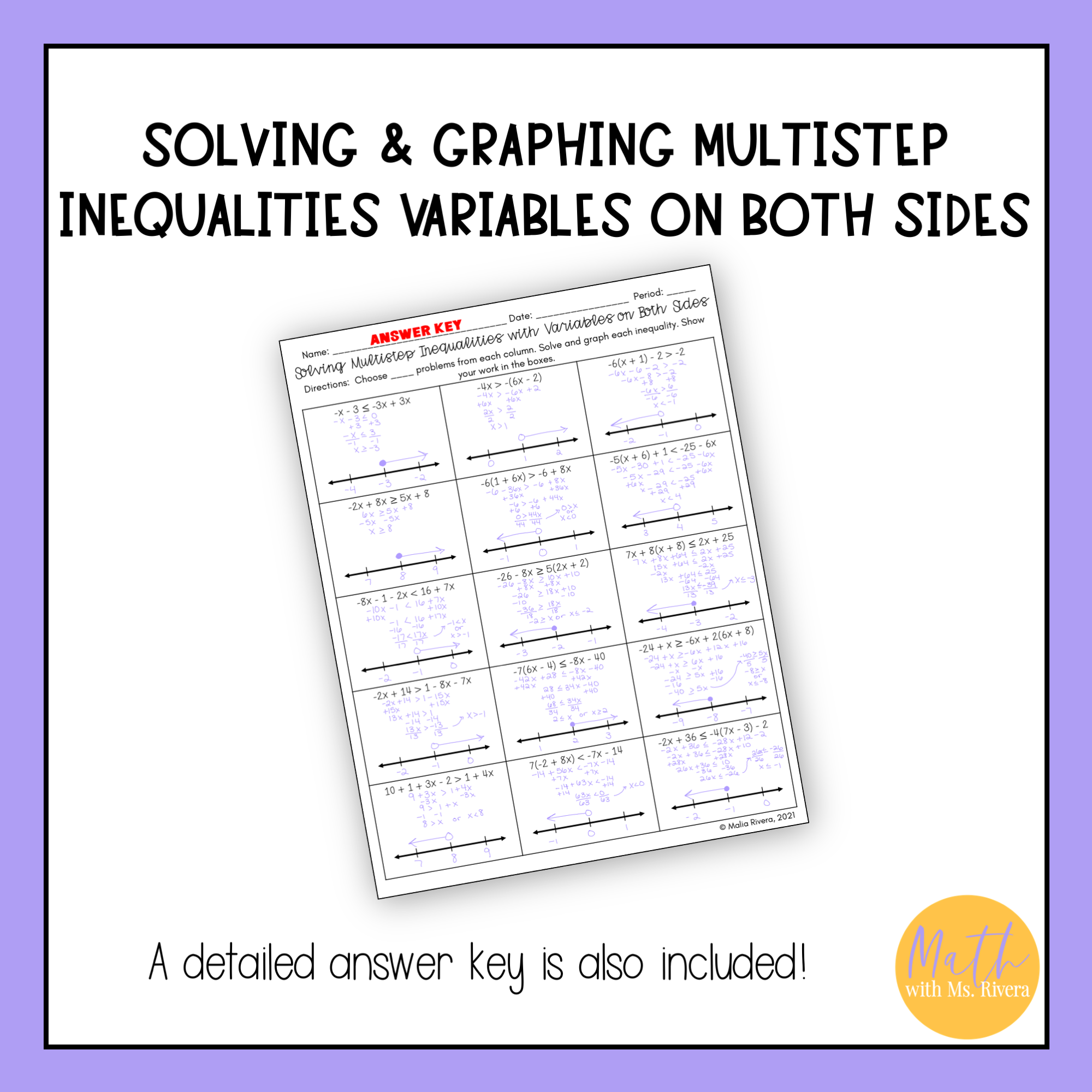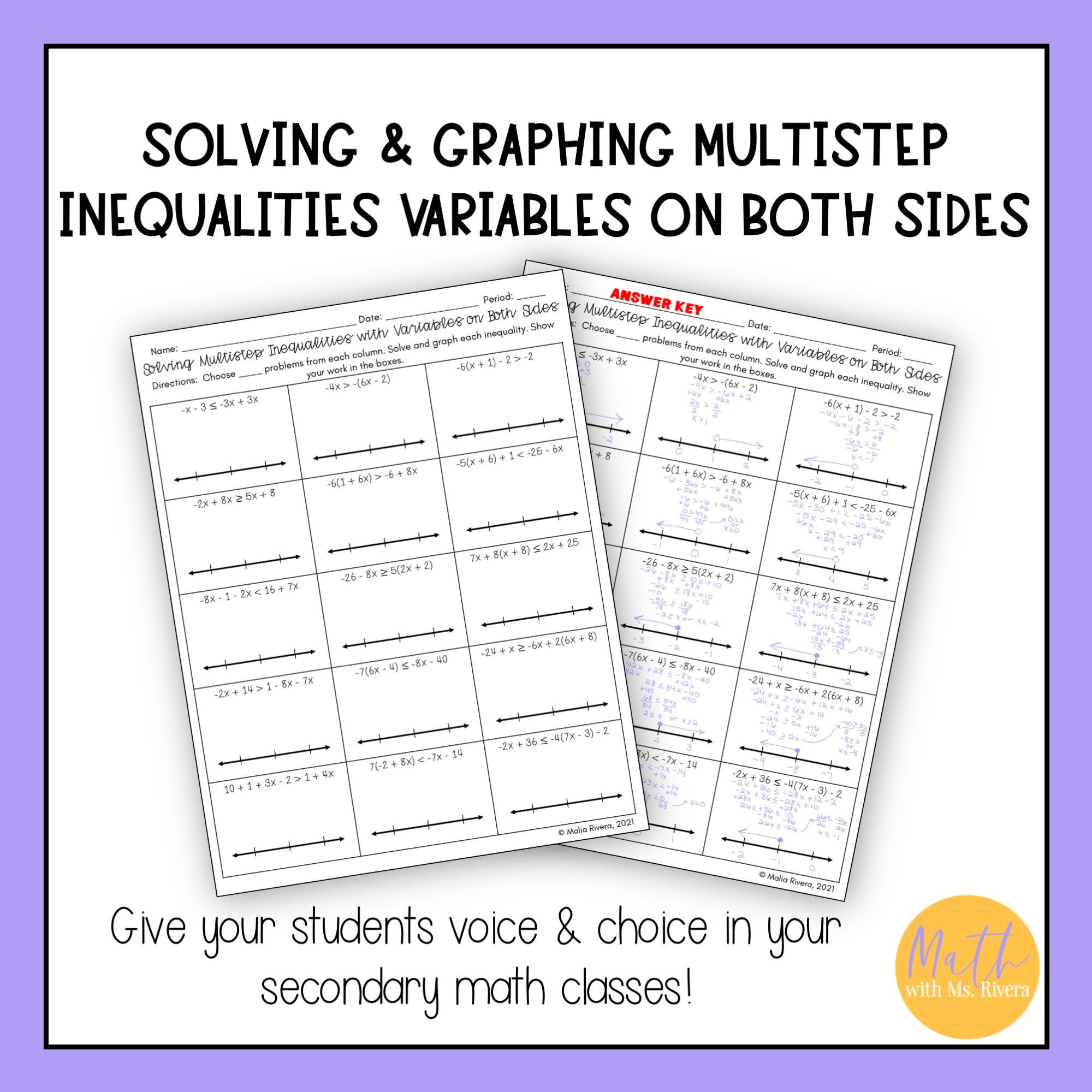 This differentiable choice board worksheet will have your Algebra 1 students practicing solving & graphing inequalities with variables on both sides. This choice board reviews how to solve and graph inequalities with variables with variables on both sides. See the thumbnails for examples of problems.