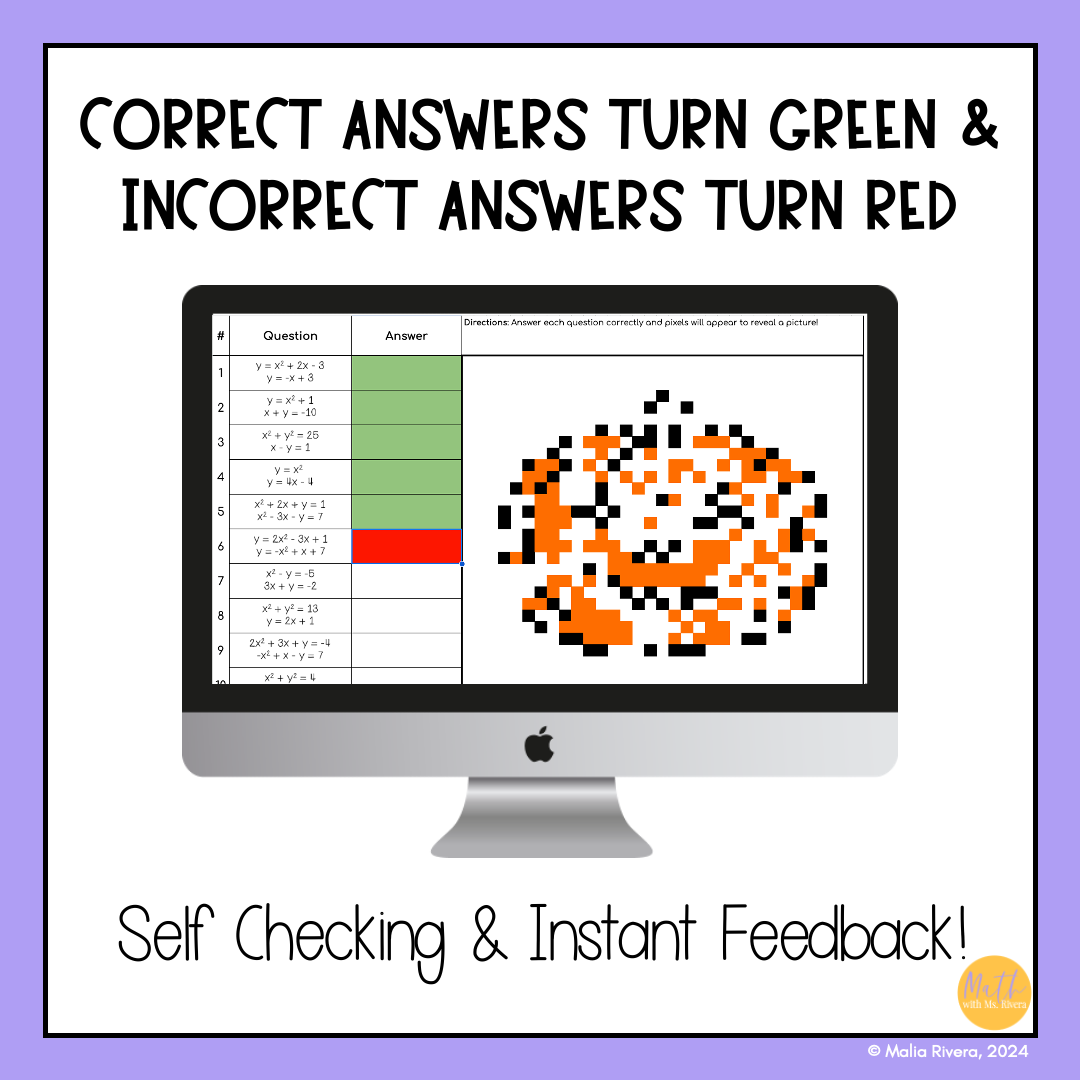 Are your Algebra 2 students struggling with nonlinear systems of equations? This Halloween themed self-checking digital pixel art activity will help your student practice solving linear-quadratic and quadratic-quadratic systems of equations. Solutions include no solution, one solution, and two solutions.