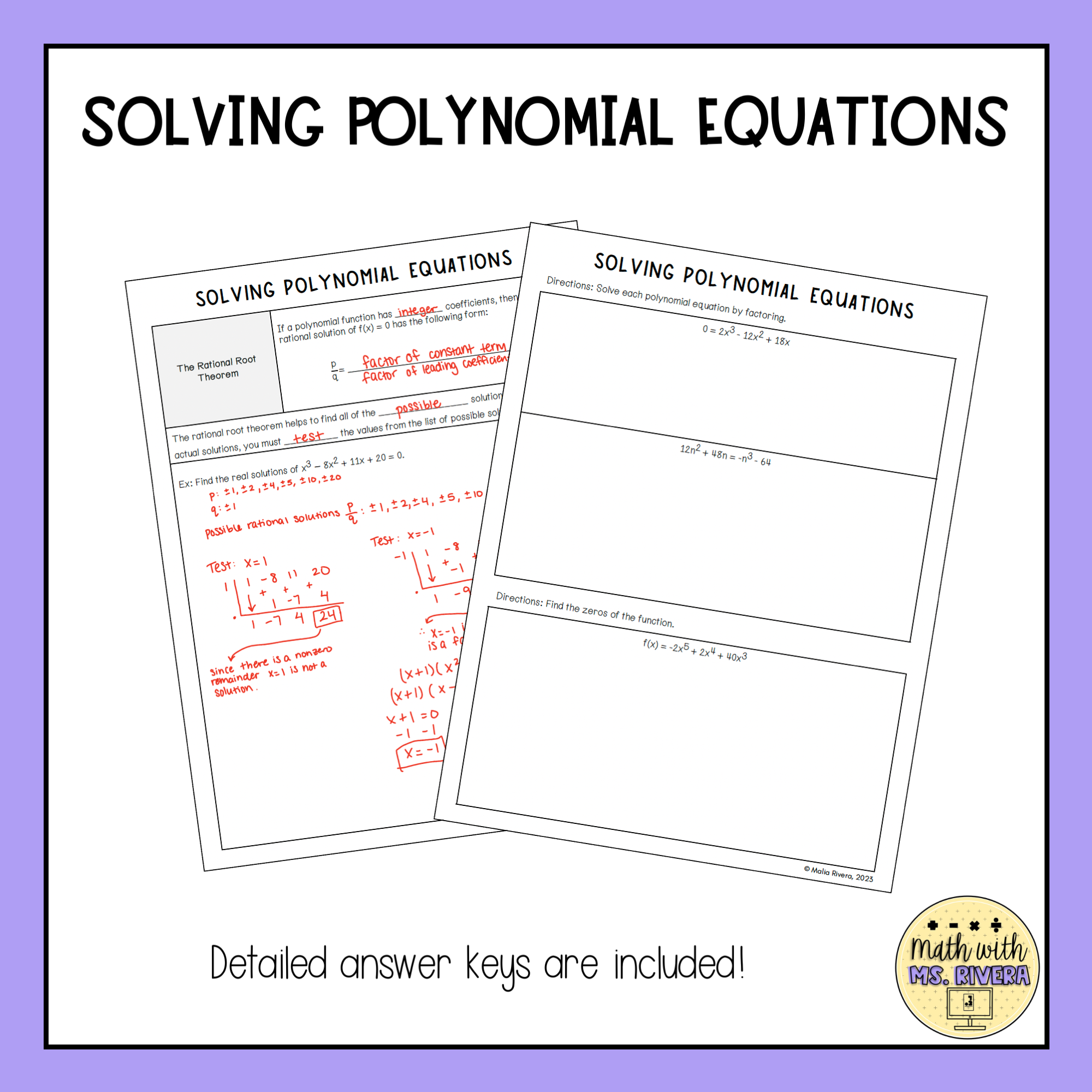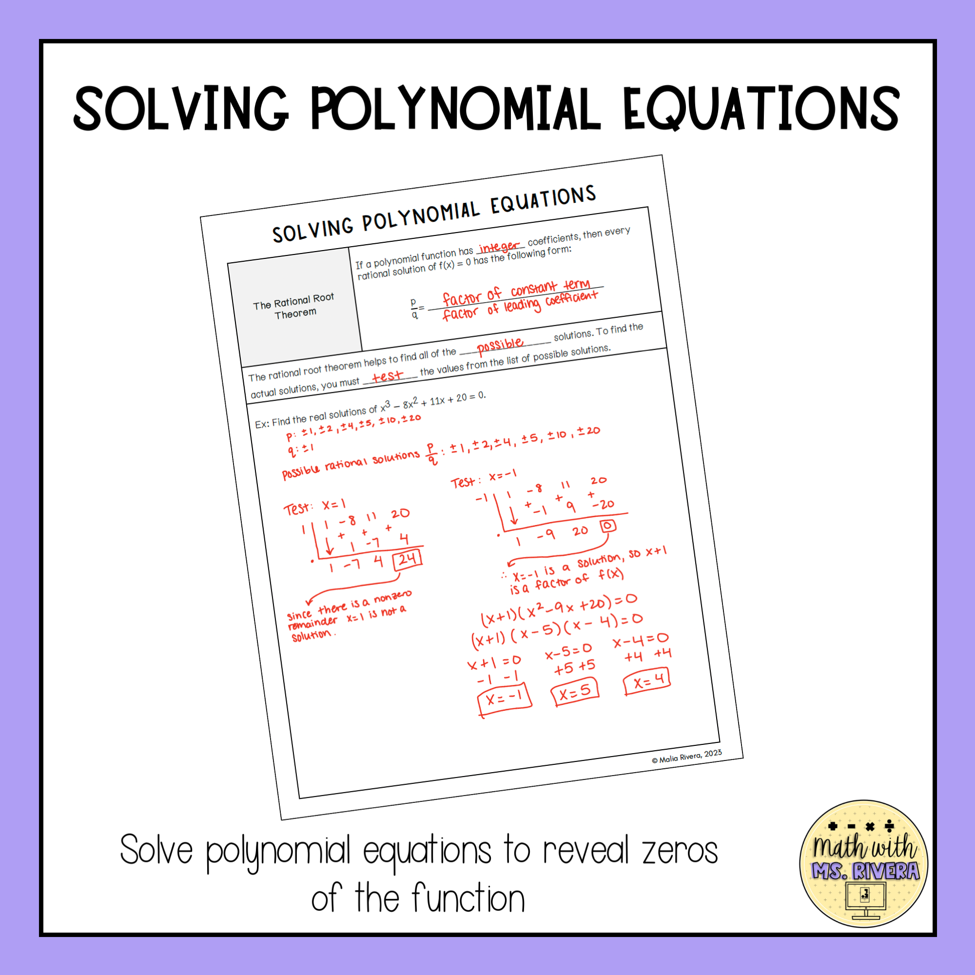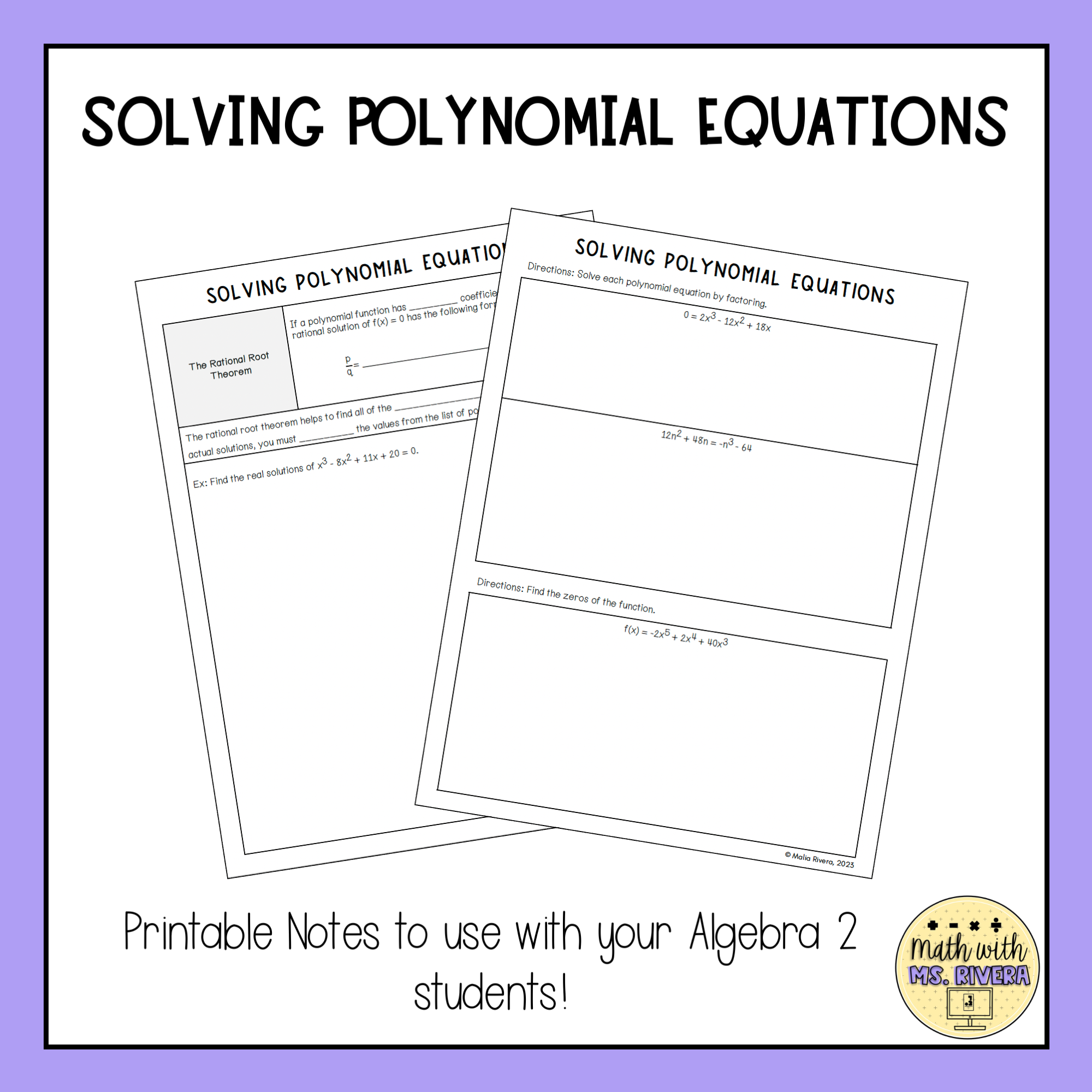 This guided notes lesson focuses on solving polynomial equations using methods commonly assessed in Algebra 2. Students begin by solving polynomial equations through factoring and then extend their understanding by finding zeros of functions. The lesson also introduces the Rational Root Theorem, helping students identify possible rational solutions and test them efficiently.