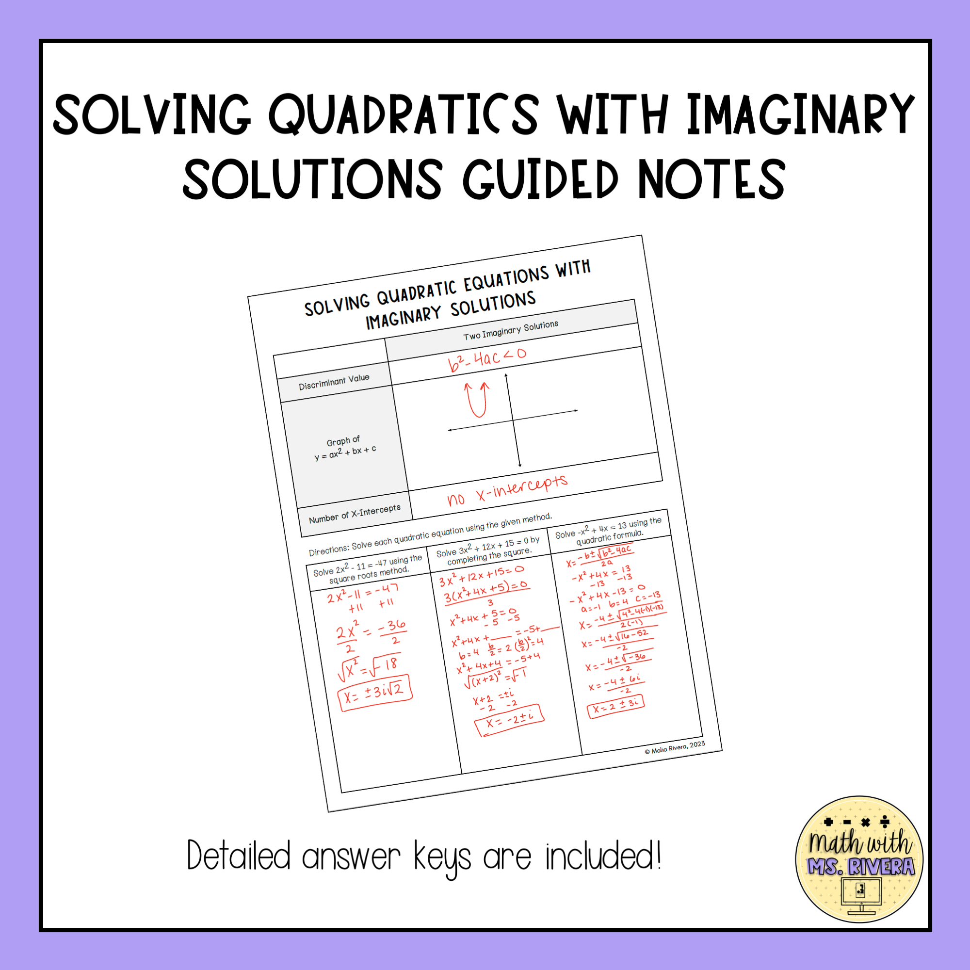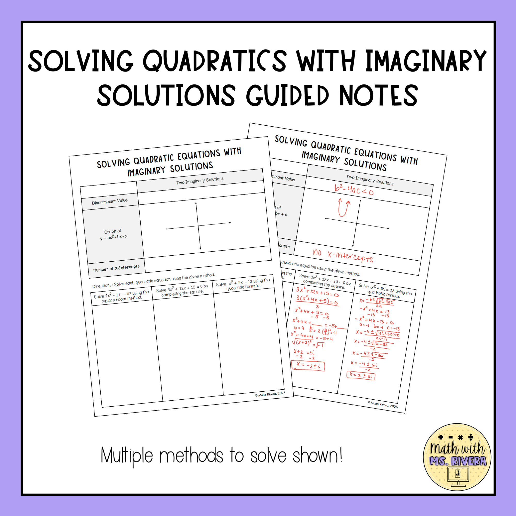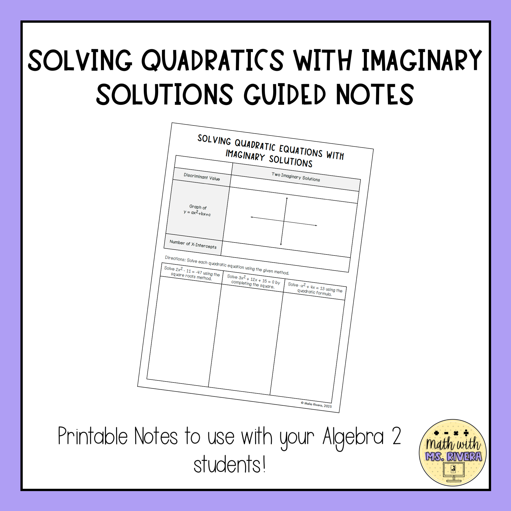 This set of guided notes will walk Algebra 2 students through solving quadratic equations with imaginary solutions. All you need to do is print & make copies for your students! A suggested, detailed answer key is included for all pages.