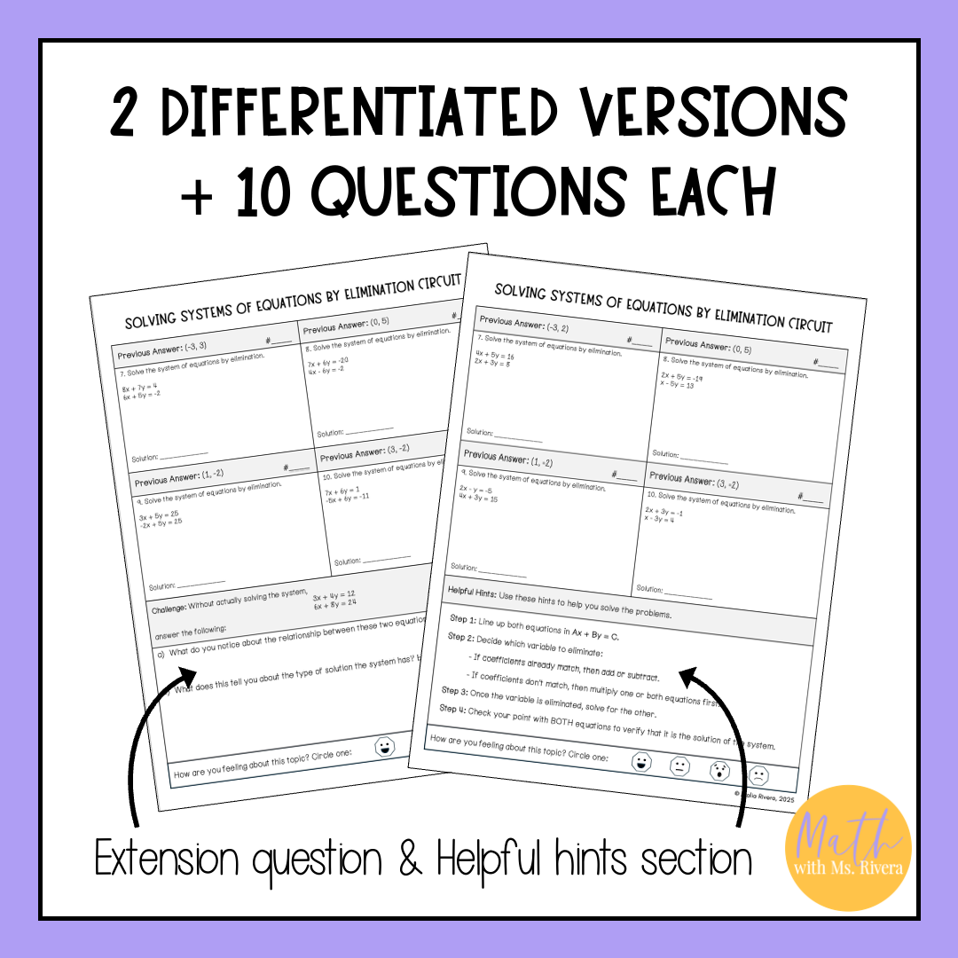 Looking for a way to help students solve systems of equations by elimination in Algebra 1? This self-checking, differentiated circuit worksheet gives students structured practice for solving systems of equations. The print-and-go format builds accuracy and fluency while reinforcing using the elimination method for solving systems of equations through built-in accountability.