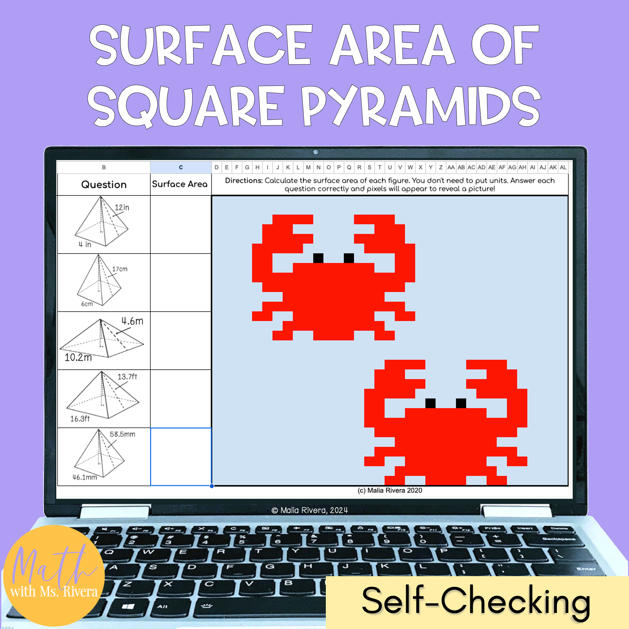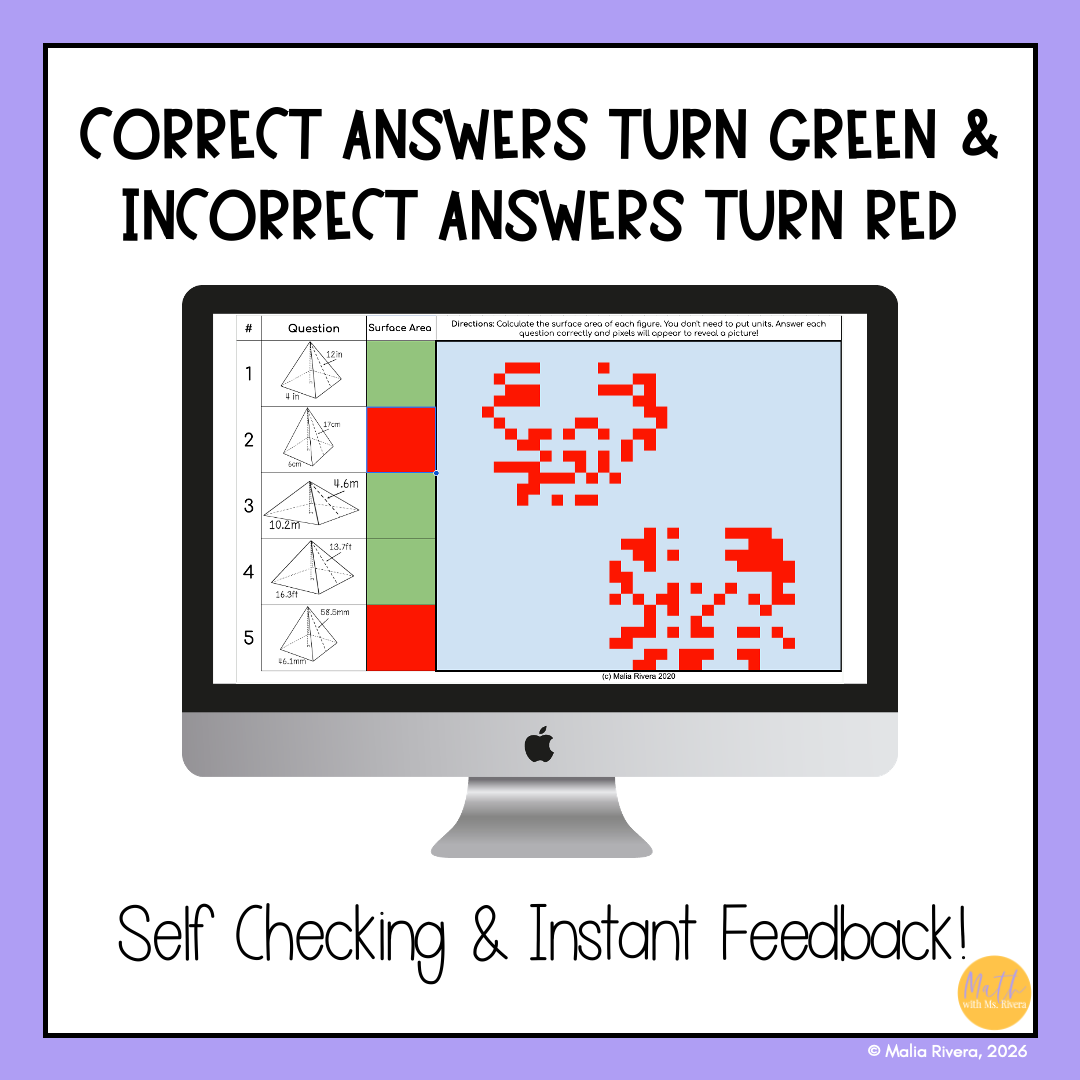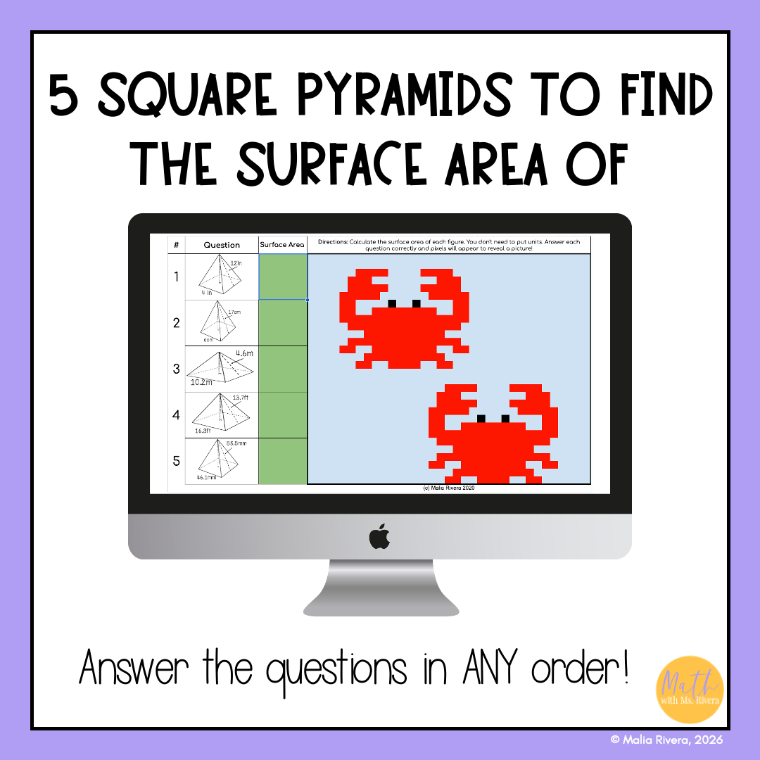 Help your 8th grade students practice finding the surface area of square pyramids with this self-checking digital pixel art activity. Students calculate the surface area of square-based pyramids while applying their understanding of pyramid nets and surface area formulas.
