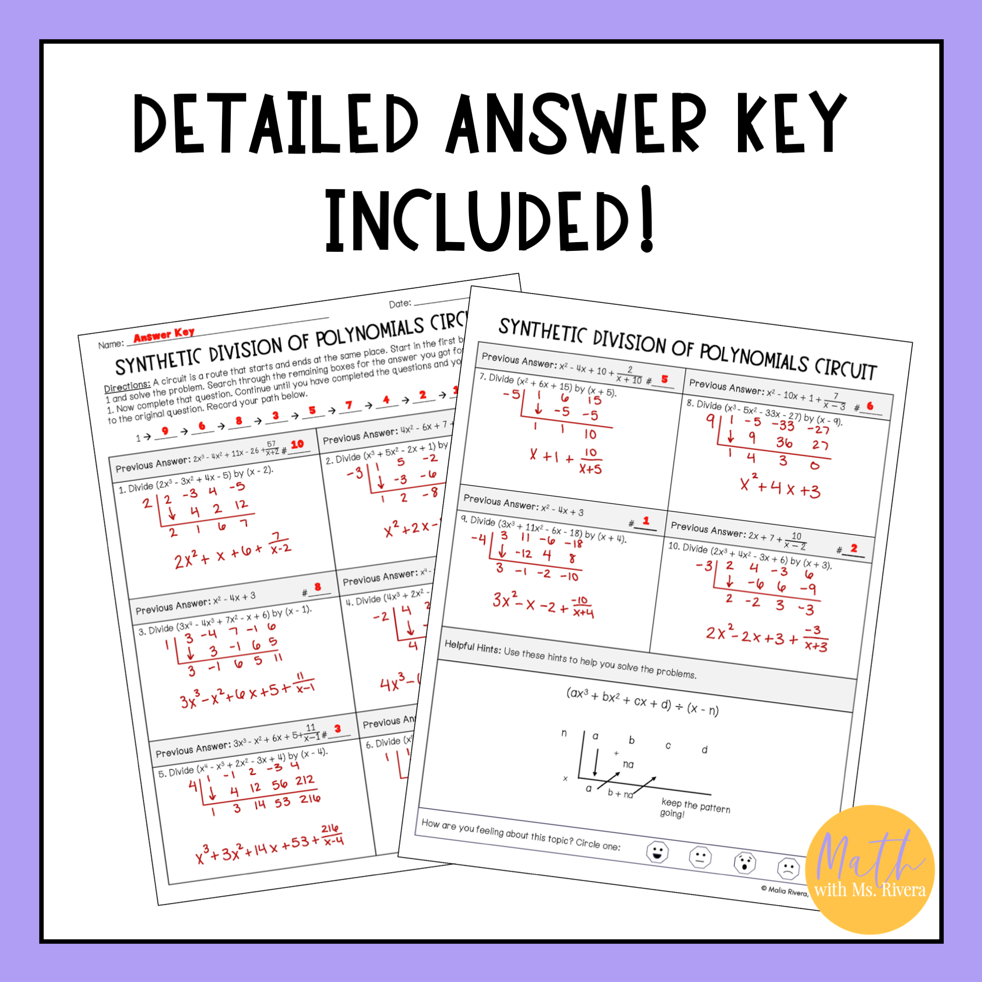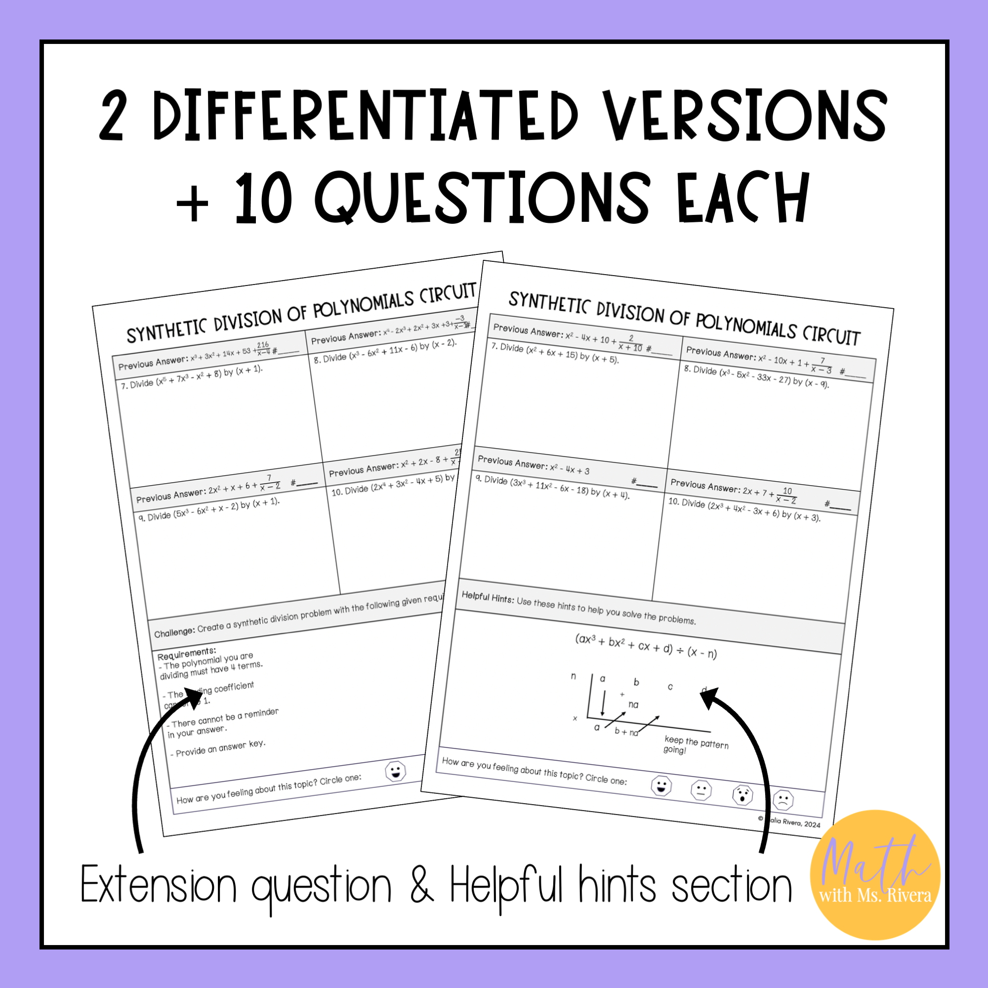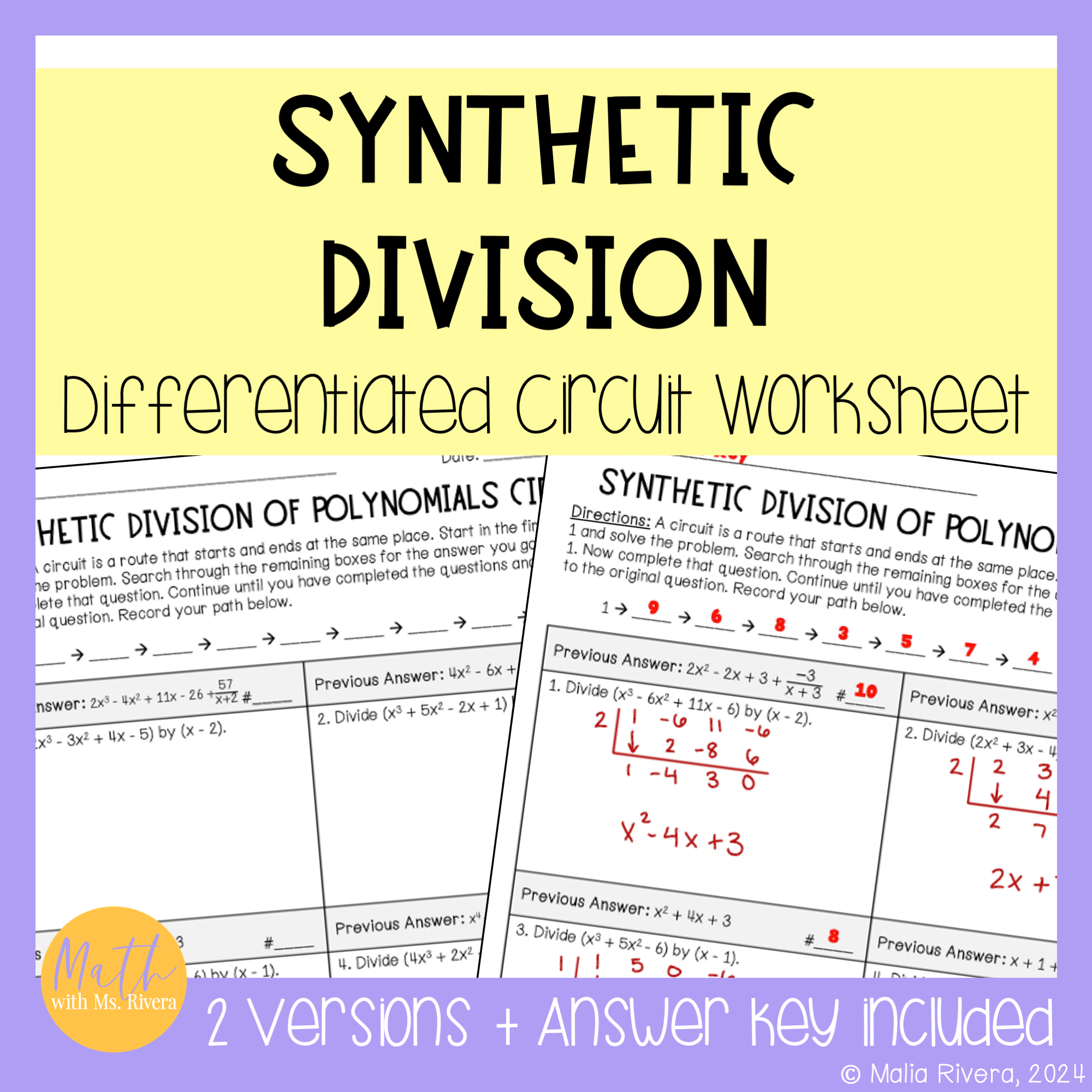 Are you looking for a worksheet to practice dividing polynomials using synthetic division? Check out this differentiated circuit worksheet! This self-checking worksheet has 10 problems on each version and is designed for students to check their answers as they work.