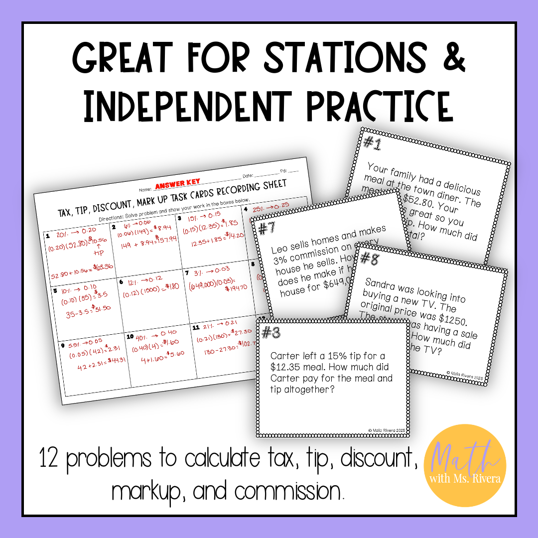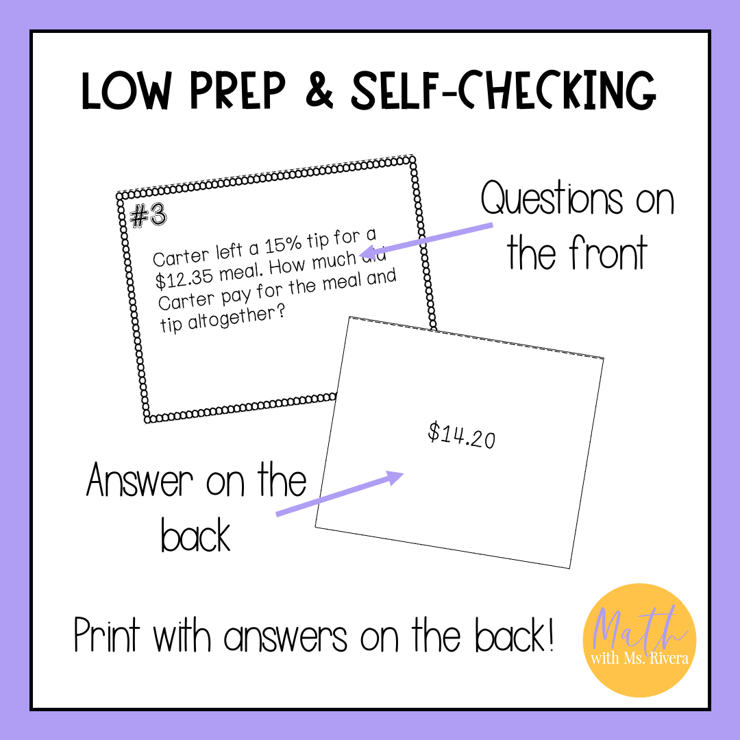 Looking for a self-checking printable activity for your math students to practice finding tax, tip, discount and markup? Look no further! This self-checking task cards activity are just what you need!