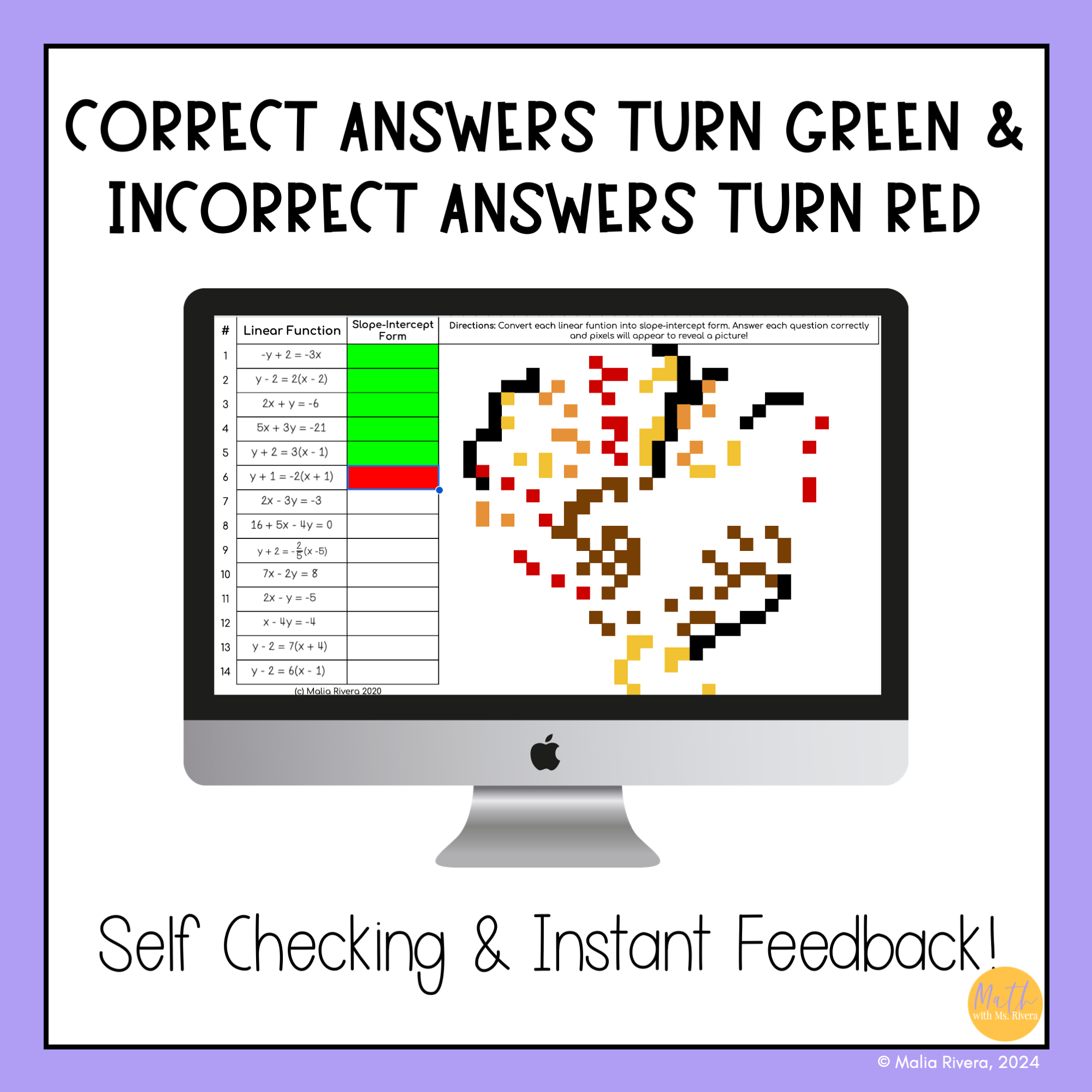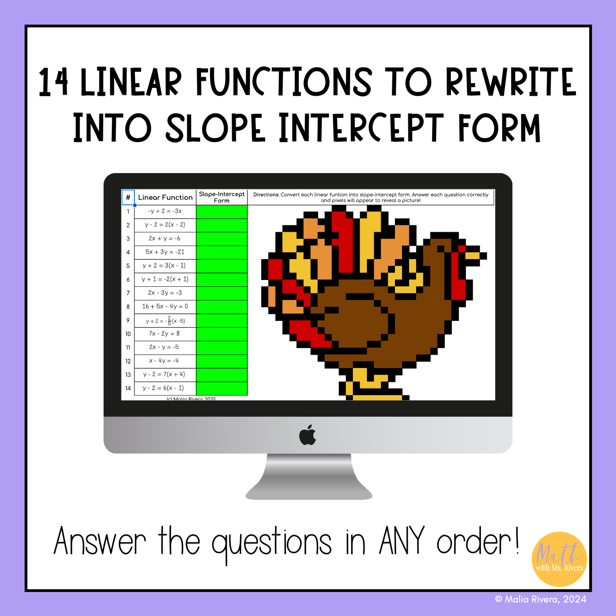 Are your Algebra students struggling with writing linear equations in slope intercept form? This Thanksgiving themed self-checking digital pixel art activity will help your student practice writing in slope intercept form from other linear equations.