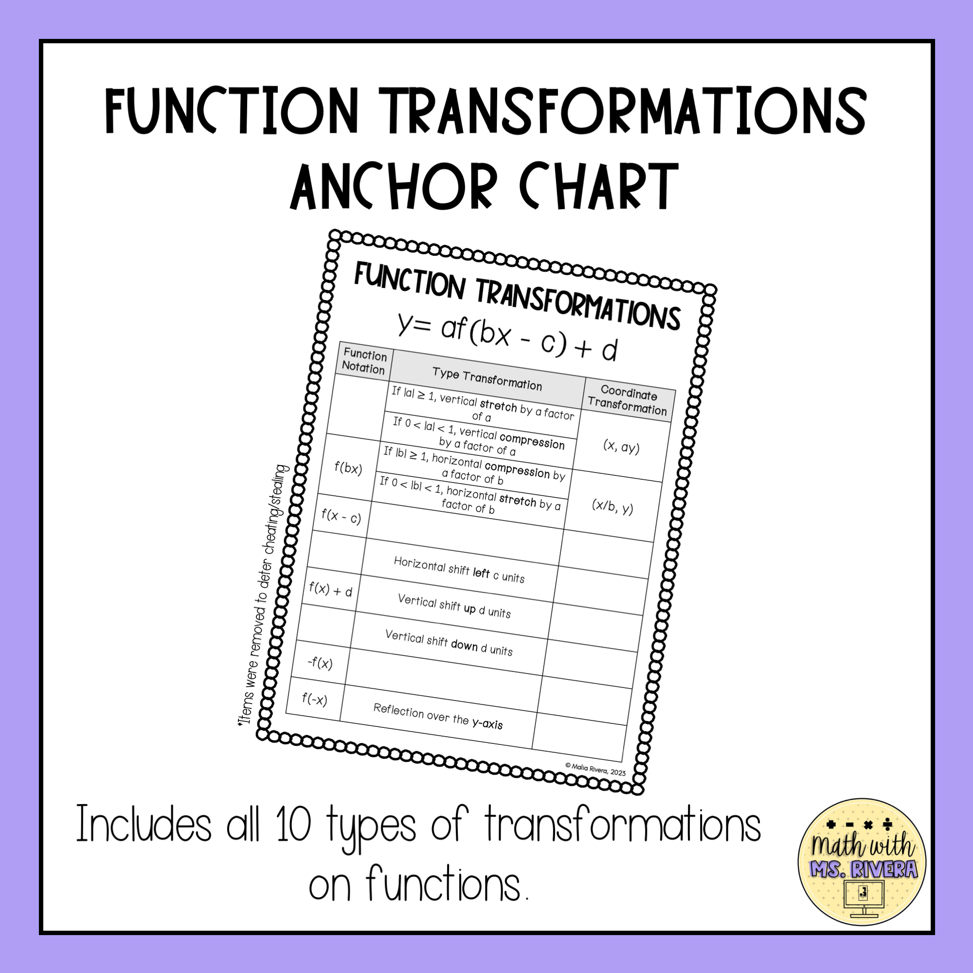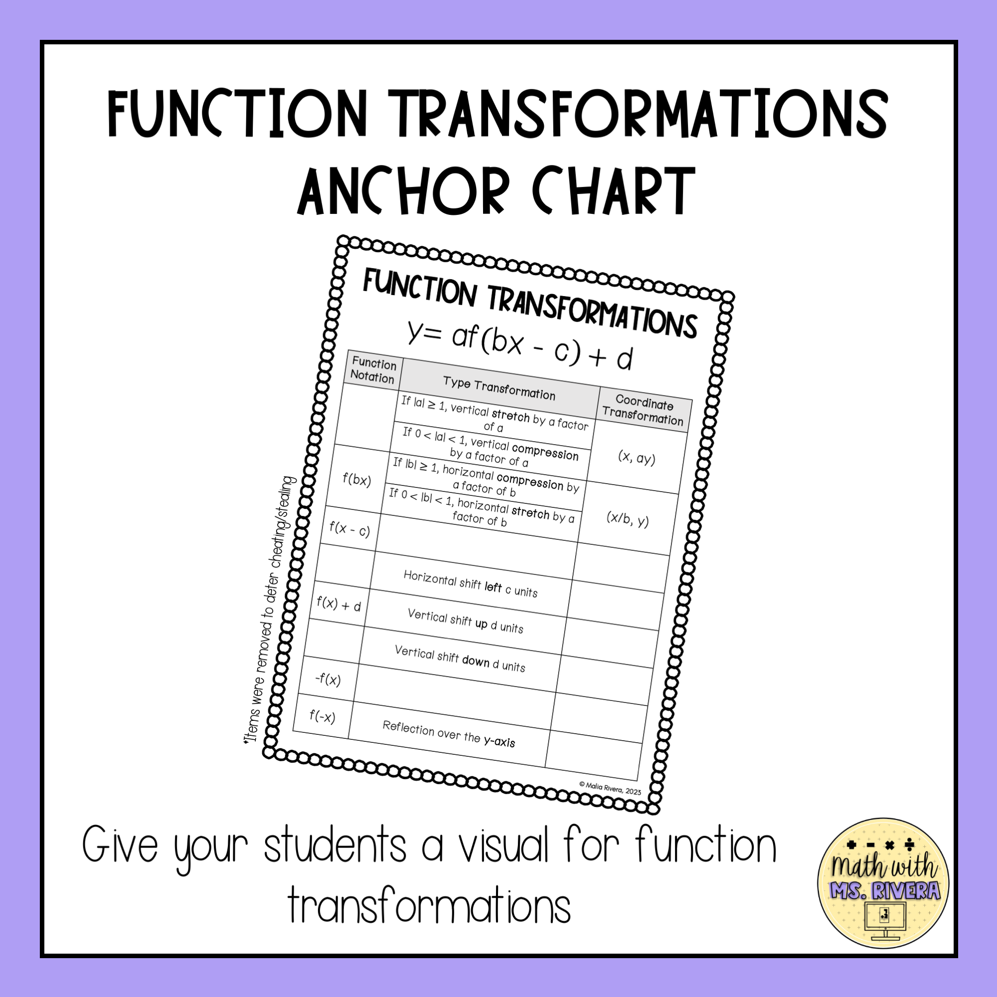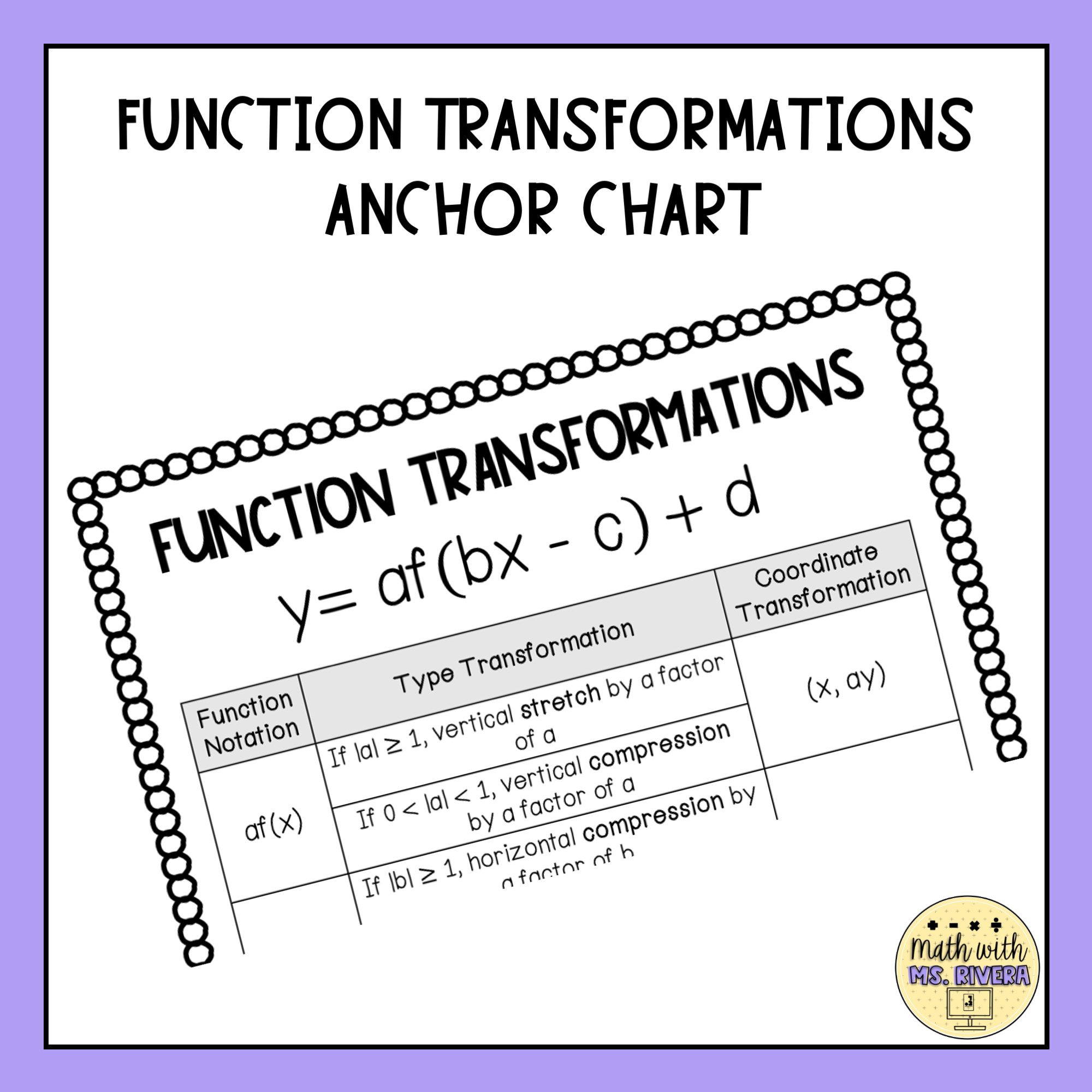 This one-page anchor chart helps Algebra 2 and Precalculus students review function transformations. The chart shows shifts, stretches, compressions, and reflections in a simple, clear format.