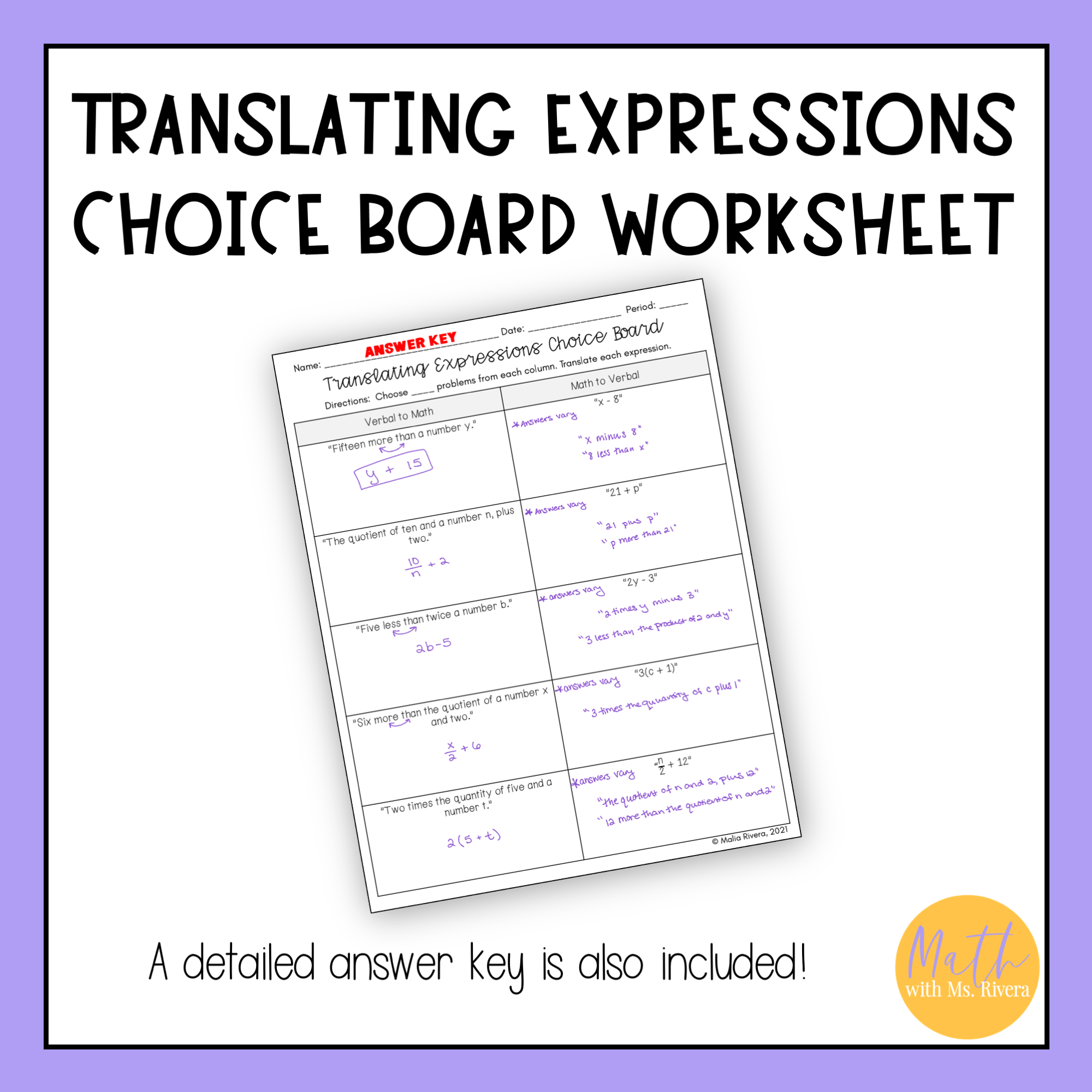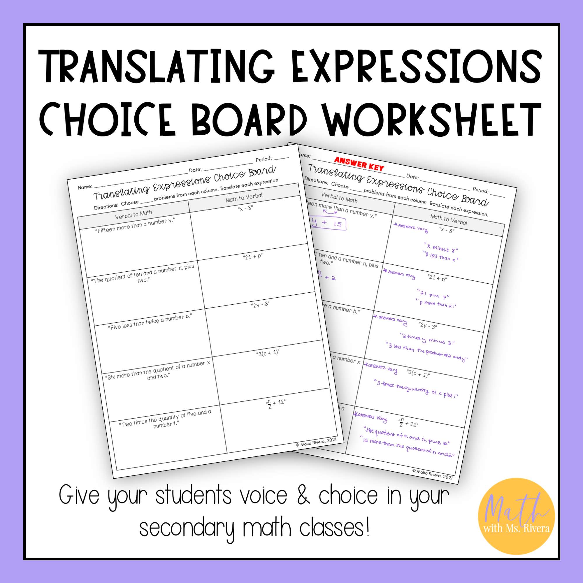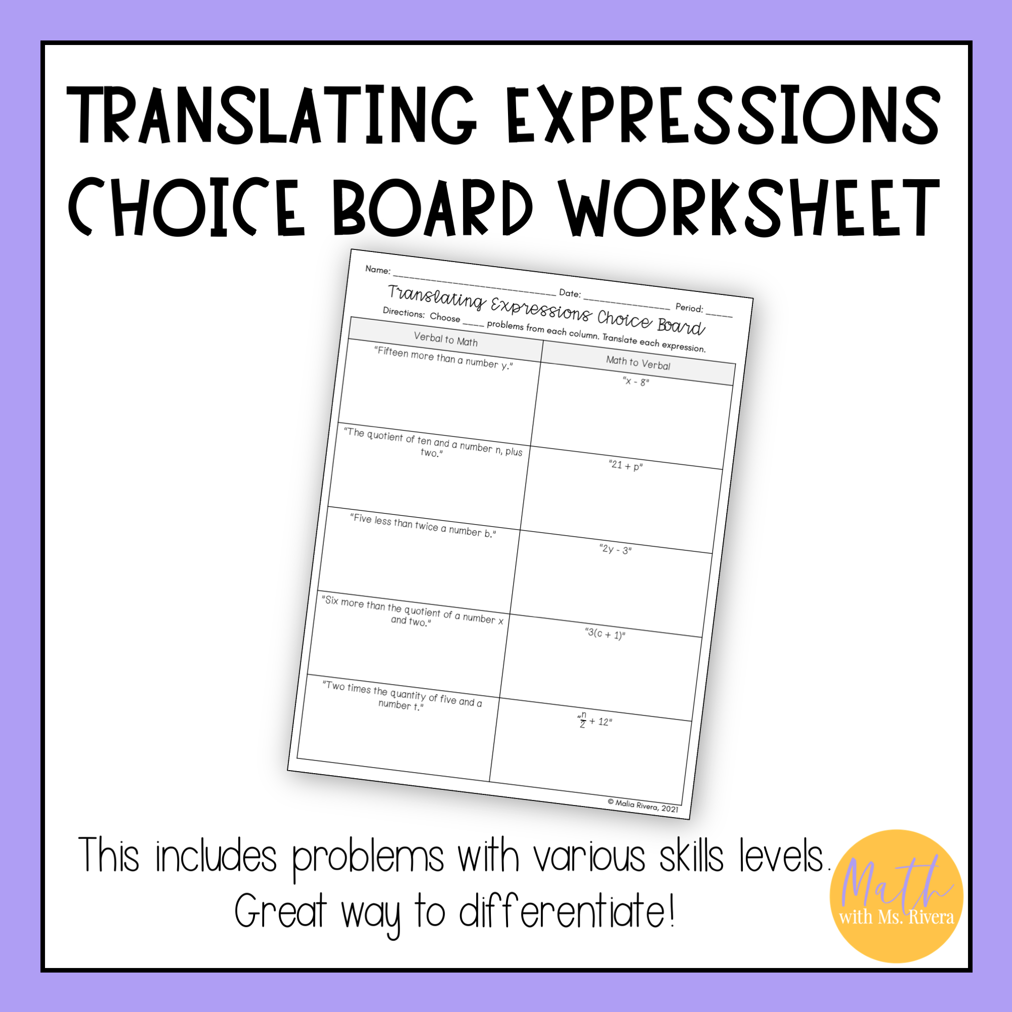 This differentiable choice board worksheet will have your Algebra 1 students practicing translating algebraic expressions to and from verbal and mathematical expressions. This choice board reviews how to translate between verbal and mathematical expressions. See the thumbnails for examples of problems.