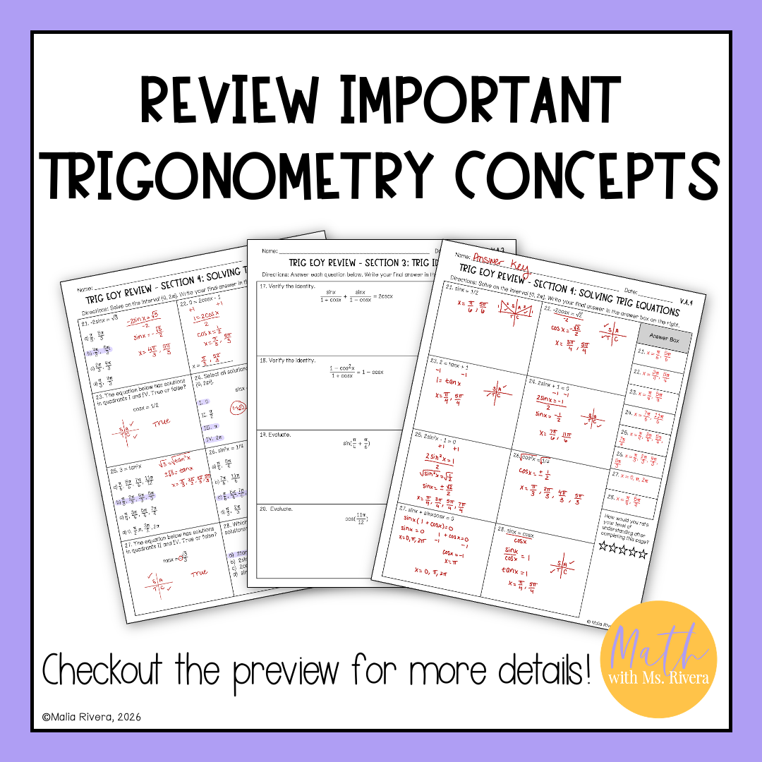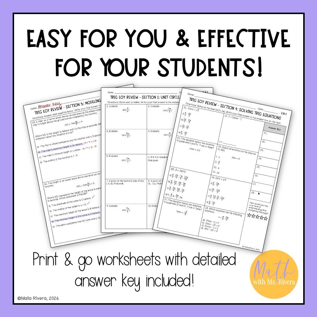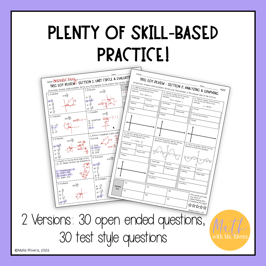 Each version has 30 thoughtfully designed problems across 5 sections that reinforce key Trigonometric skills, helping students be accountable for what they learned throughout the year.