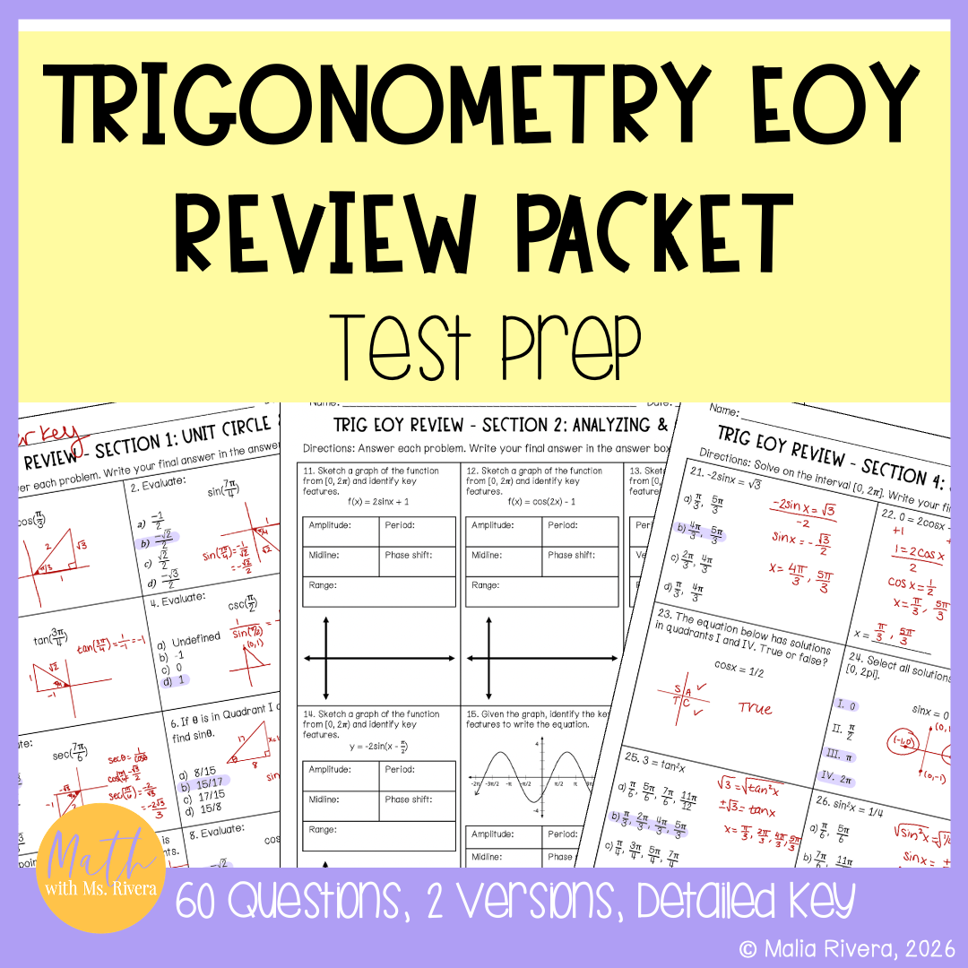 Need an easy way to help your Trigonometry PreCalculus students review for the end of year final exam? This Trigonometry Test Prep Review Packet includes 60 questions and 2 versions that cover essential Trigonometric concepts without the overwhelm!