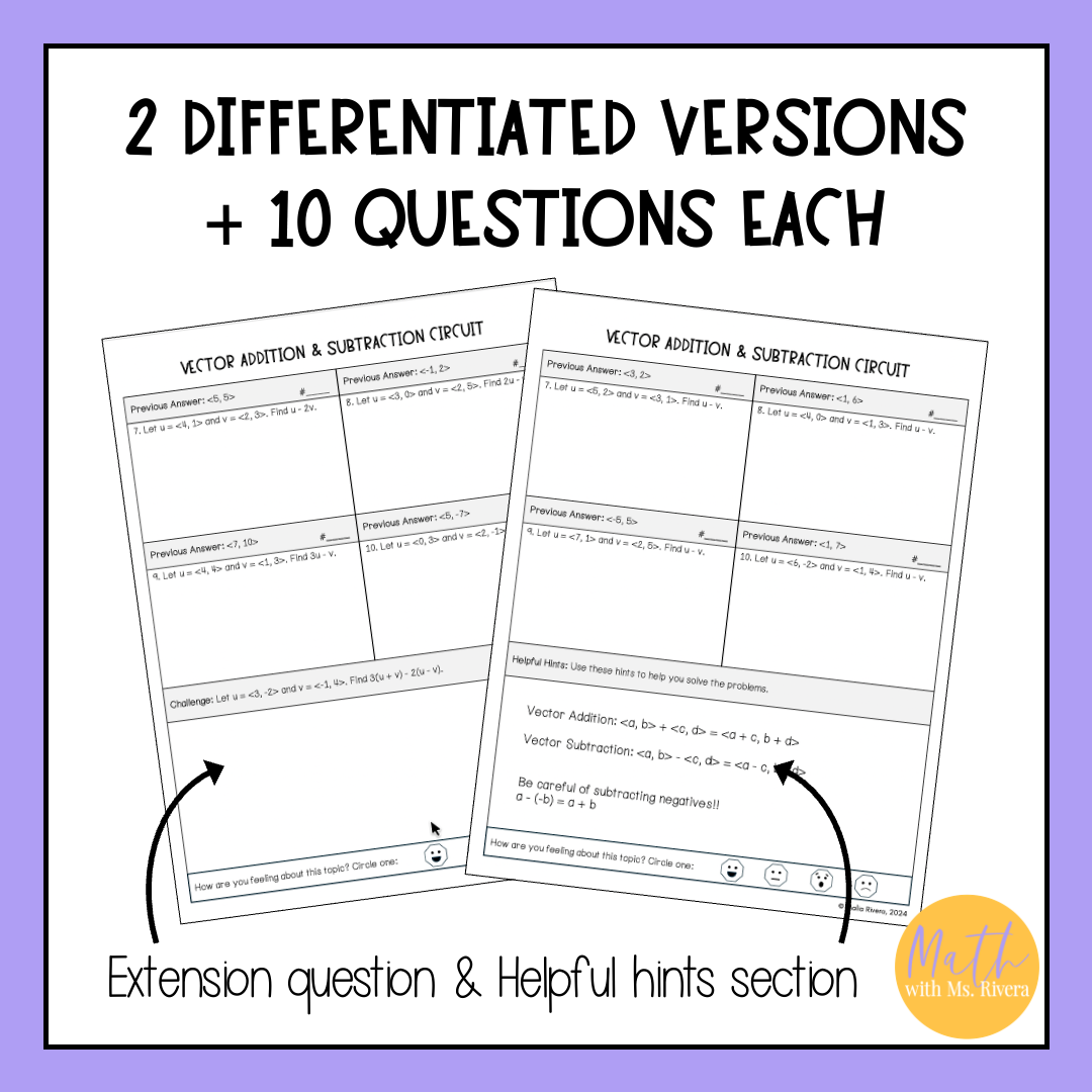 You can use this worksheet right after teaching vector operations by giving students the version that best fits their needs. As students solve each expression and move through the circuit, they get immediate feedback from the path they follow. When they finish, students can complete the self-assessment to reflect on their understanding before class ends.