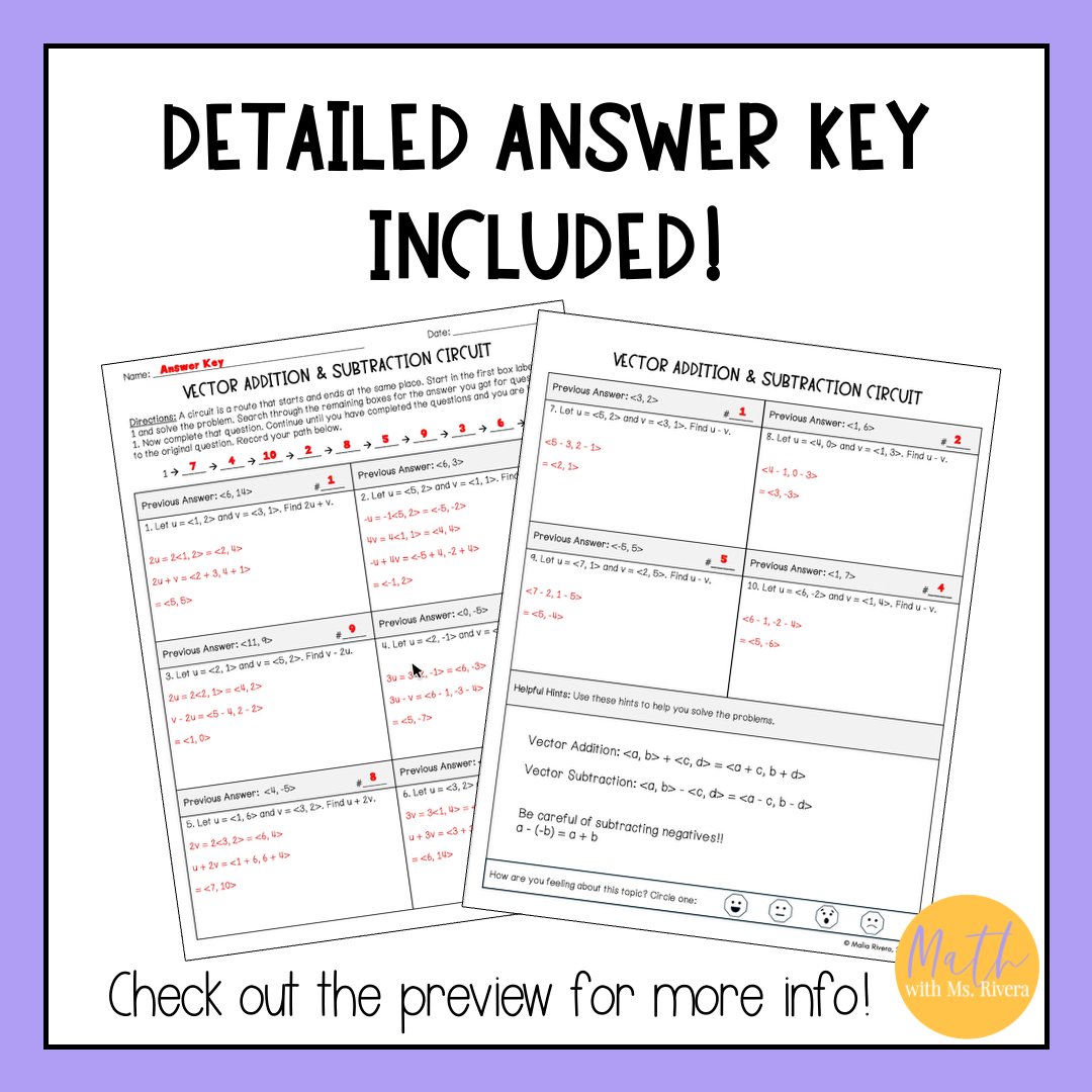 Students begin with problem #1 and solve the vector expression. They search the worksheet for their answer and complete the problem found in that box next. This continues until they return to the starting problem and close the circuit. The standard version includes a challenge problem, while the basic version includes helpful hints for extra support. Answer keys are included for quick checking.