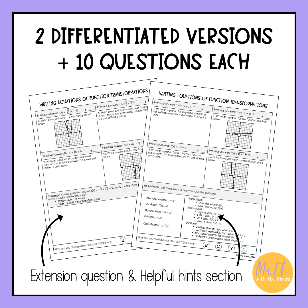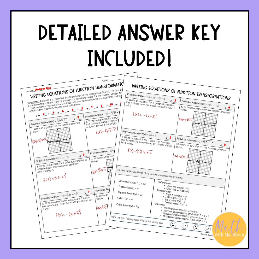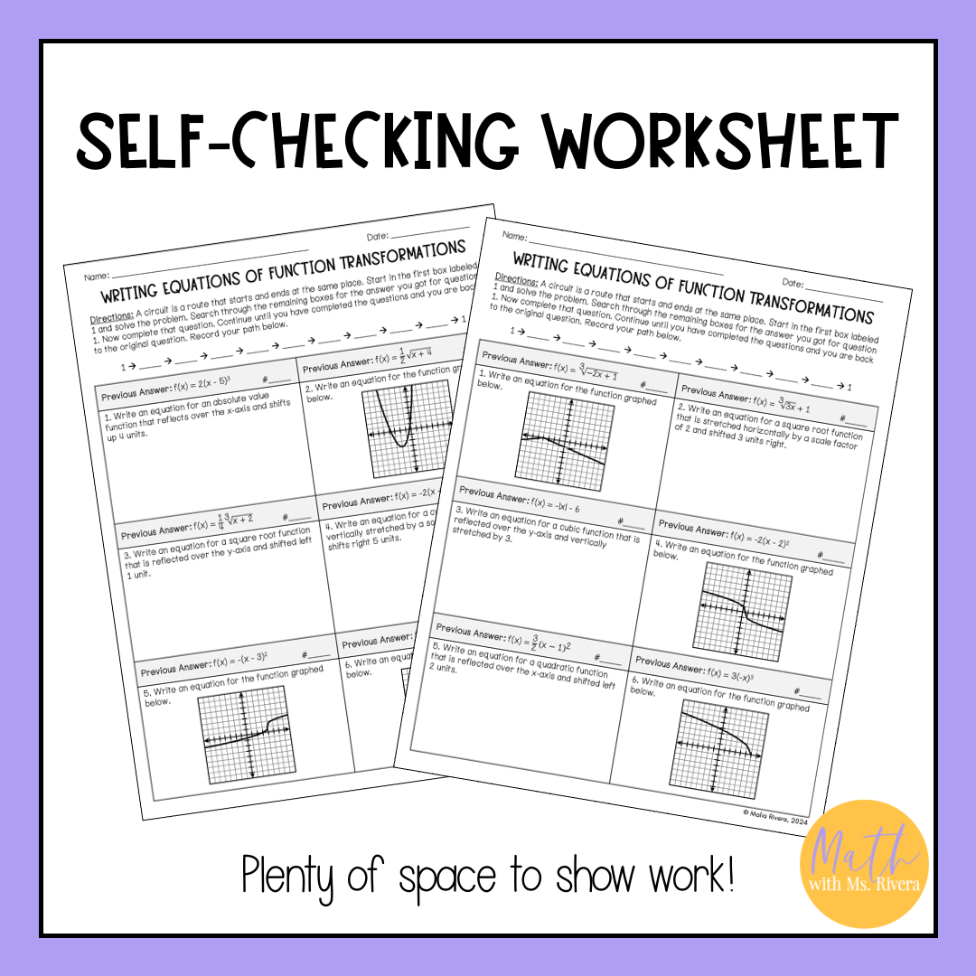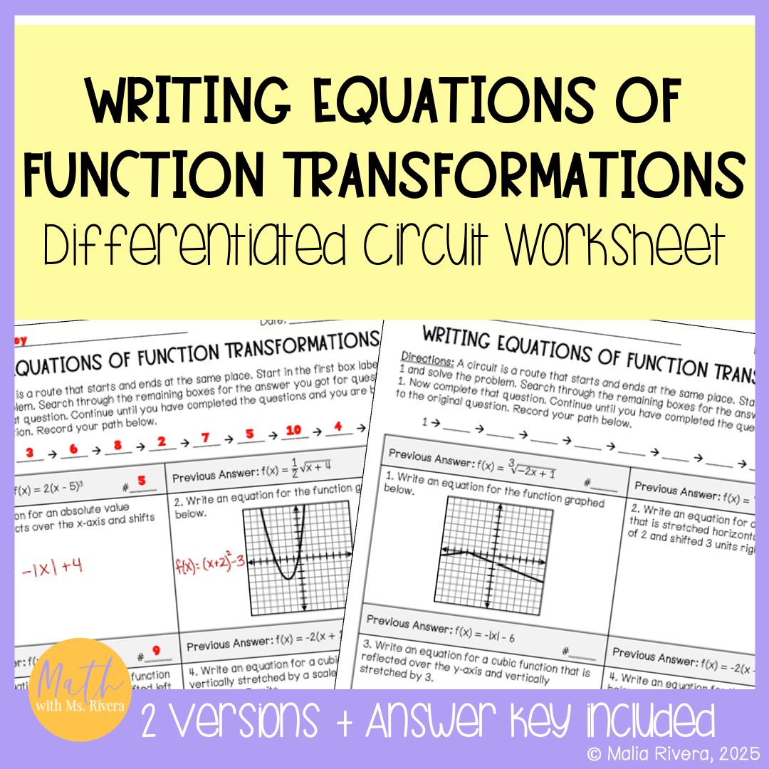 Are you looking for a worksheet to practice writing equations of transformations of parent functions? Check out this differentiated circuit worksheet on writing equations of transformed parent functions from graphs and a set of transformations! This self-checking worksheet has 10 problems on each version and is designed for students to check their answers as they work.