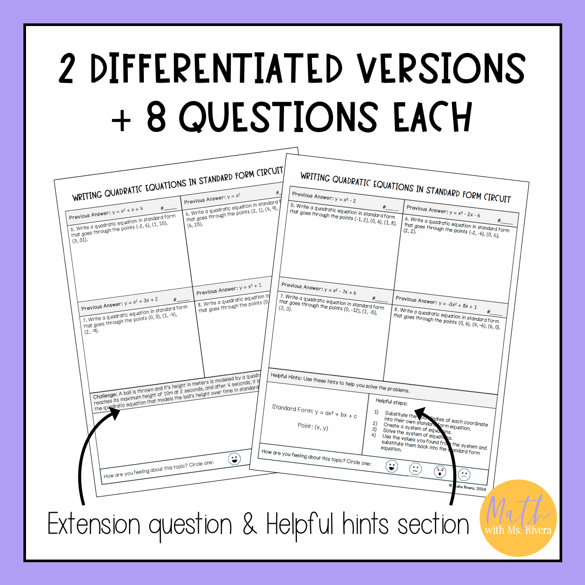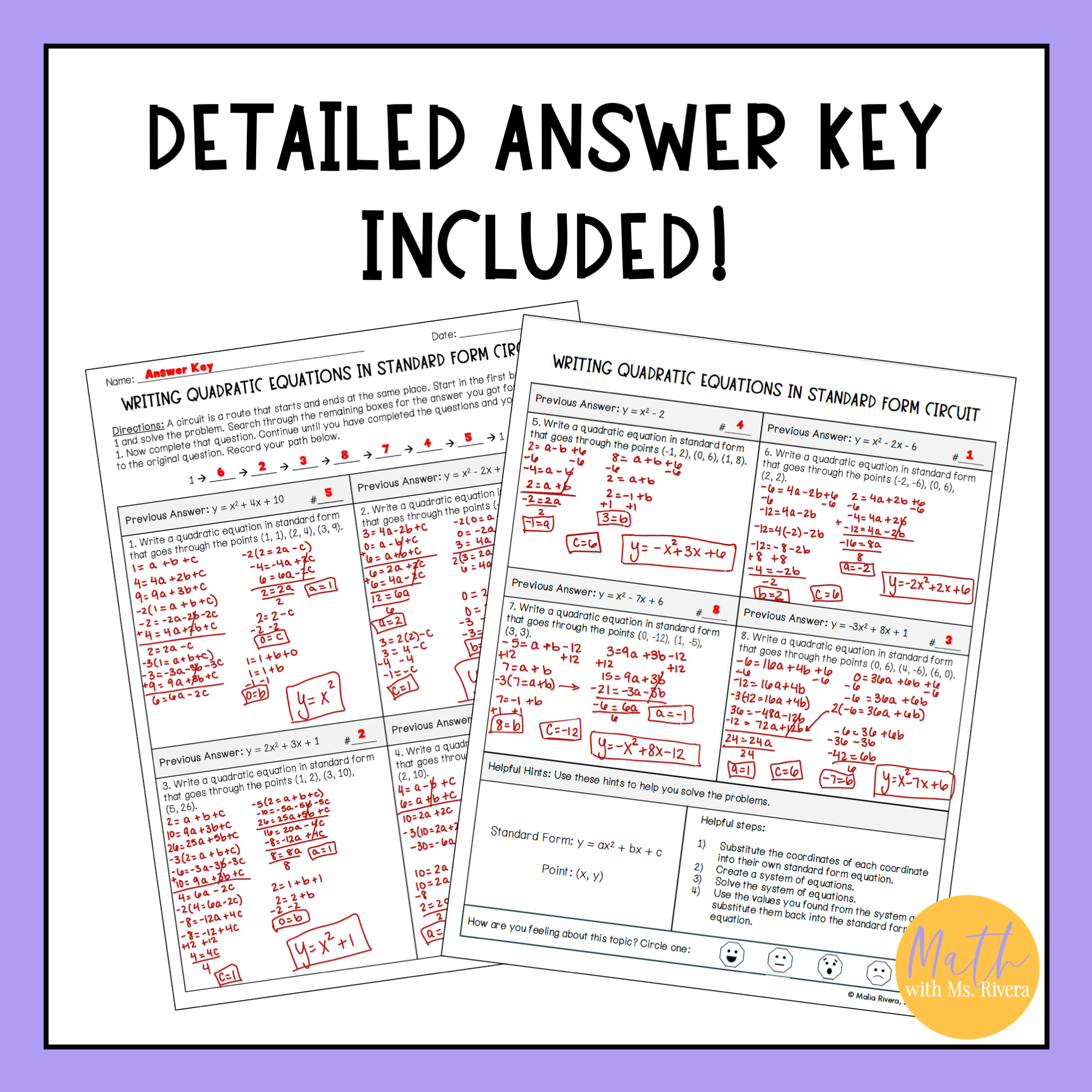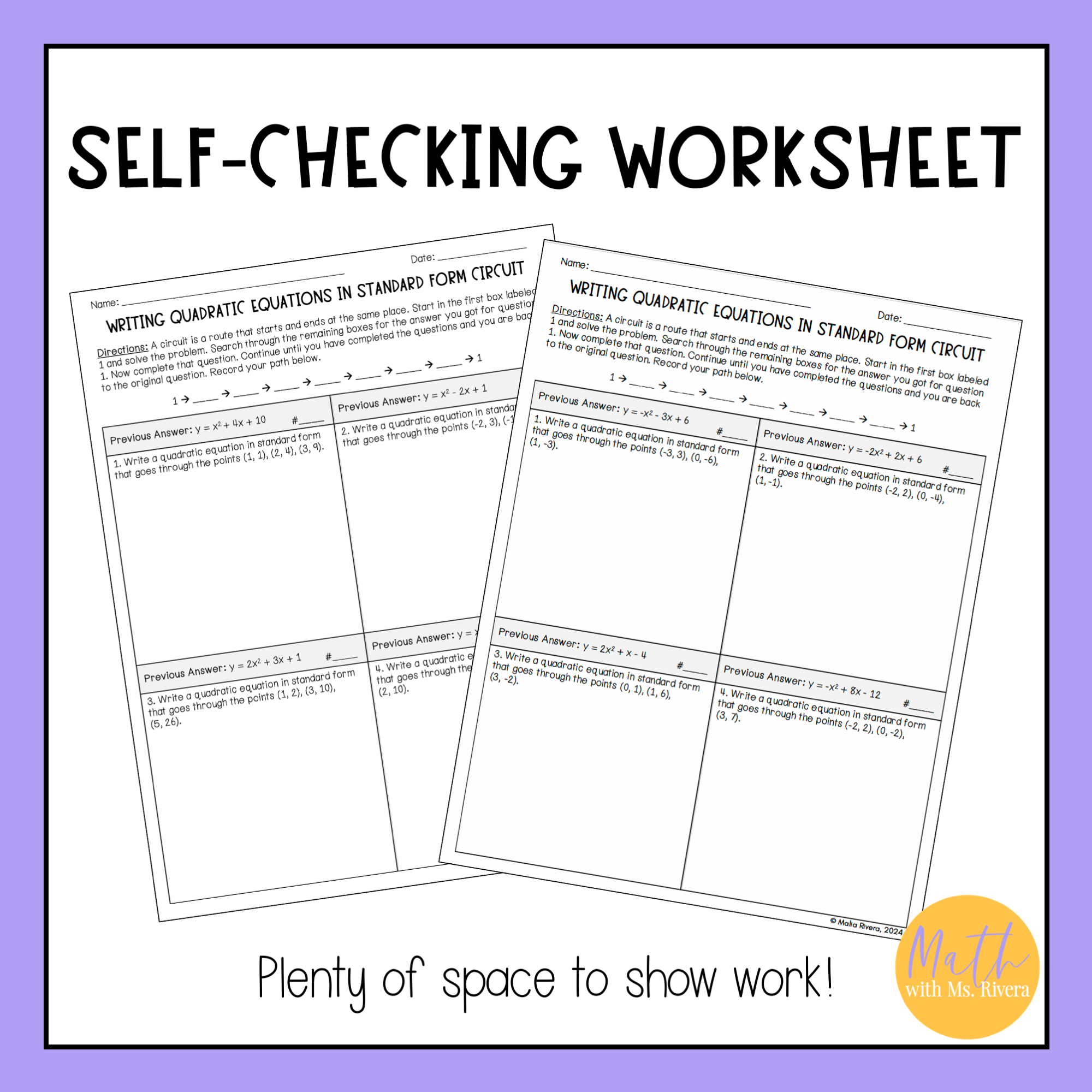 Looking for a worksheet to practice writing quadratic equations in standard form? This self-checking, differentiated circuit worksheet gives students 8 problems to solve using three points to find a, b, and c. The print-and-go format builds accuracy and confidence while helping teachers assess understanding with no prep needed.