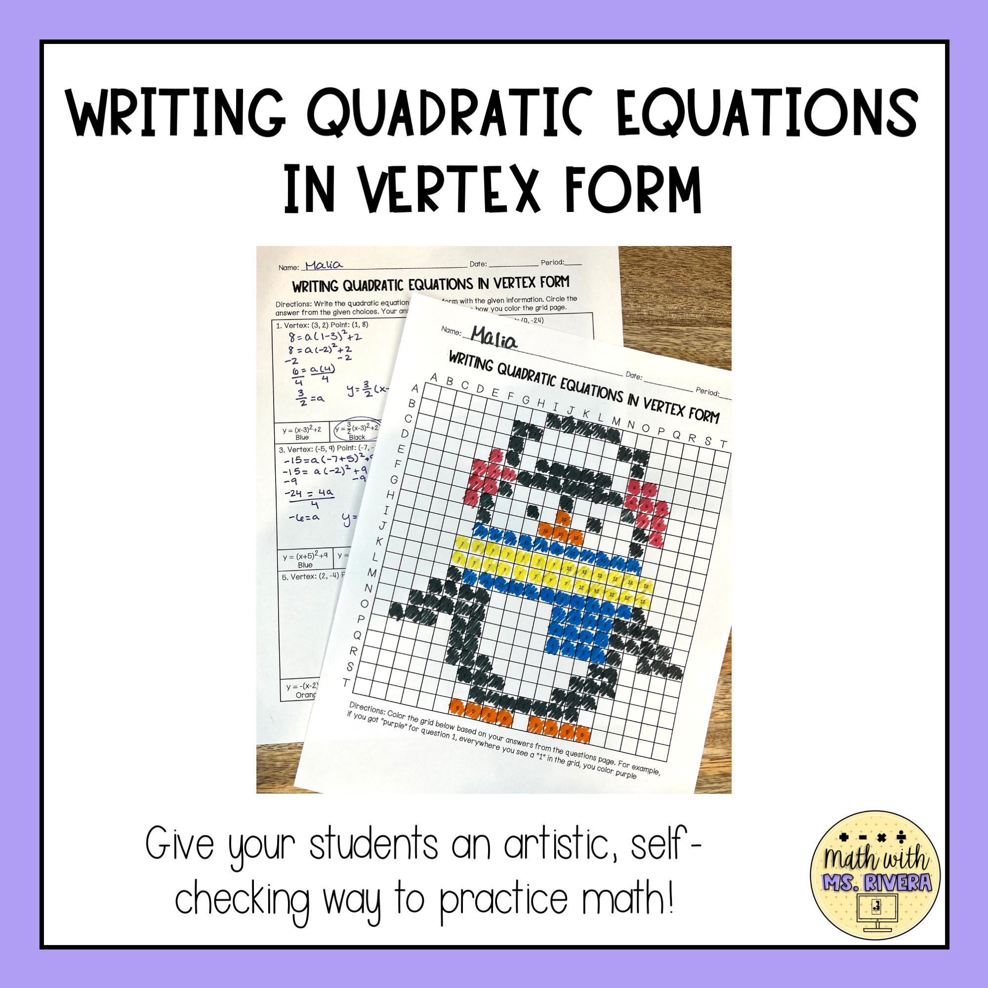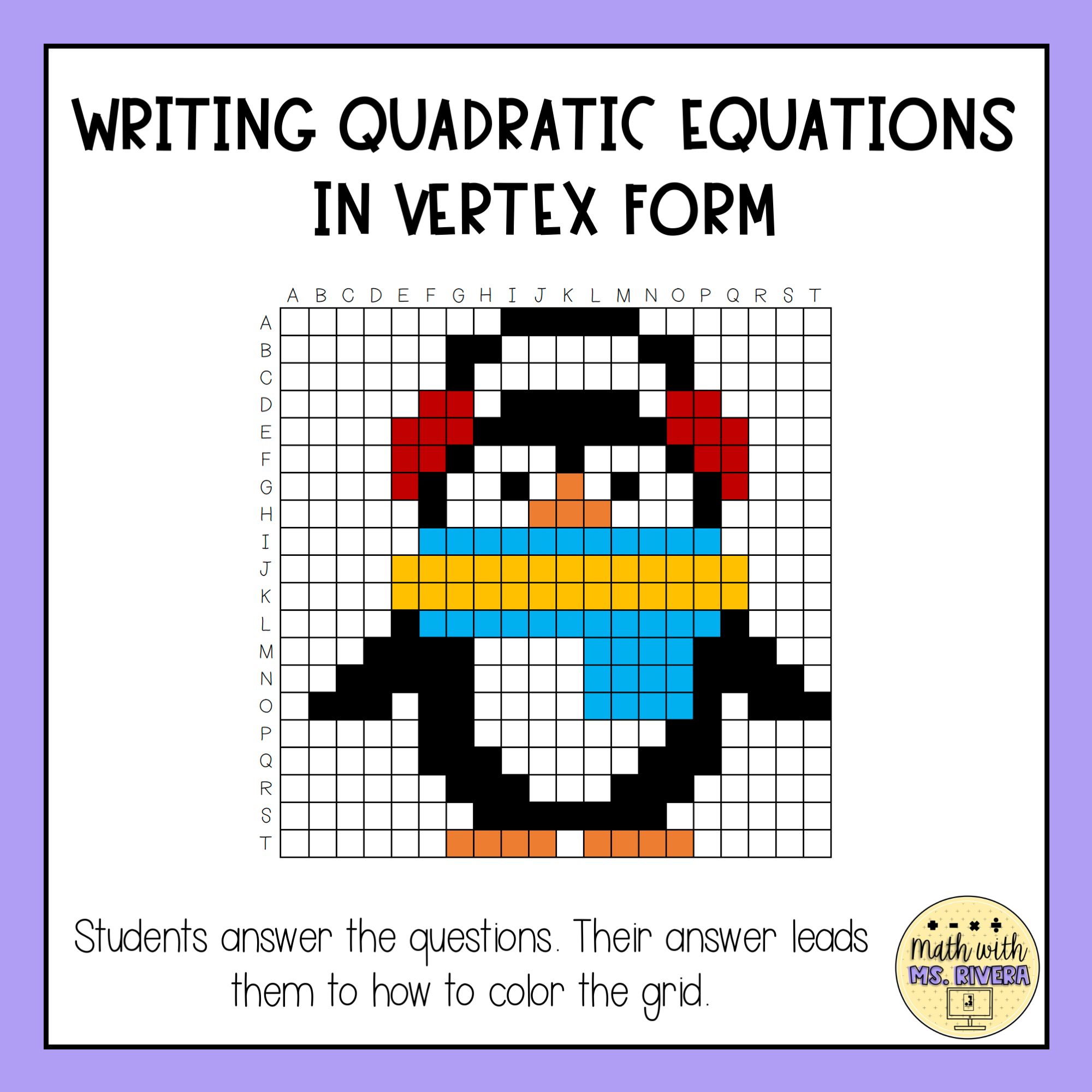 Print both student pages. Students use the given vertex and point to decide which equation is correct and circle their choice. Each answer connects to a color. Students color the pixel grid using the matching numbers. If the colors do not form the picture, they know to check their steps and try again.