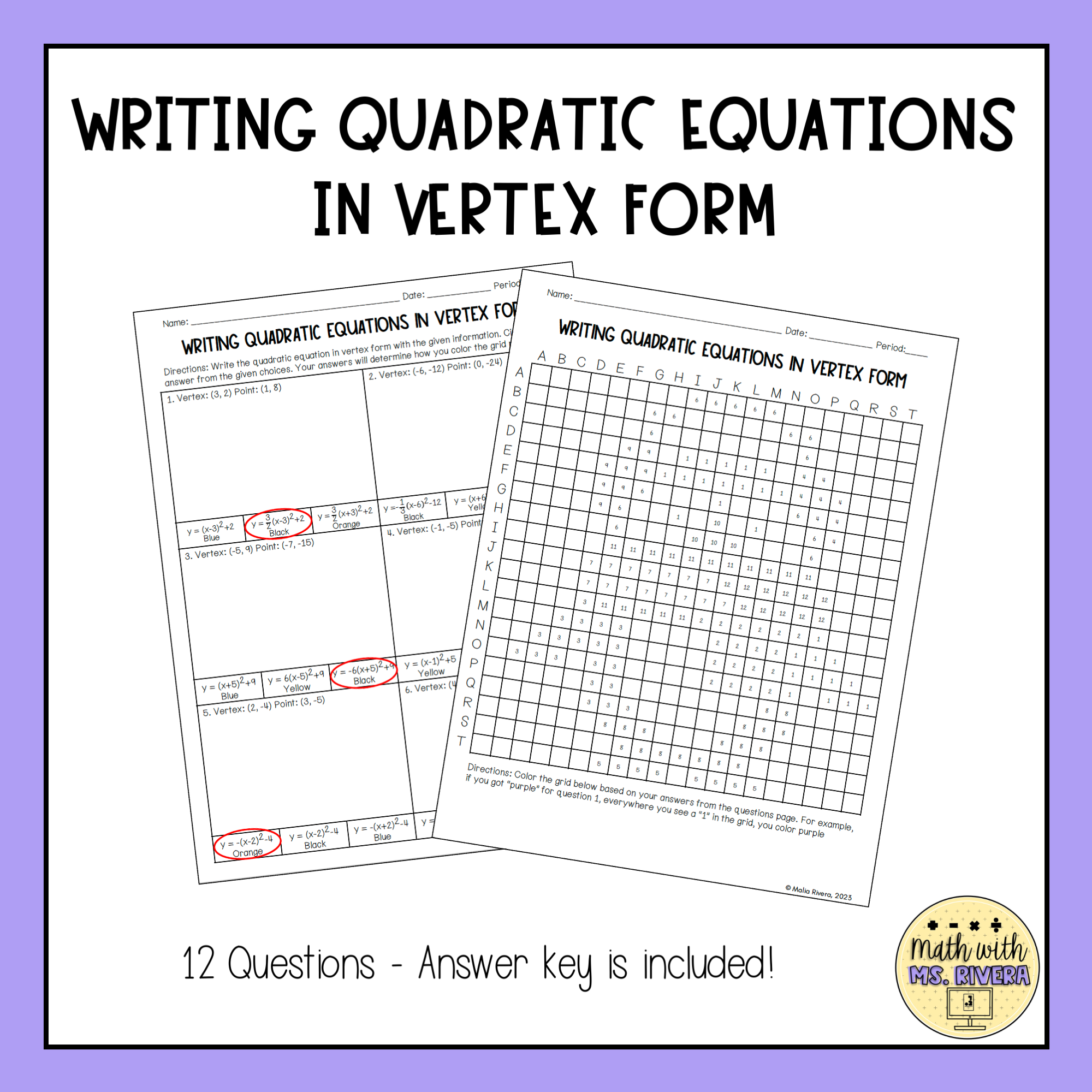Print this worksheet today and give your students a clear, self-checking way to practice writing quadratic equations in vertex form.