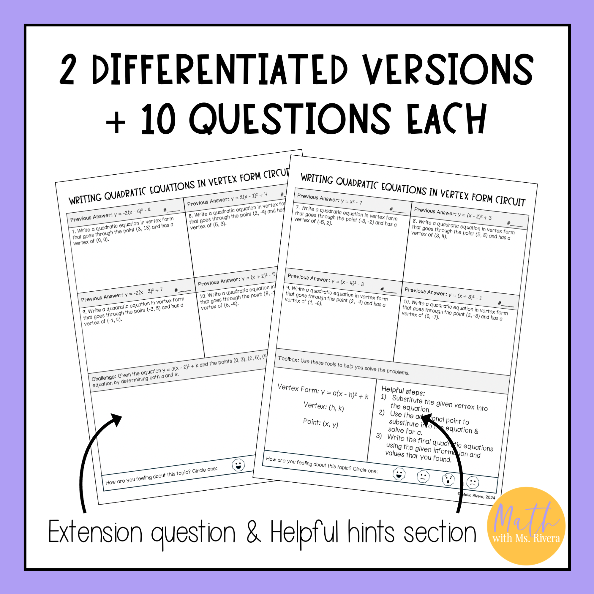 Give your Algebra 2 students targeted practice writing quadratic equations in vertex form with this printable, self-checking circuit worksheet. Students use a vertex and one point to find the “a” value and write a complete quadratic equation. The self-checking circuit format keeps them on task, while two differentiated versions make it easy to support different ability levels within the same class. A full answer key is included for quick checking and grading.